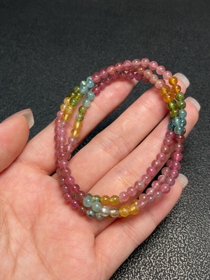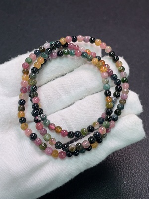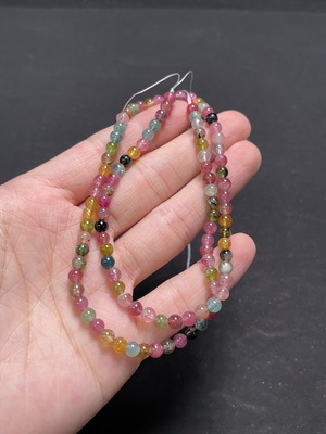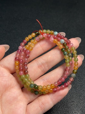 C35121073 Tourmaline bead strand with visible organic matter, only red+green+yellow, possible non-natural accent stones, total weight approx. 14.5g, size approx. 4.4mm (with impurities)