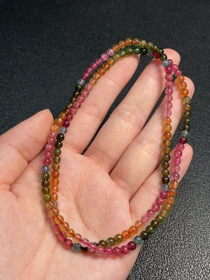 C36272495 Tourmaline bead strand with other mineral components, visible organic matter, non-natural accent stones, total weight approx. 13.63g, size ~3.2mm (including impurities)