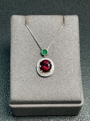C33870345 Garnet Pendant with Clarity-Enhanced Emerald and Diamond Accents in 18K Gold, Total Weight Approx. 5.73g Including Chain