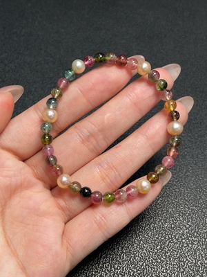 C34041226 Tourmaline Bracelet with Visible Organic Matter, Containing Other Mineral Components, Total Weight Approx. 7.65g, Size About 5.1mm, Paired with Pearls