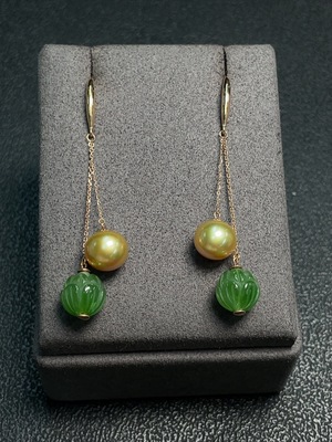C33871986 18K Seawater Pearl Earrings with Hetian Jade, Color Origin Undetermined, Total Weight Approx. 6.1g, Size ~9mm