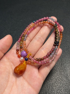 C38543317 Tourmaline bead bracelet with amber, coated with colorless film, visible organic matter, non-natural/non-metal accent stones, total weight approx. 15.51g, bead size ~3.7mm