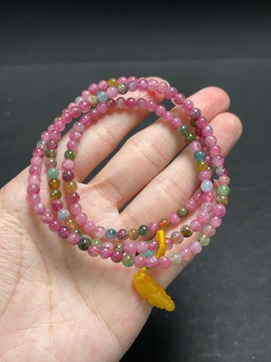 C36238826 Tourmaline bead necklace with amber, containing other mineral components, coated with colorless film, visible organic matter, accent stones may not be natural, total weight approximately 14.2g, bead size about 4mm