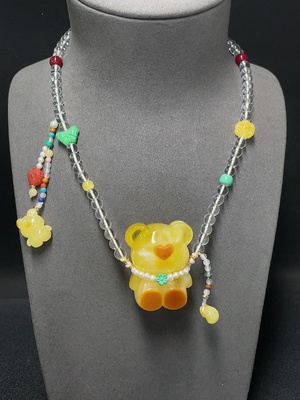 C36229949 Amber Beeswax Pendant with Hetian Jade, Jadeite, Pearl, Tourmaline, Visible Organic Matter, Partial Repair, Non-Gold, Total Weight Approx. 63.9g