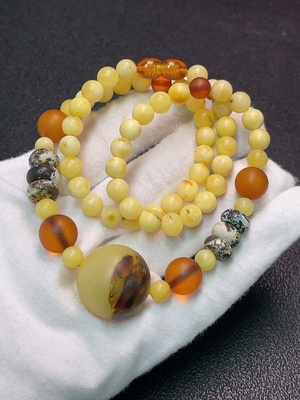 C35184701 Amber and Beeswax Bead Strand with Visible Repairs in Some Areas, Large Accent Stones Possibly Non-Natural, Contains Other Mineral Components, Total Weight Approximately 19.49g, Size About 6.2-10.7mm