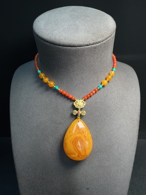 C38486618 Amber beeswax pendant (color origin undetermined) with southern red agate, non-gold, stones may be non-natural, total weight approx. 26.97g including chain