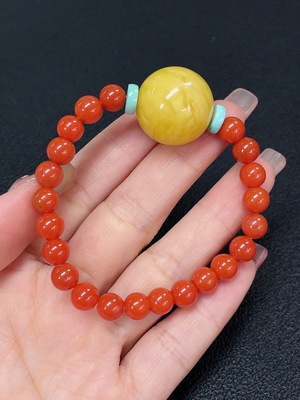 C27156318 Amber Beeswax Bracelet, approx. 13.7mm, total weight approx. 23.28g, with Southern Red Agate and Turquoise as accessory stones