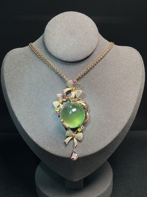 C34991564 Prehnite Pendant 18K Gold with Colorless Diamond Accents and Tourmaline, Accent Stones May Be Non-Natural, Total Weight Approximately 32.65g Including Chain