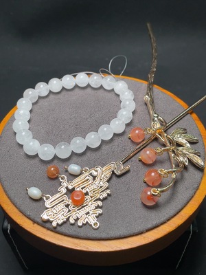 C35201351 Crystal Bracelet + Red Agate Hairpin with Pearl, Non-Gold, Total Weight Approx. 47.3g, Sell as a Lot