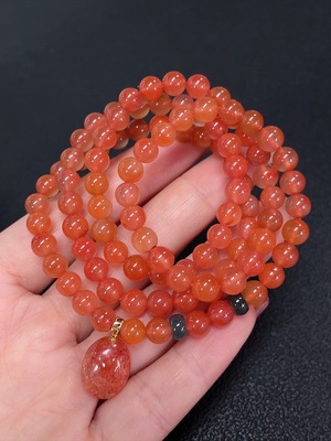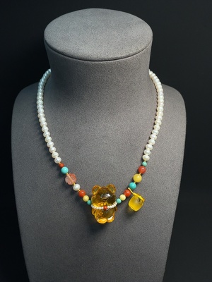 C39613749 Amber Honey Bead Necklace with Small Floral Pendant Coated in Colorless Film, Paired with Pearls and Southern Red Agate (Note: Accent Stones May Not Be Natural), Total Weight Approximately 29.87g