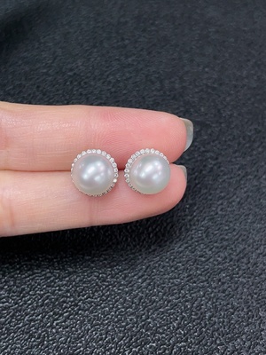 C35093121 18k seawater pearl earrings with undetermined color origin and diamond accents, total weight approximately 3.6g, size about 9.2mm