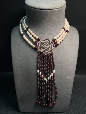 C37379064 Pearl bead necklace with garnet, non-gold, total weight approx. 143.30g, bead size approx. 5.6mm