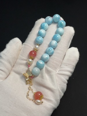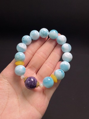 C40680724 Larimar bead bracelet, non-gold inlaid, approx. 6.6mm bead size, total weight approx. 11.02g, visible organic matter, non-natural accent stones considered