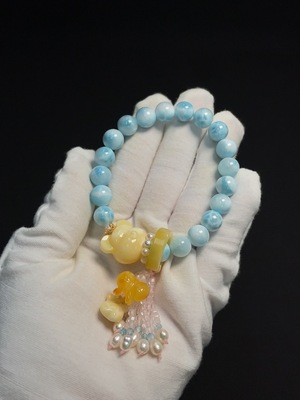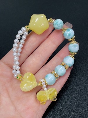 C39660415 Amber Beeswax Bracelet with Pearl, Crystal, Larimar, Colorless Film Coating, Non-Natural Stones Considered, Total Weight Approx. 12g, Size 18.3mm
