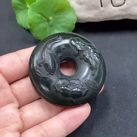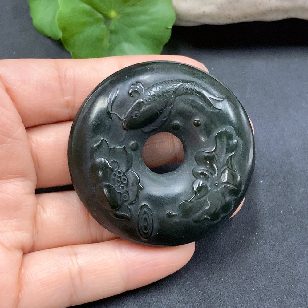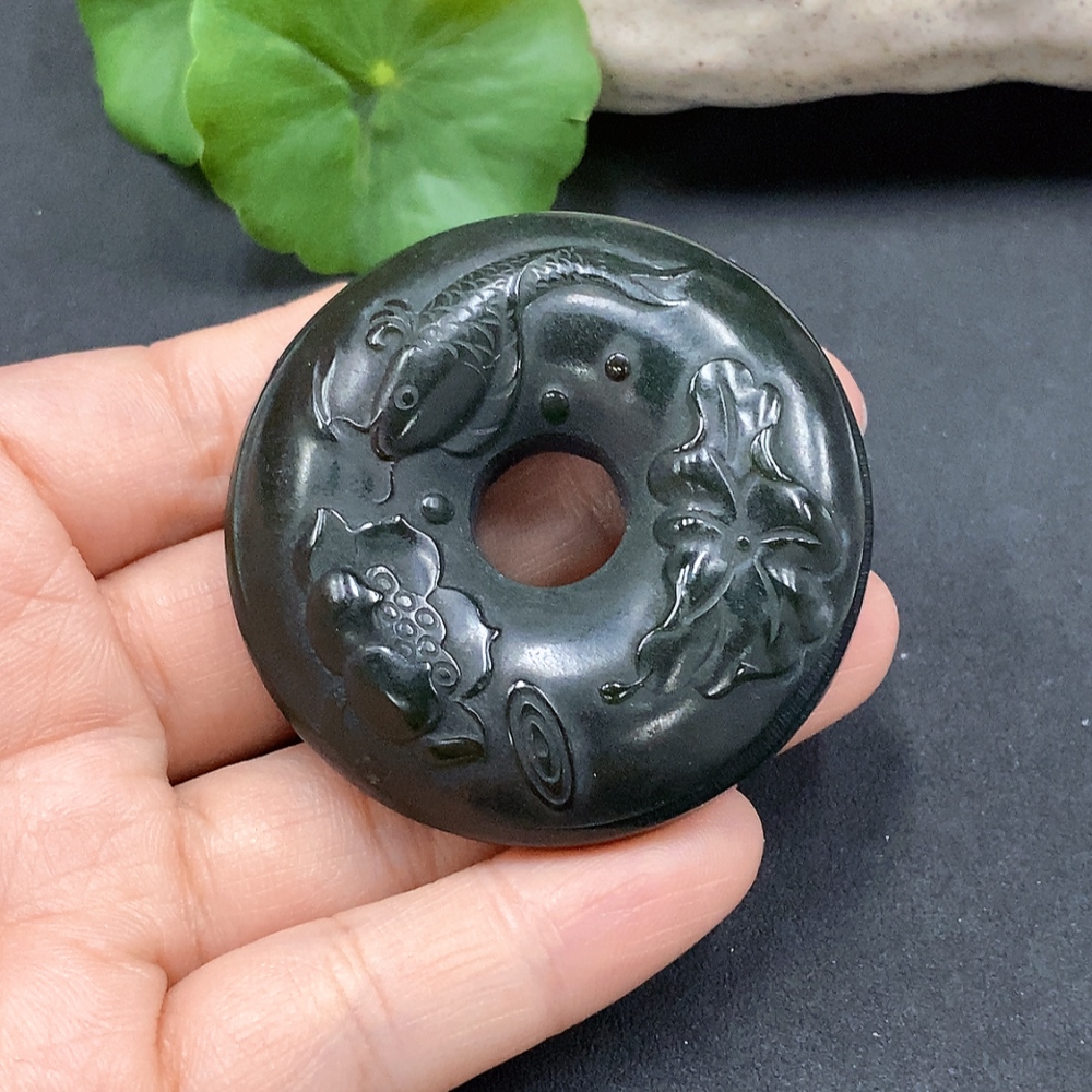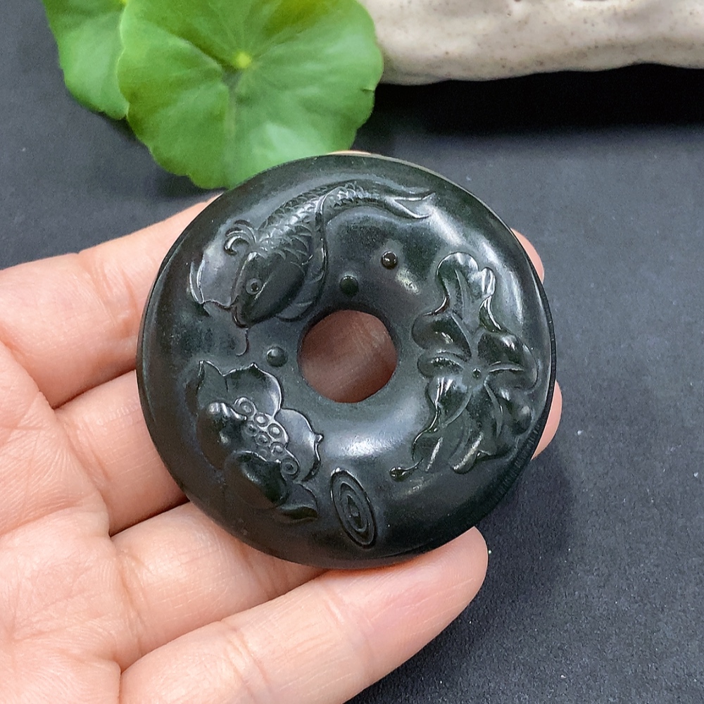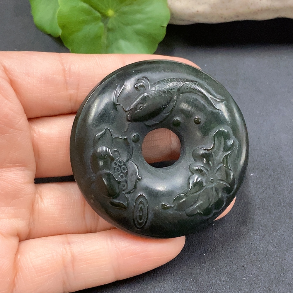 Hetian Jade Lotus Leaf and Fish Button, Total Weight Approx. 62.27g