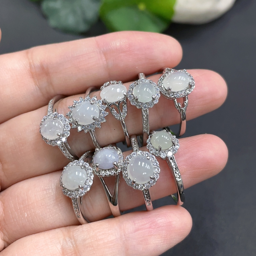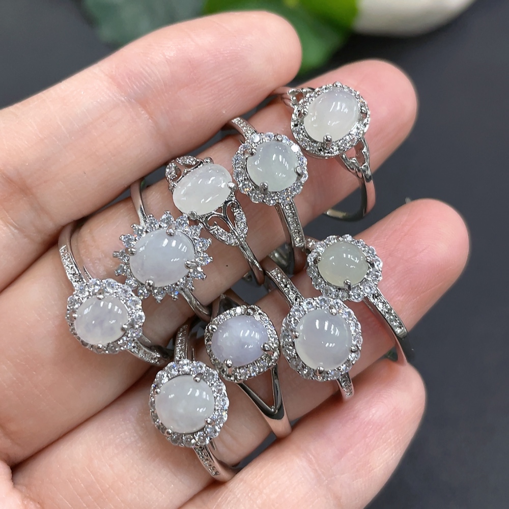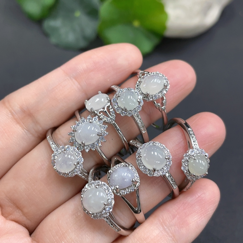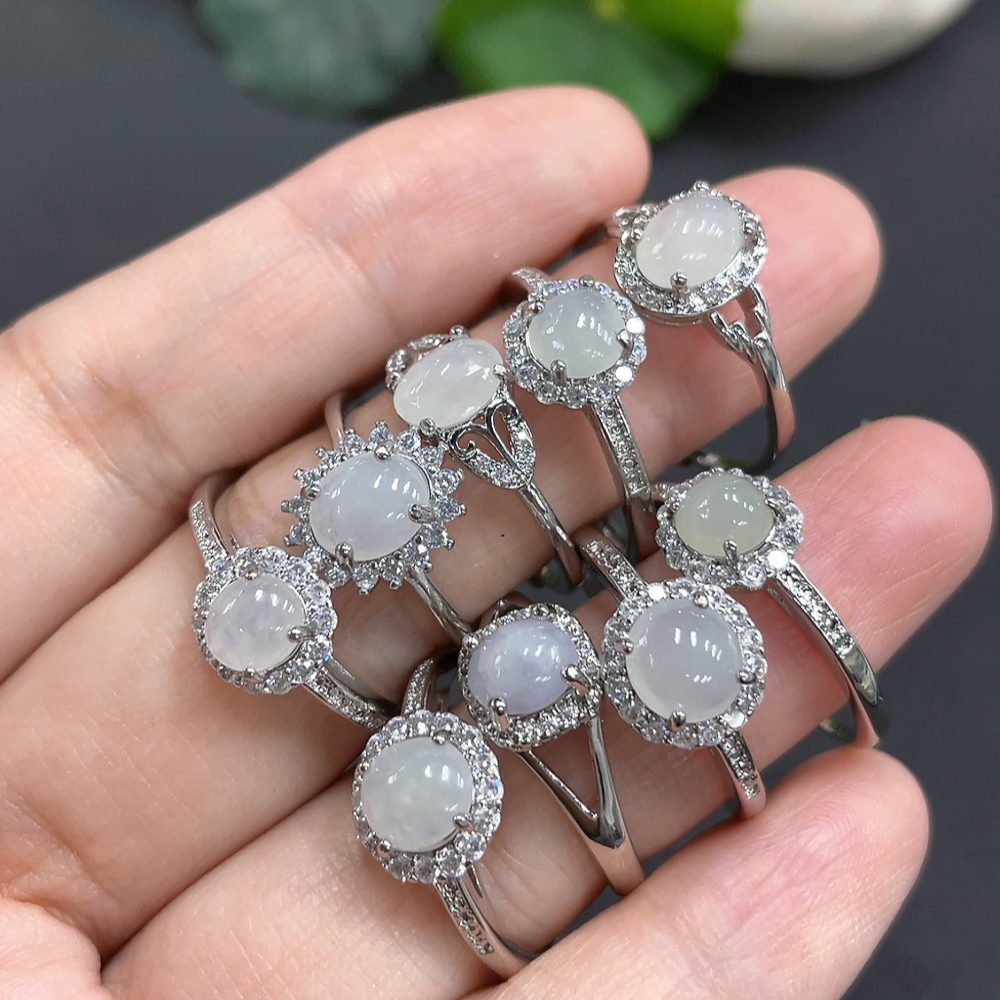 Jadeite cabochon inlaid ring set with adjustable shank, non-gold setting