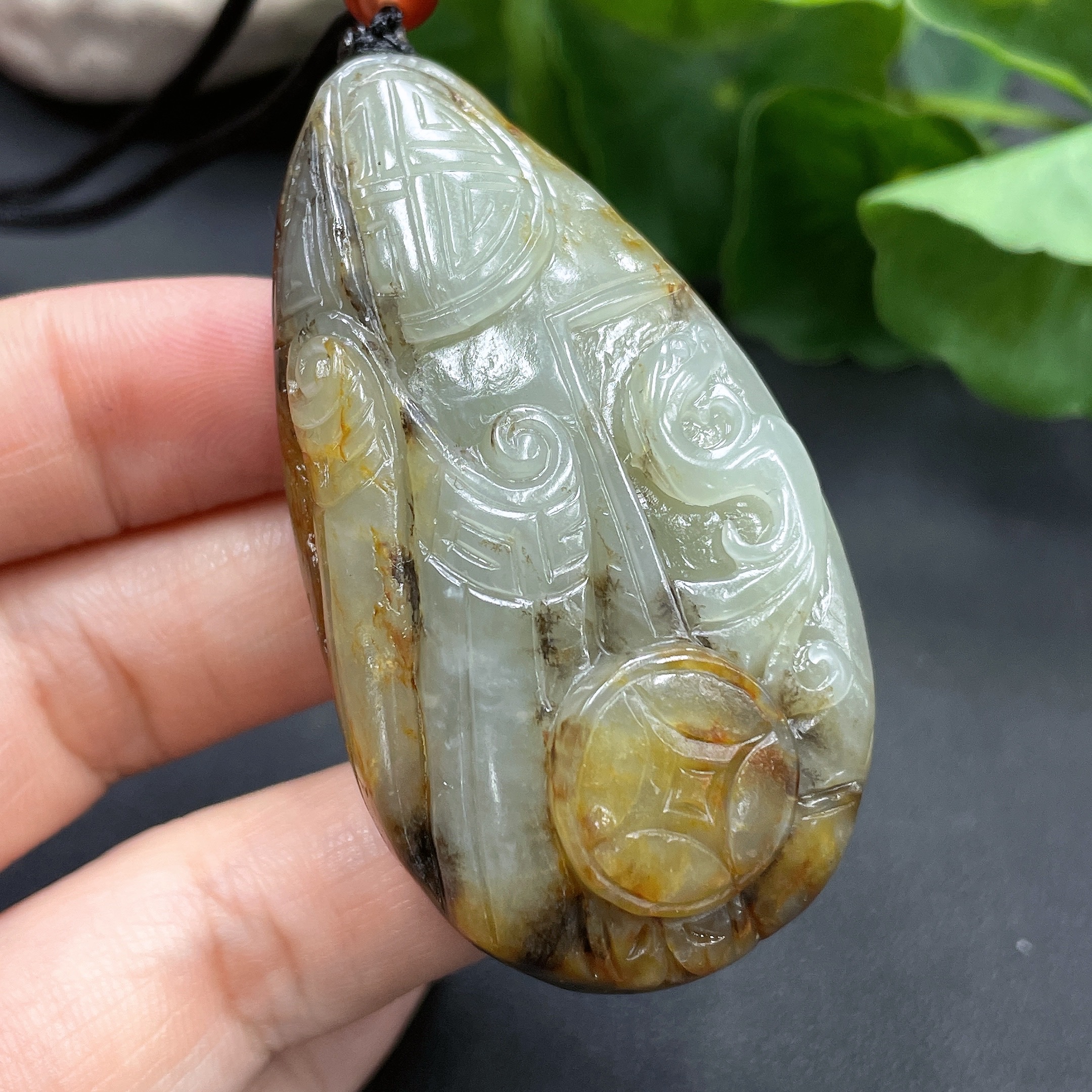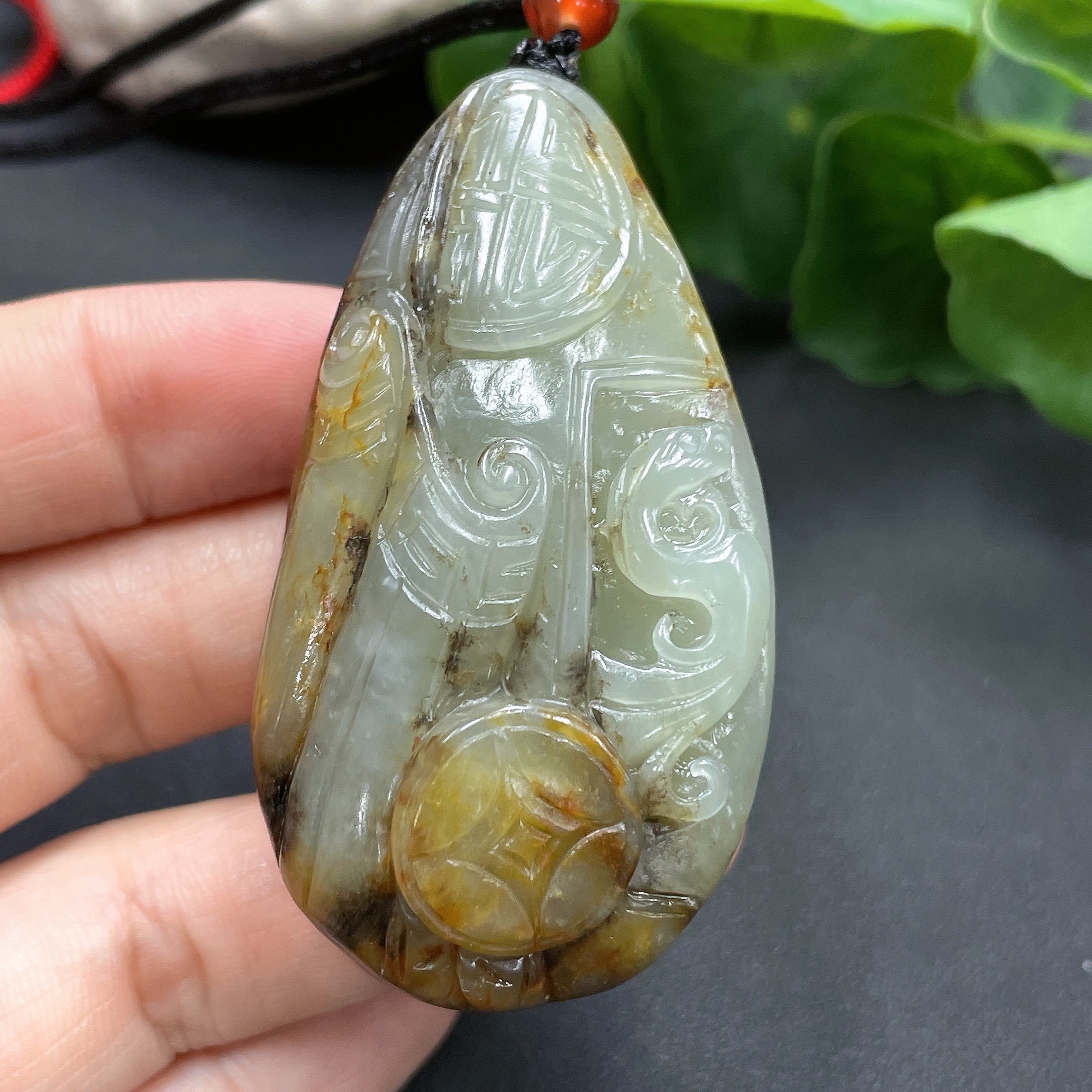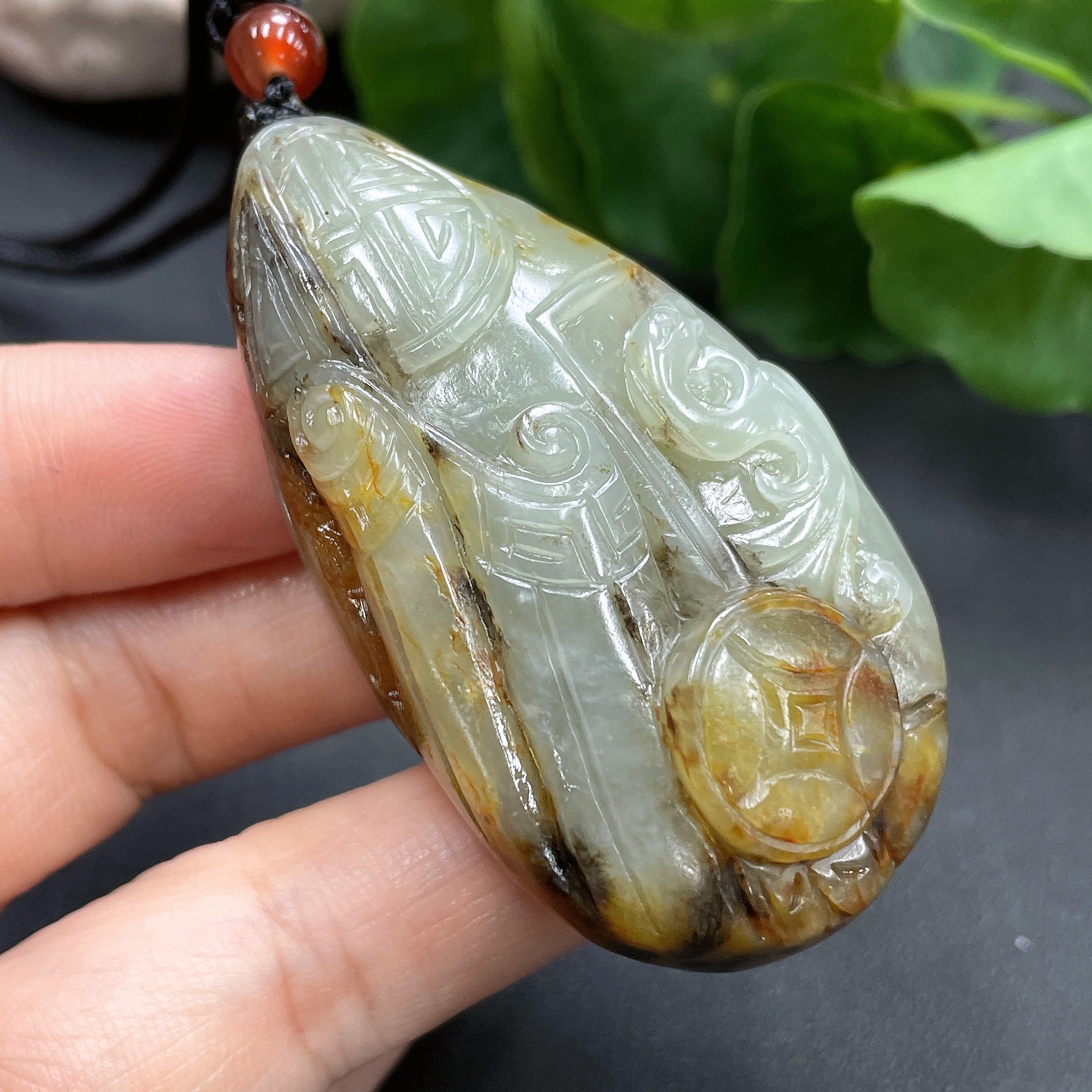 Hetian Jade Pendant, Antique-style Piece, Undetermined Skin Color Origin, Total Weight Approximately (Including Rope) 56.5g