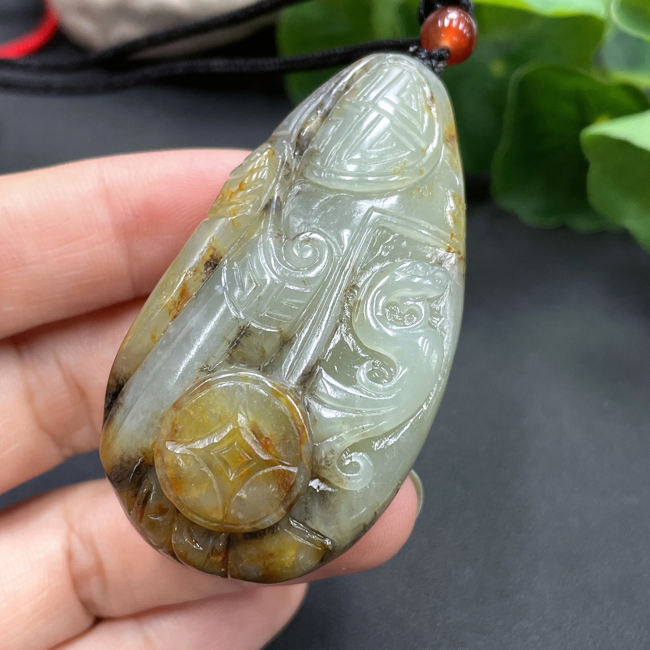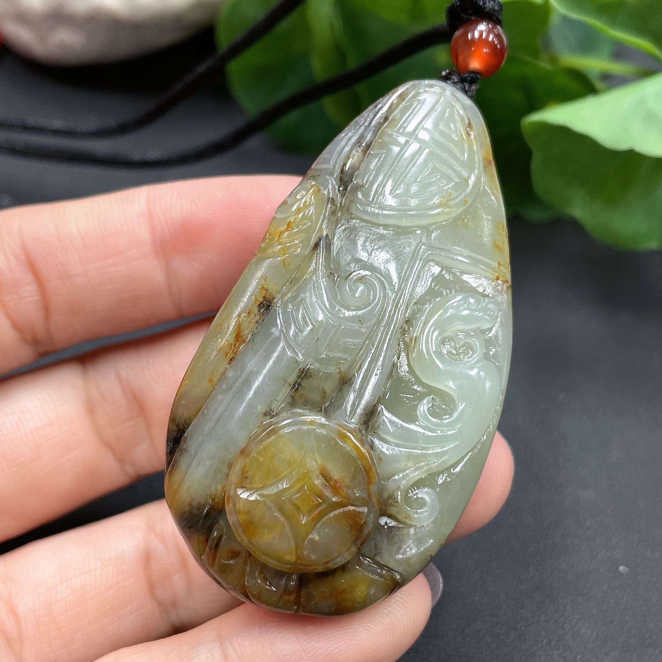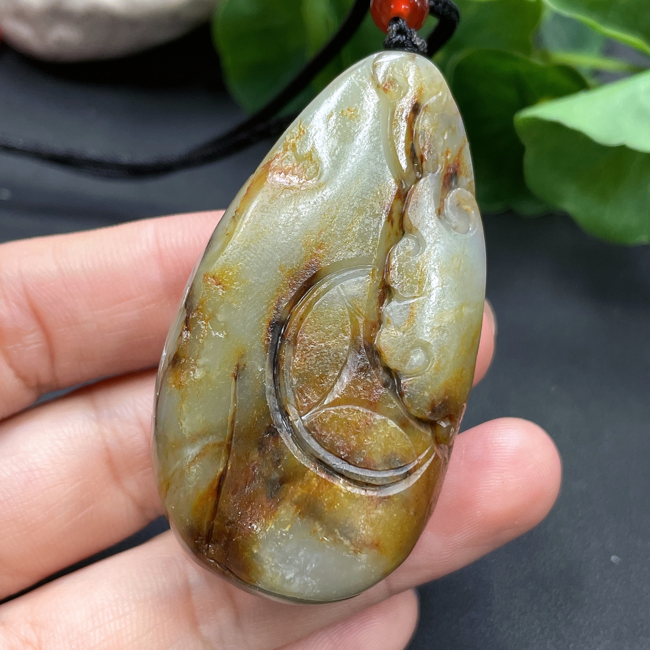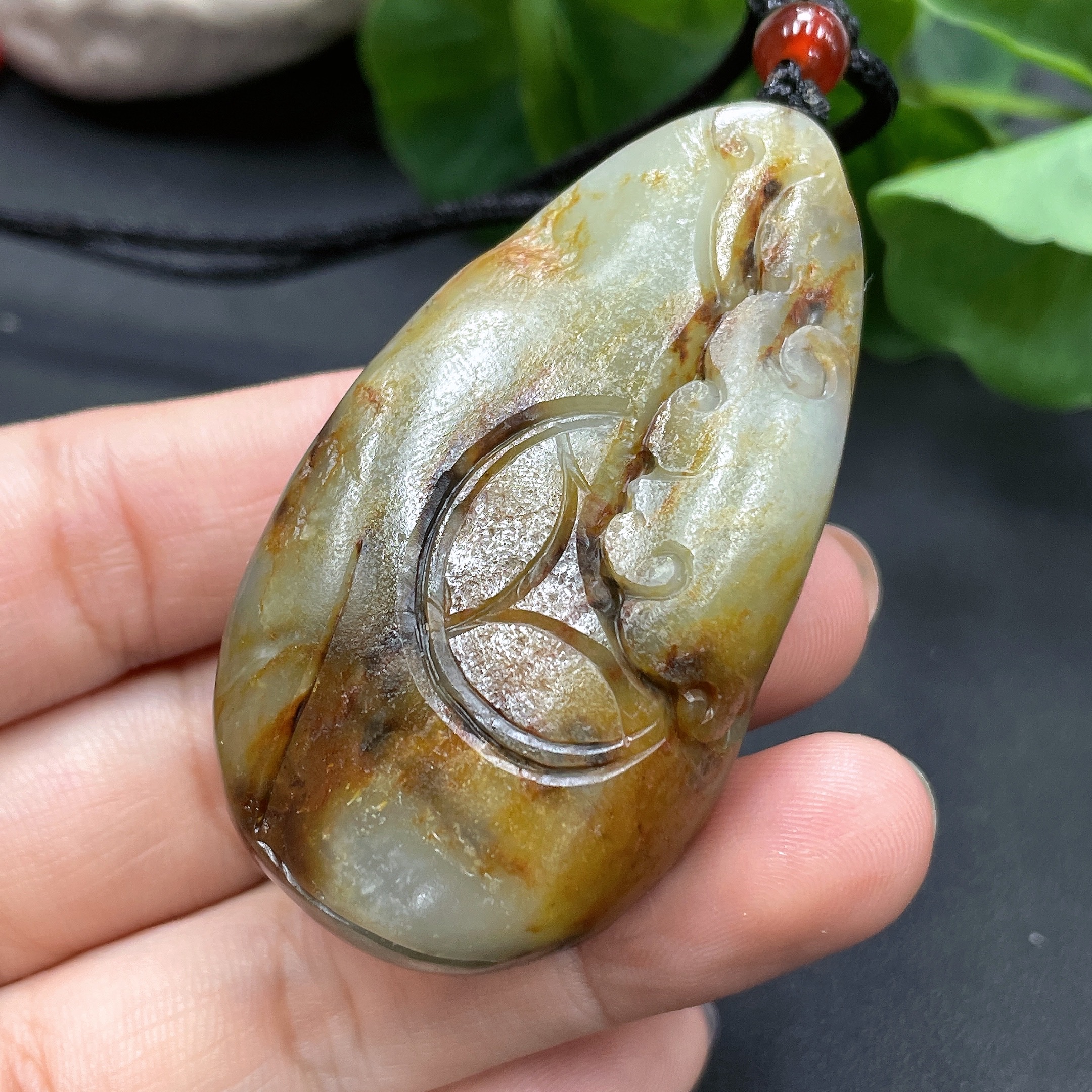 Hetian Jade Pendant, Antique-style Piece, Undetermined Skin Color Origin, Total Weight Approximately (Including Rope) 56.5g