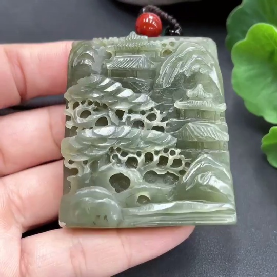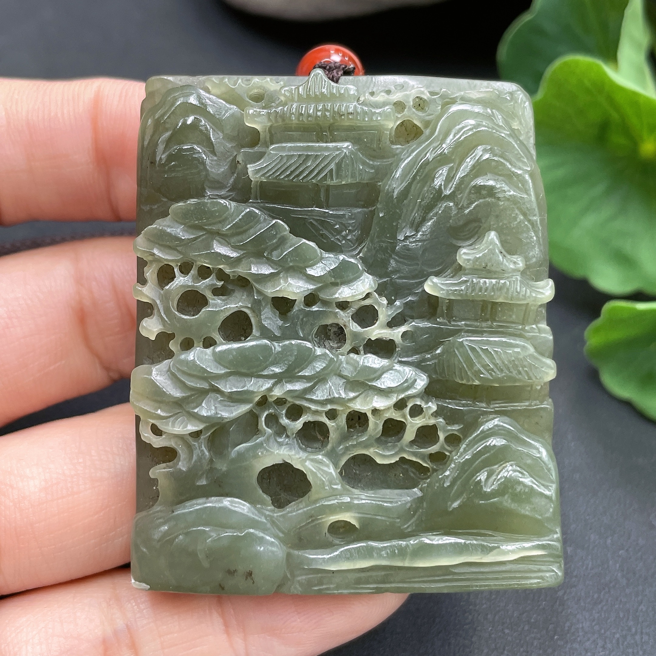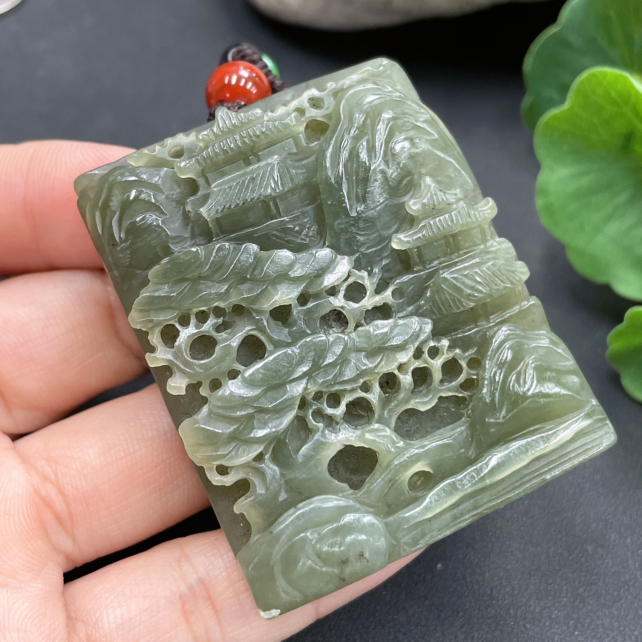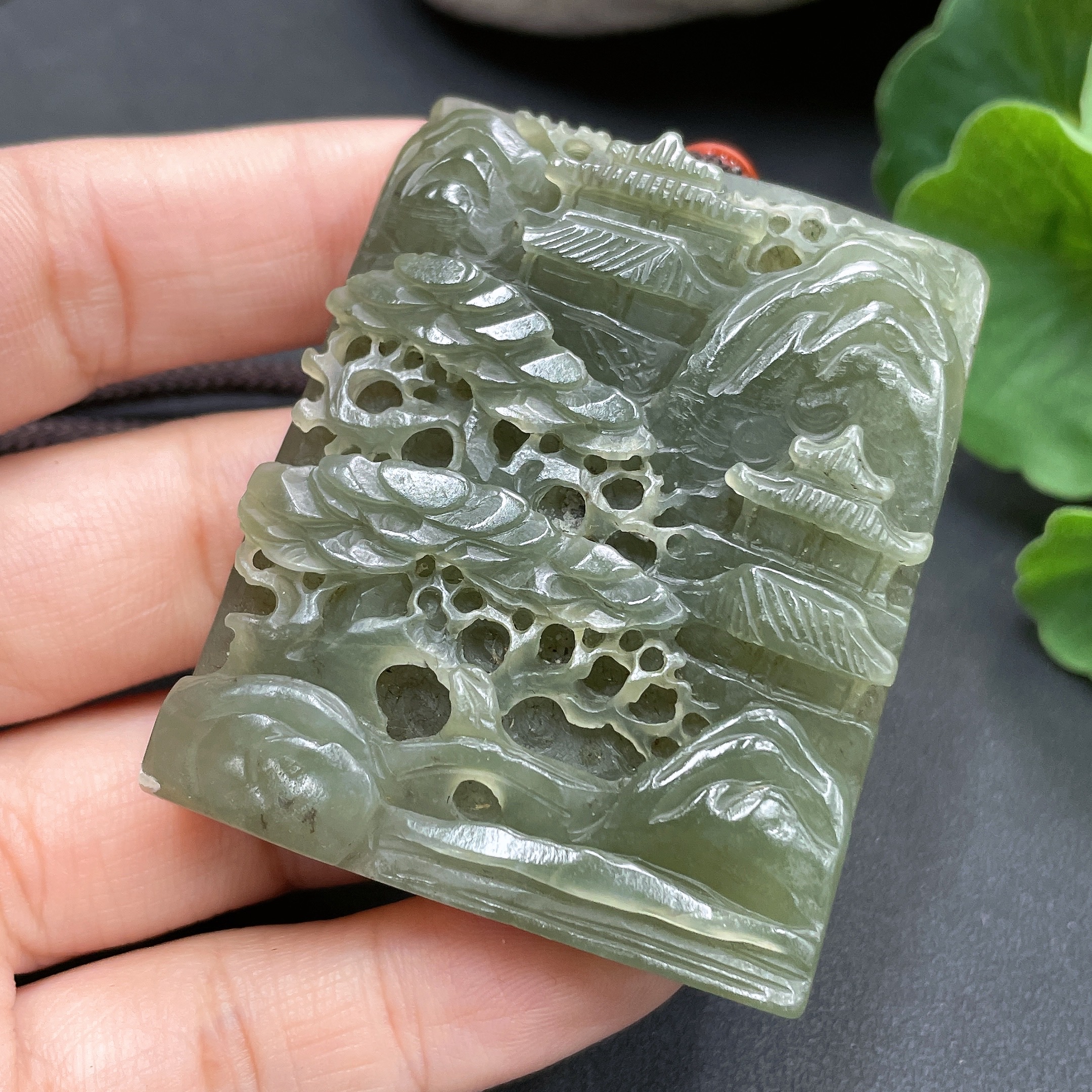 Hetian Jade Pendant, Landscape Plaque, Total Weight Approx. (Including Cord) 64g