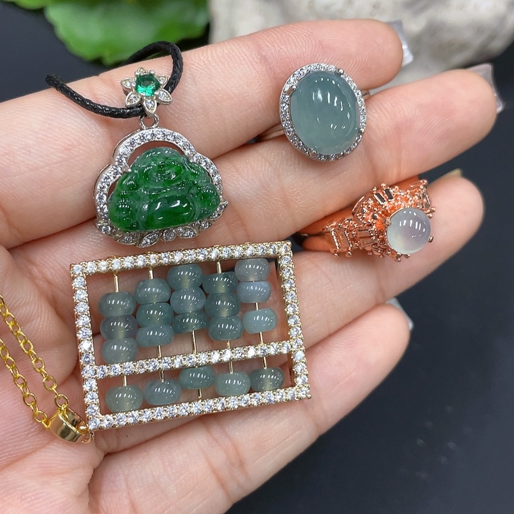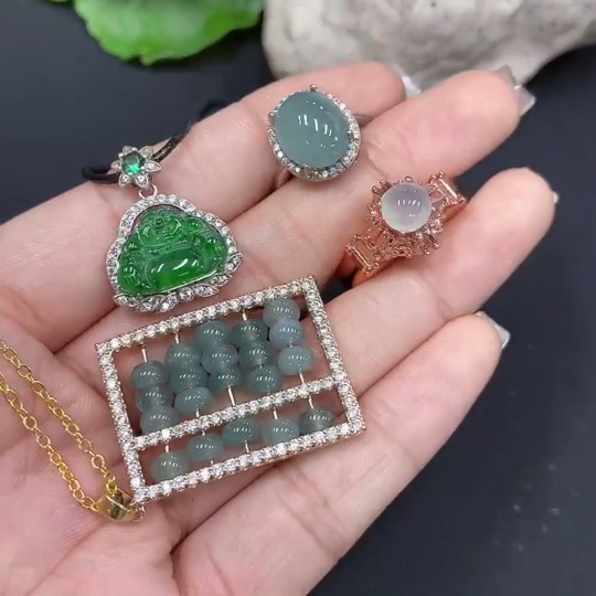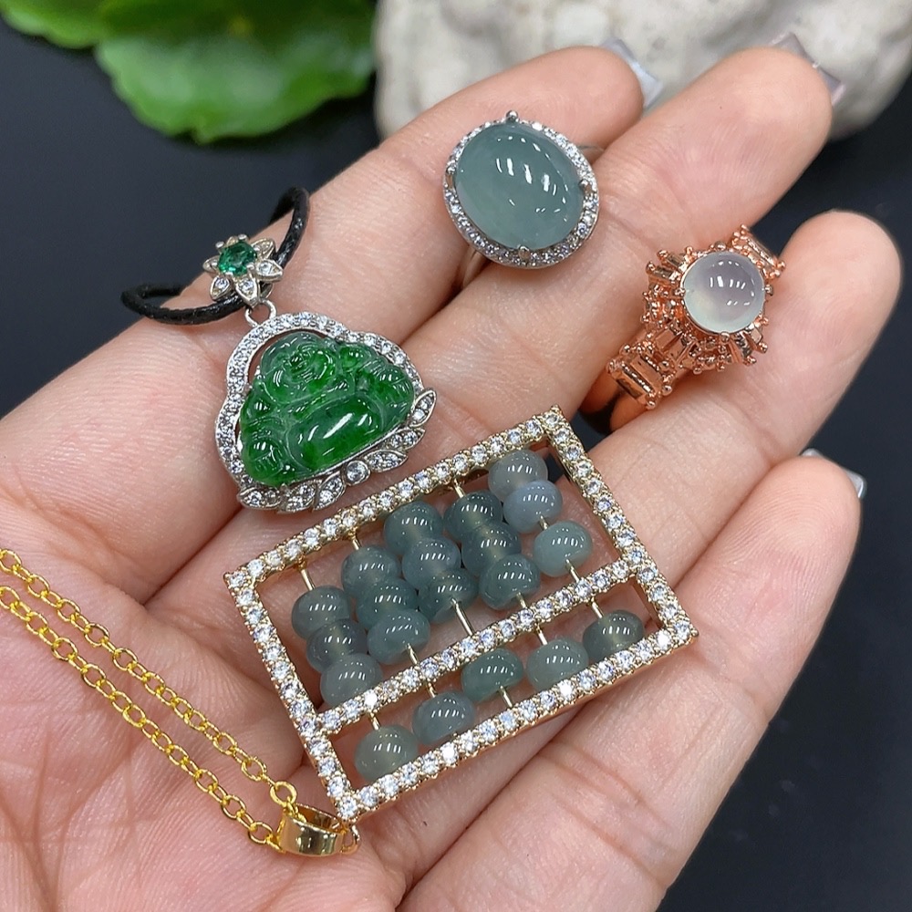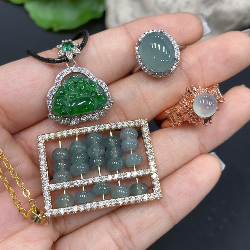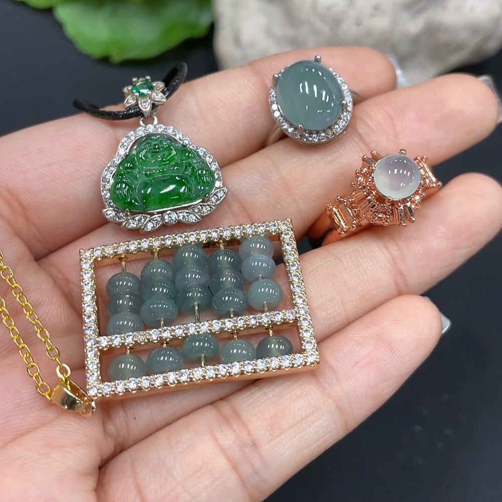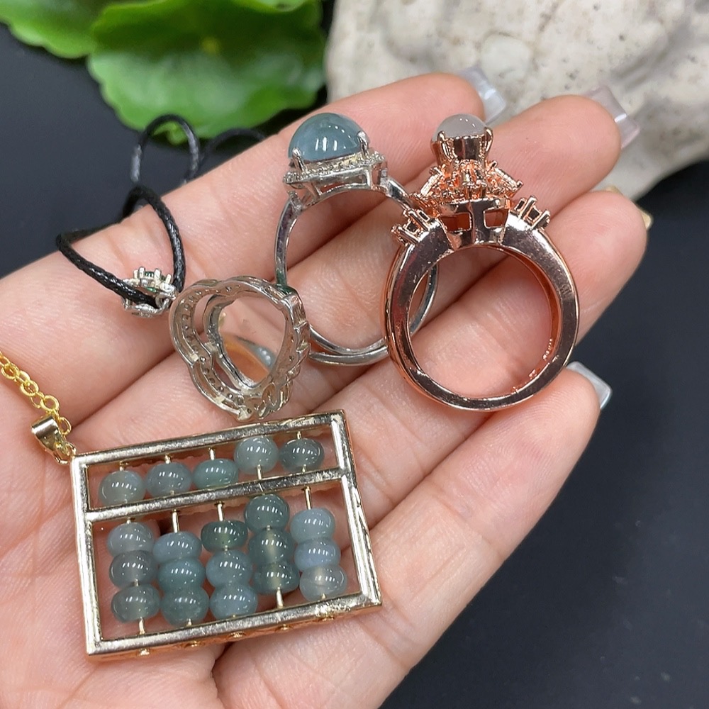 Jadeite inlaid pendant + ring, non-gold inlaid, adjustable size