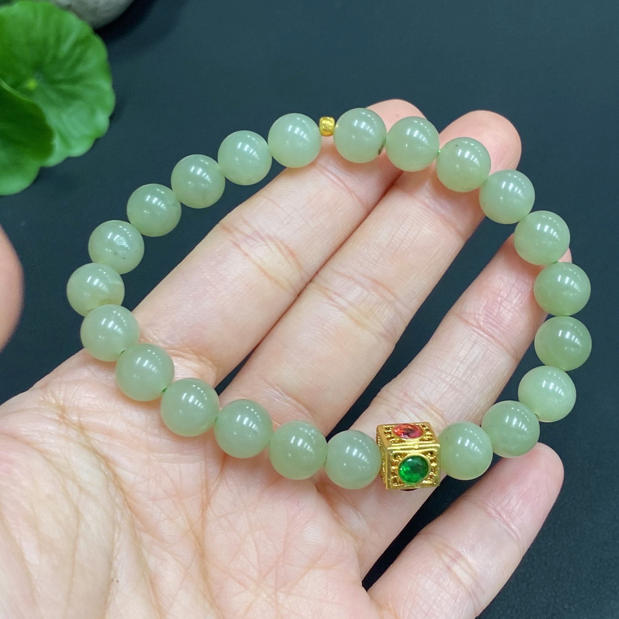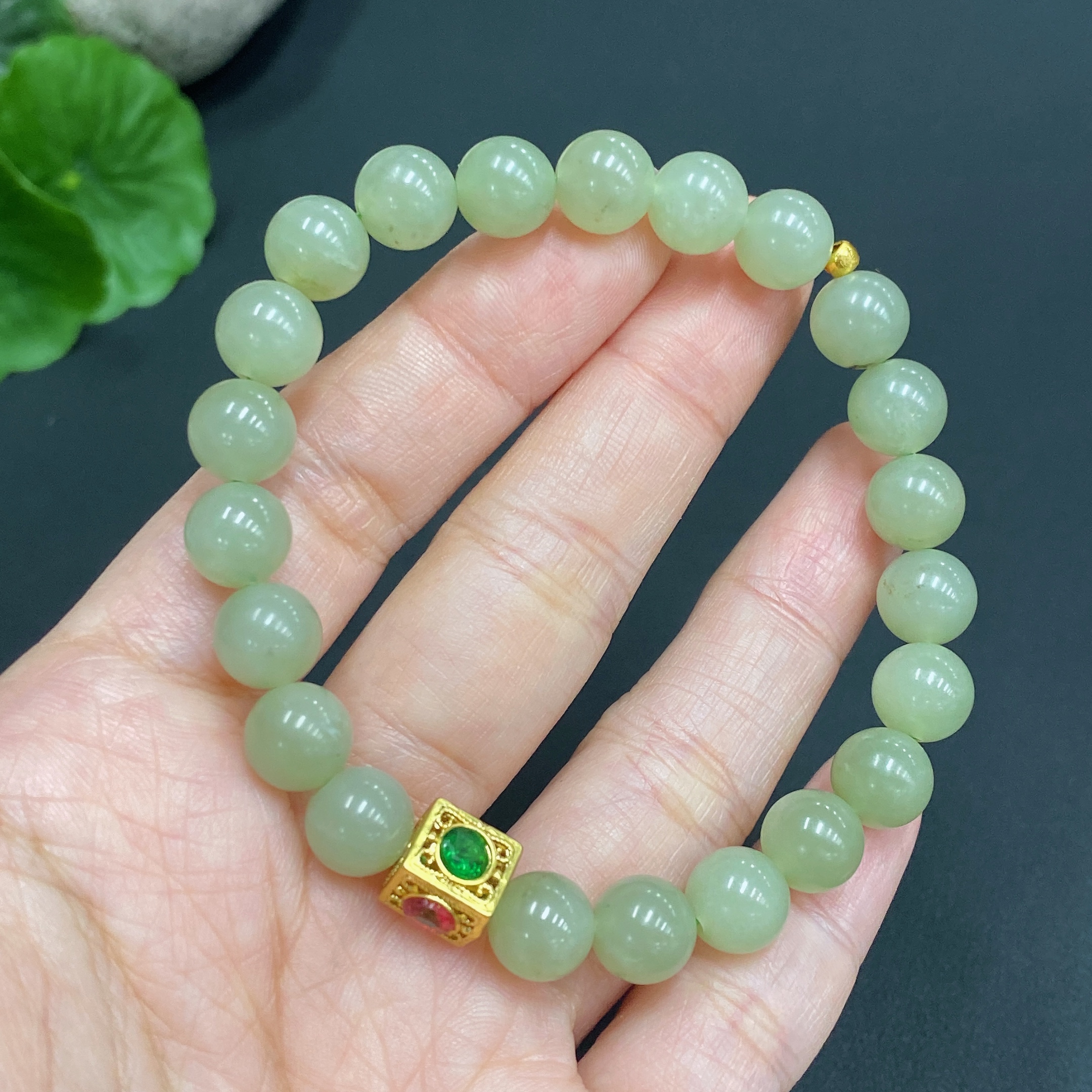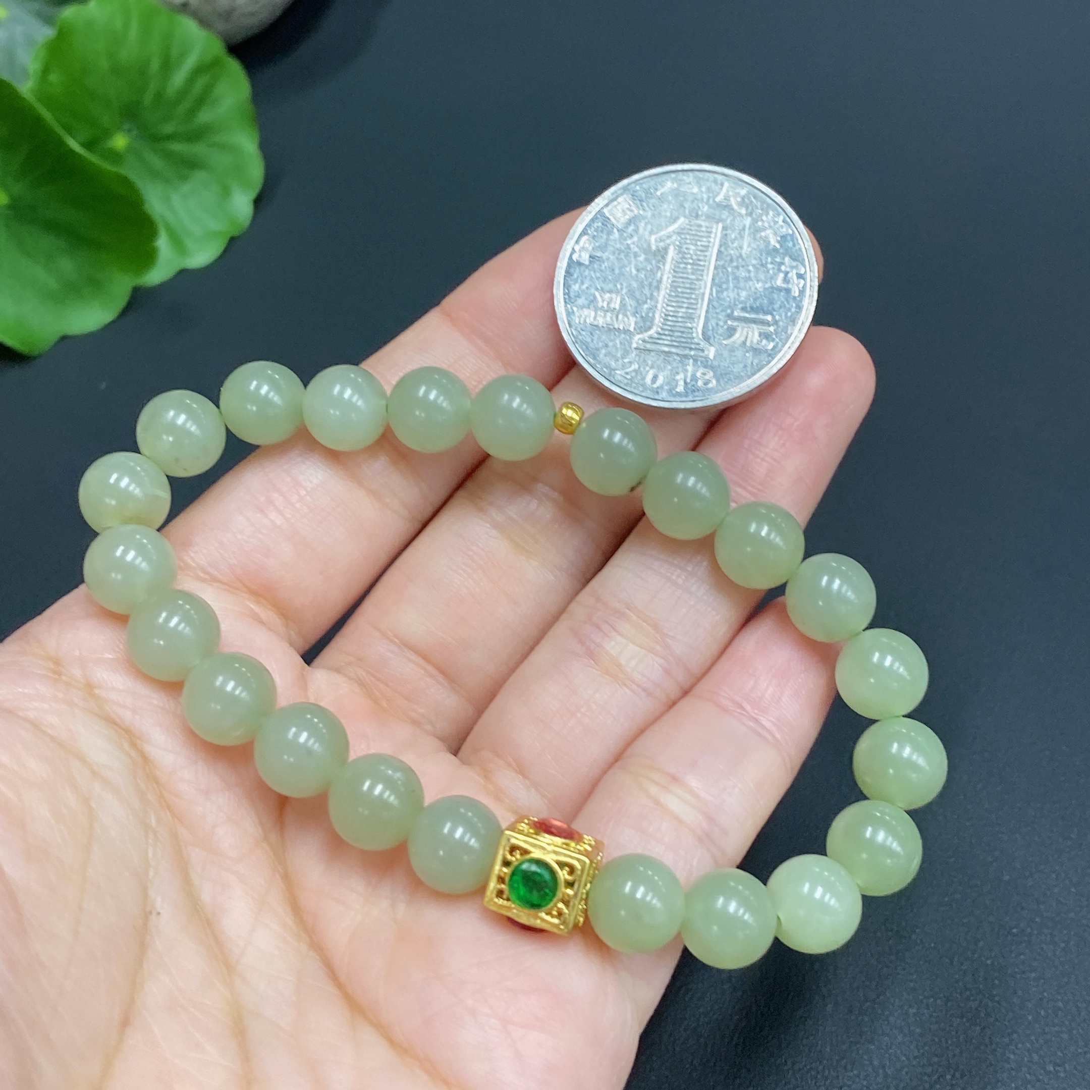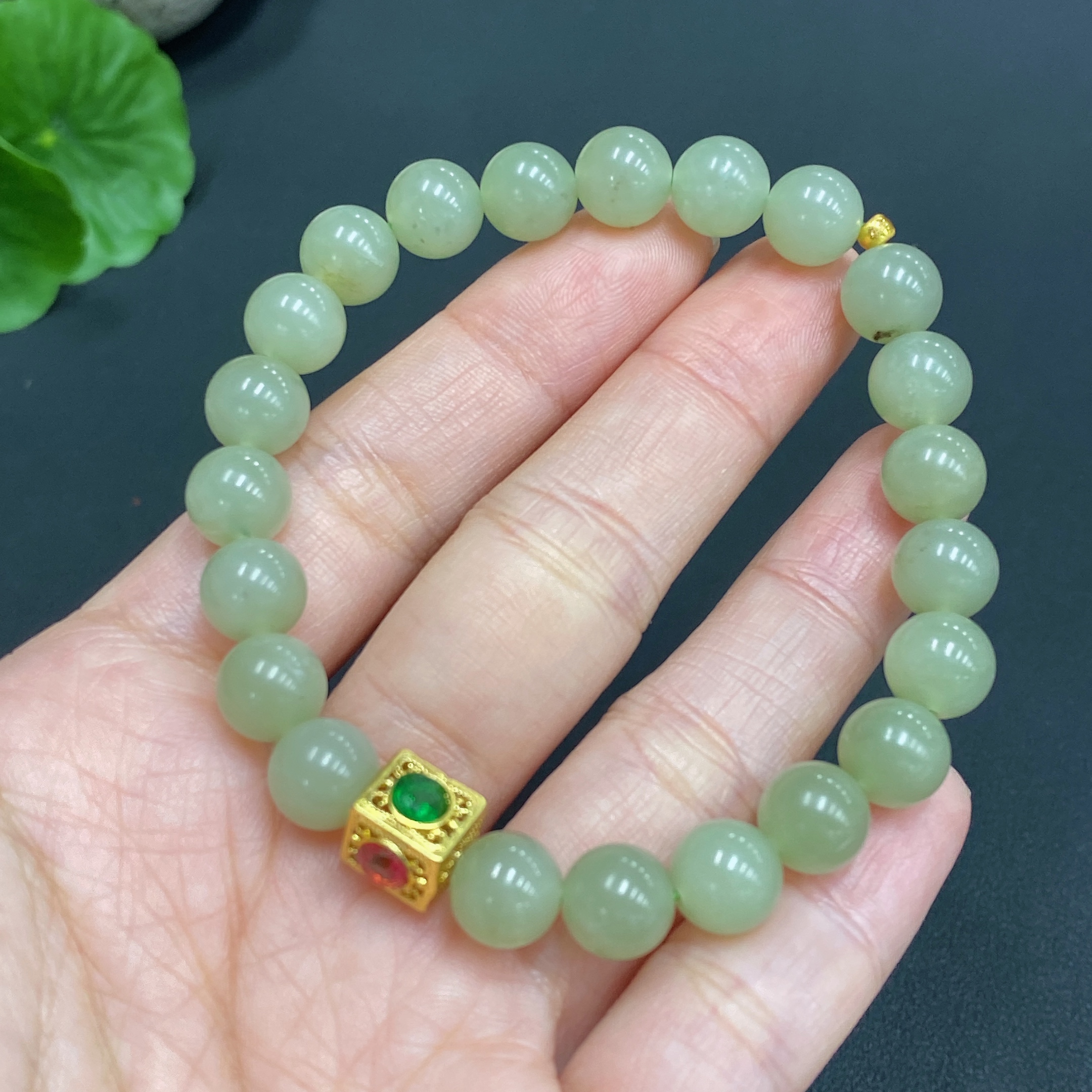 Hetian Jade Bracelet, Approx. 7.5mm Beads, Small 99% Gold Beads, Non-Gold for the Rest, Total Weight Approx. 18.5g