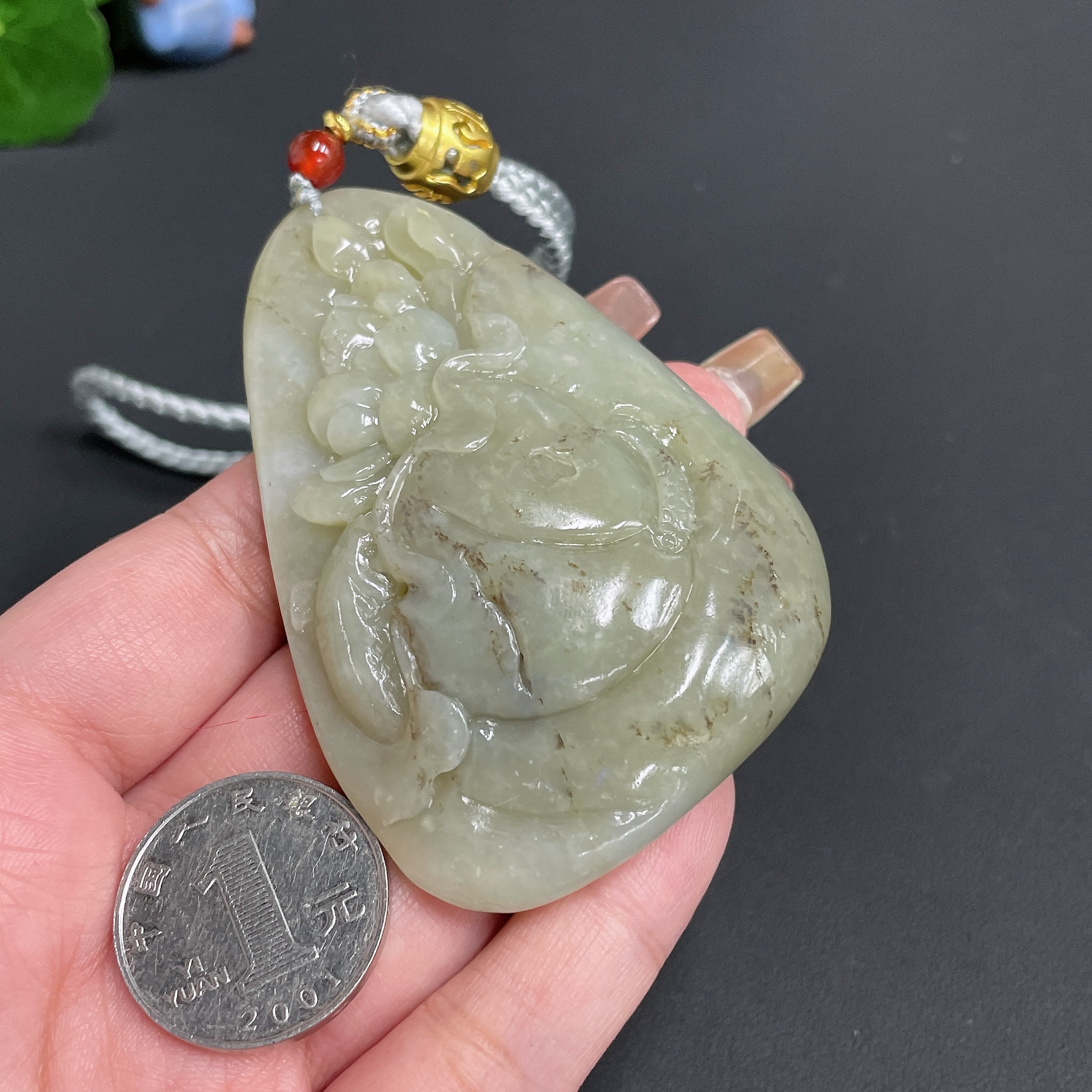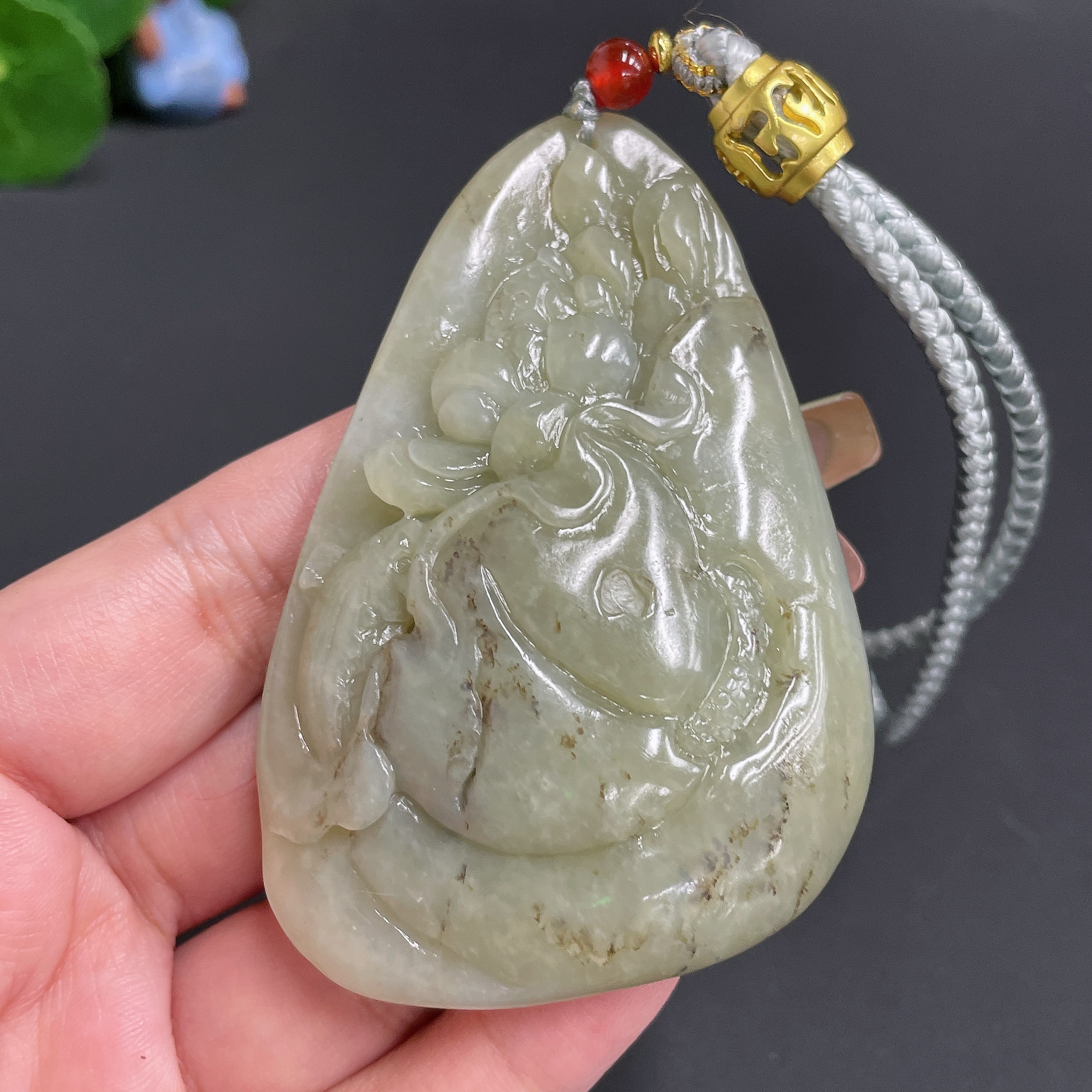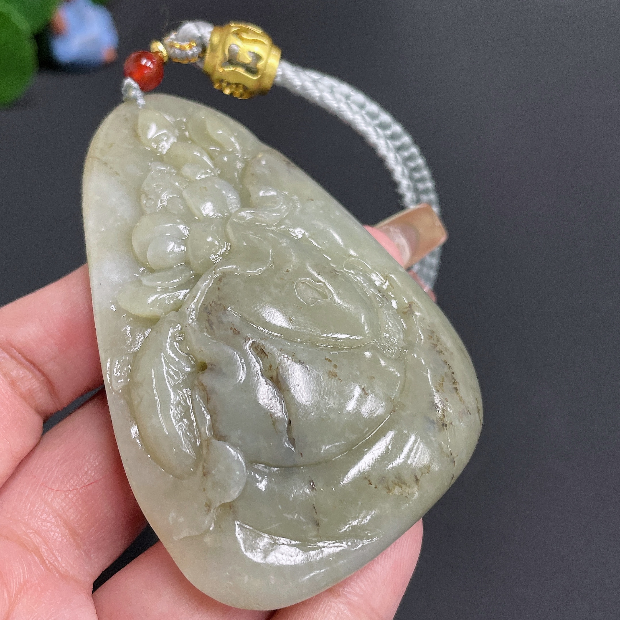 Hetian Jade Handheld Piece 'Abundance Year after Year' with Cord, Total Weight 91.36g