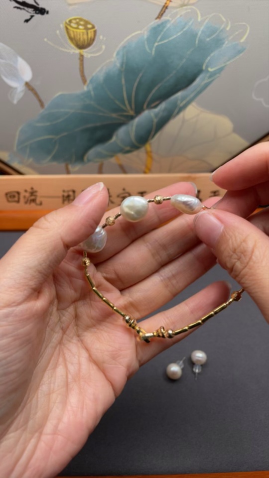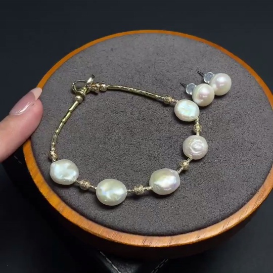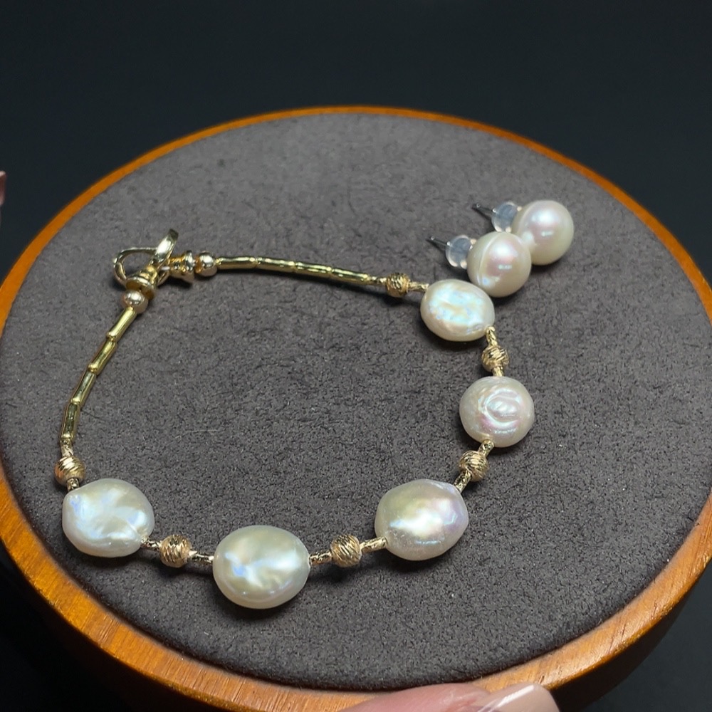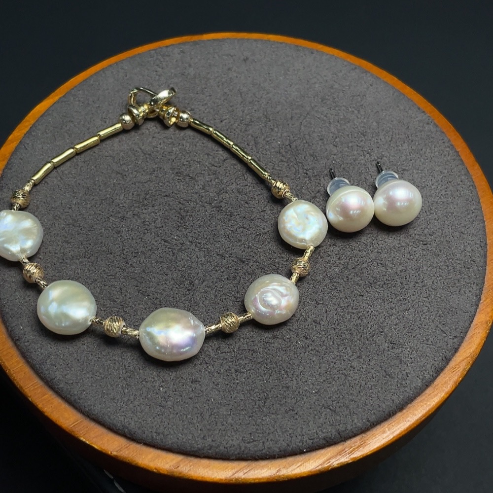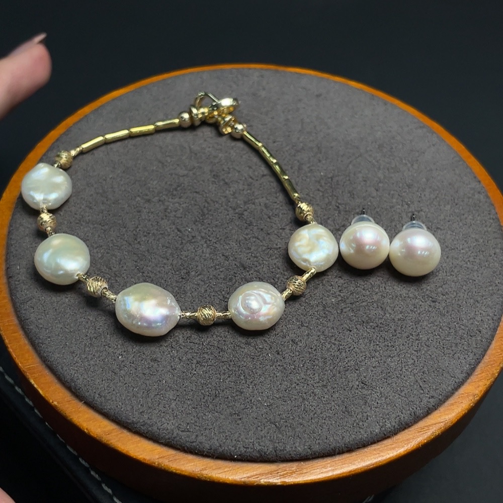 Pearl Inlaid Earrings + Bracelet Non-Gold Setting Total Weight Approx. 13.02g
