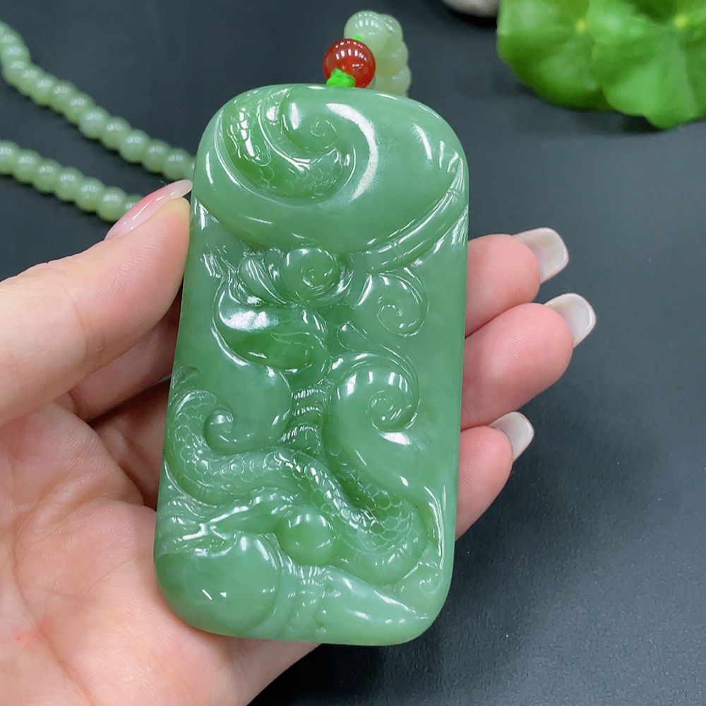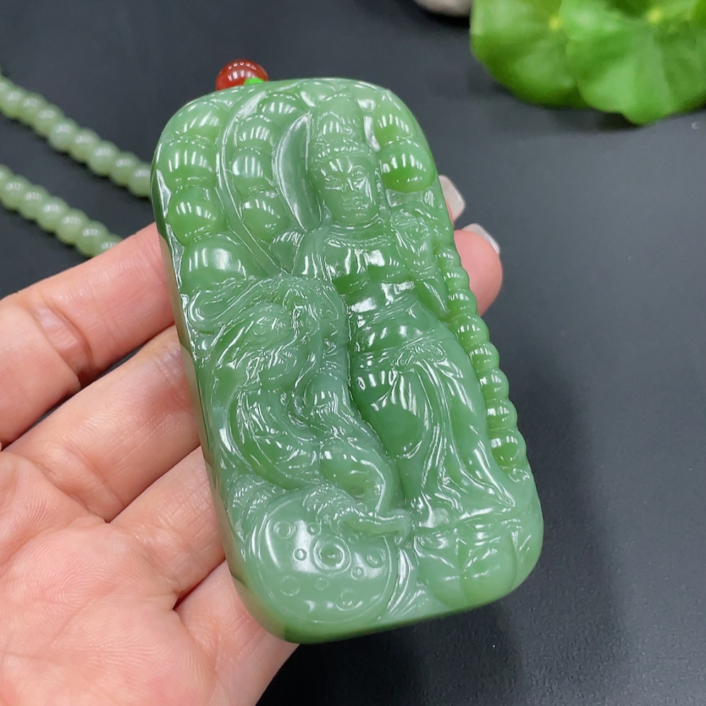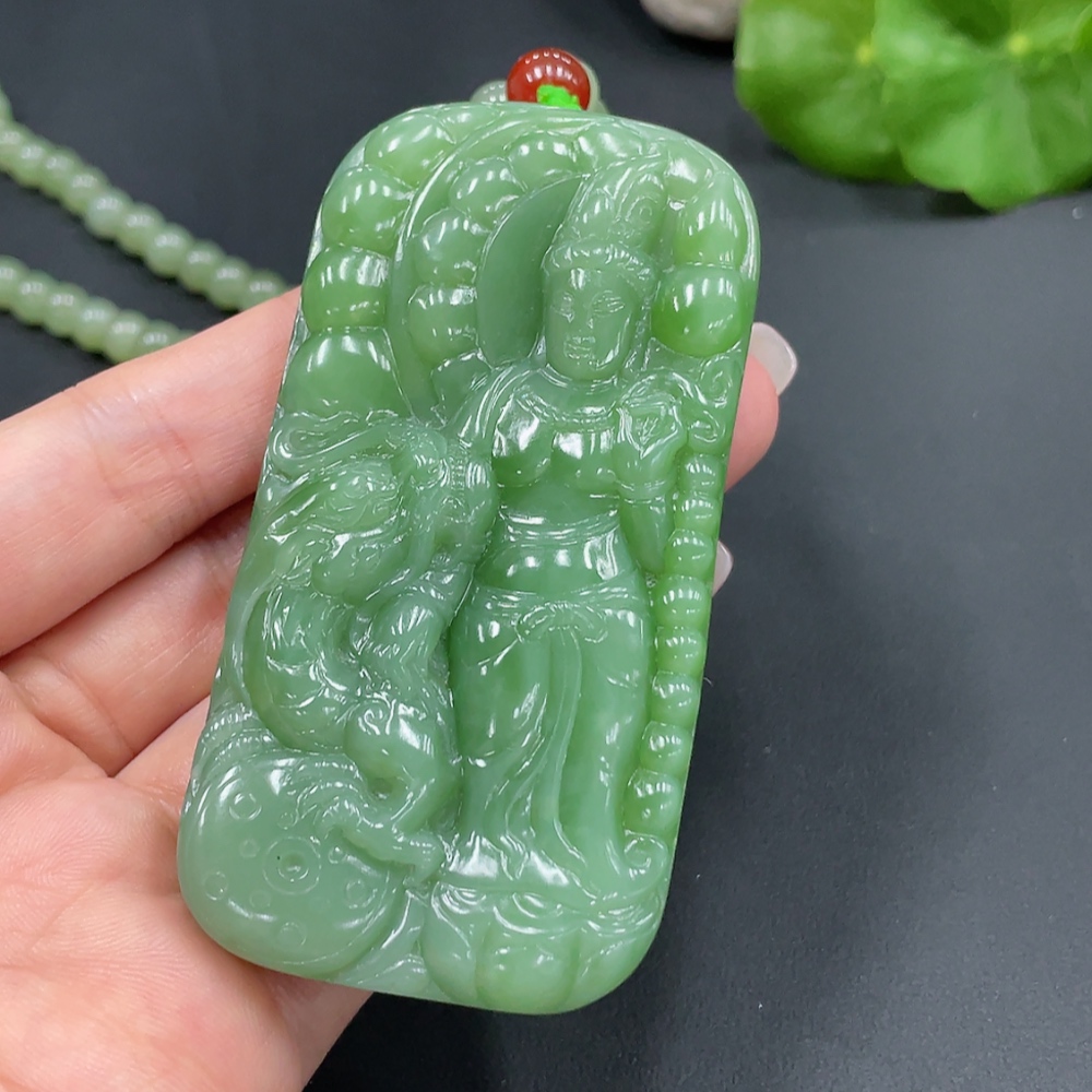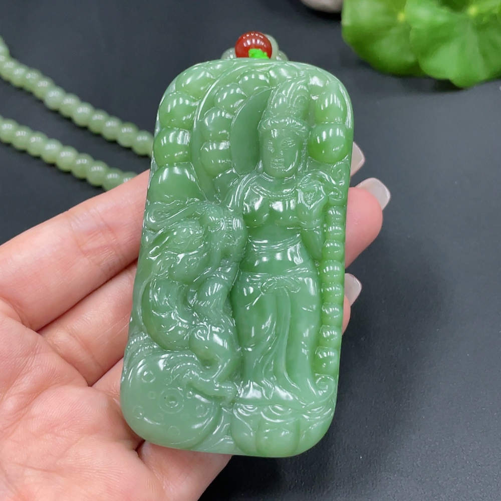 Hetian Jade Pendant - Imperial Dragon Guanyin with Red Beads (Non-Hetian Jade) Total Weight Approx. (Including Chain) 162.9g