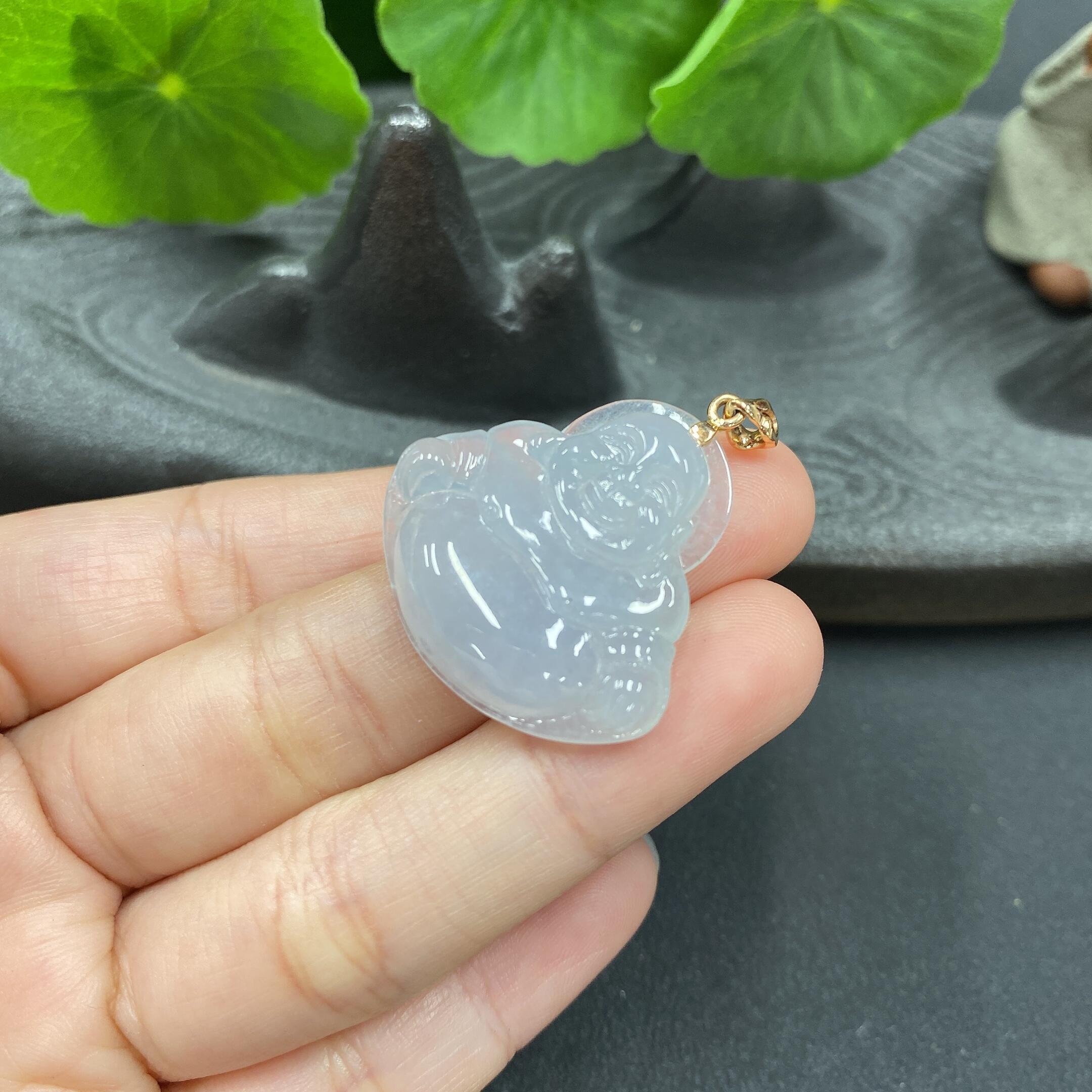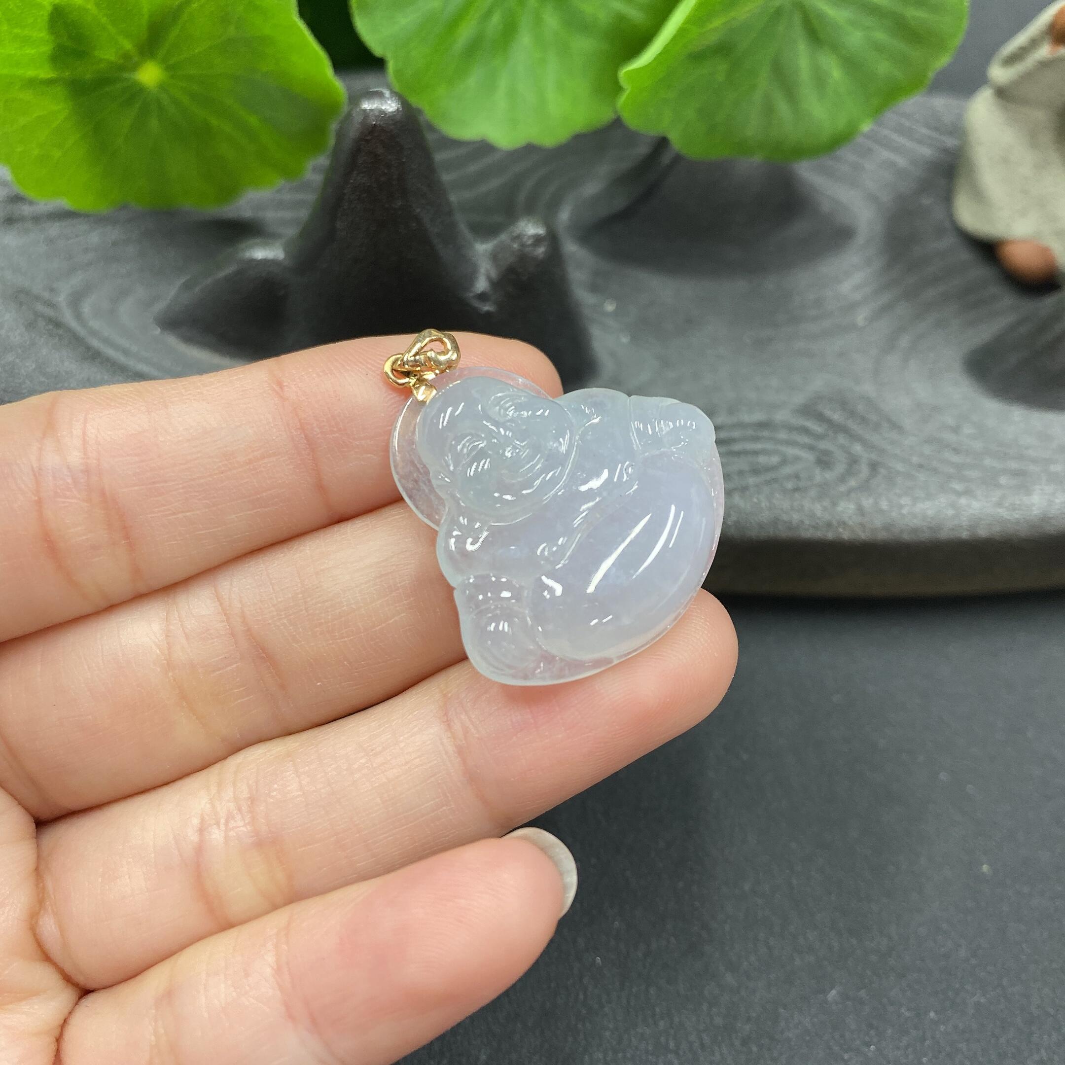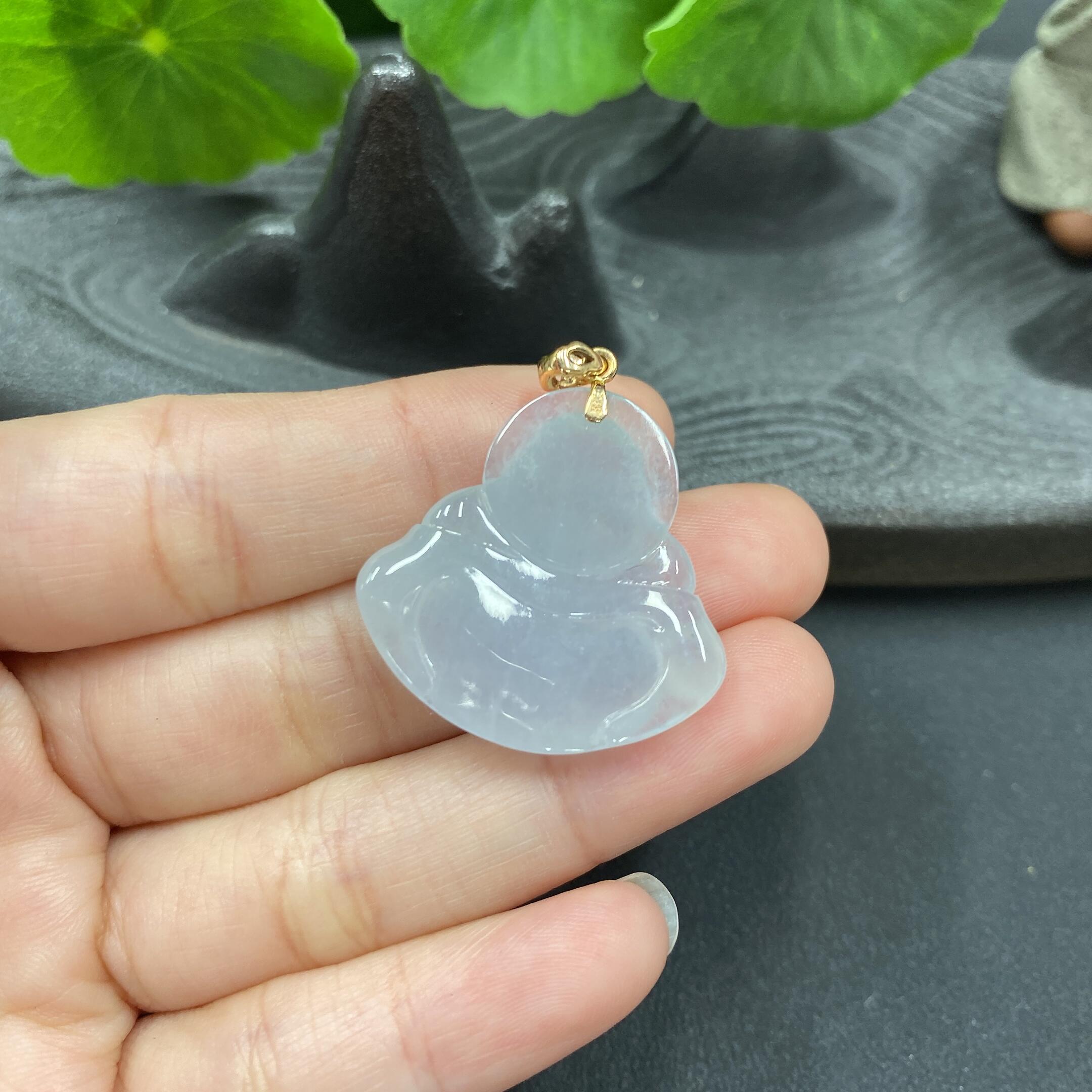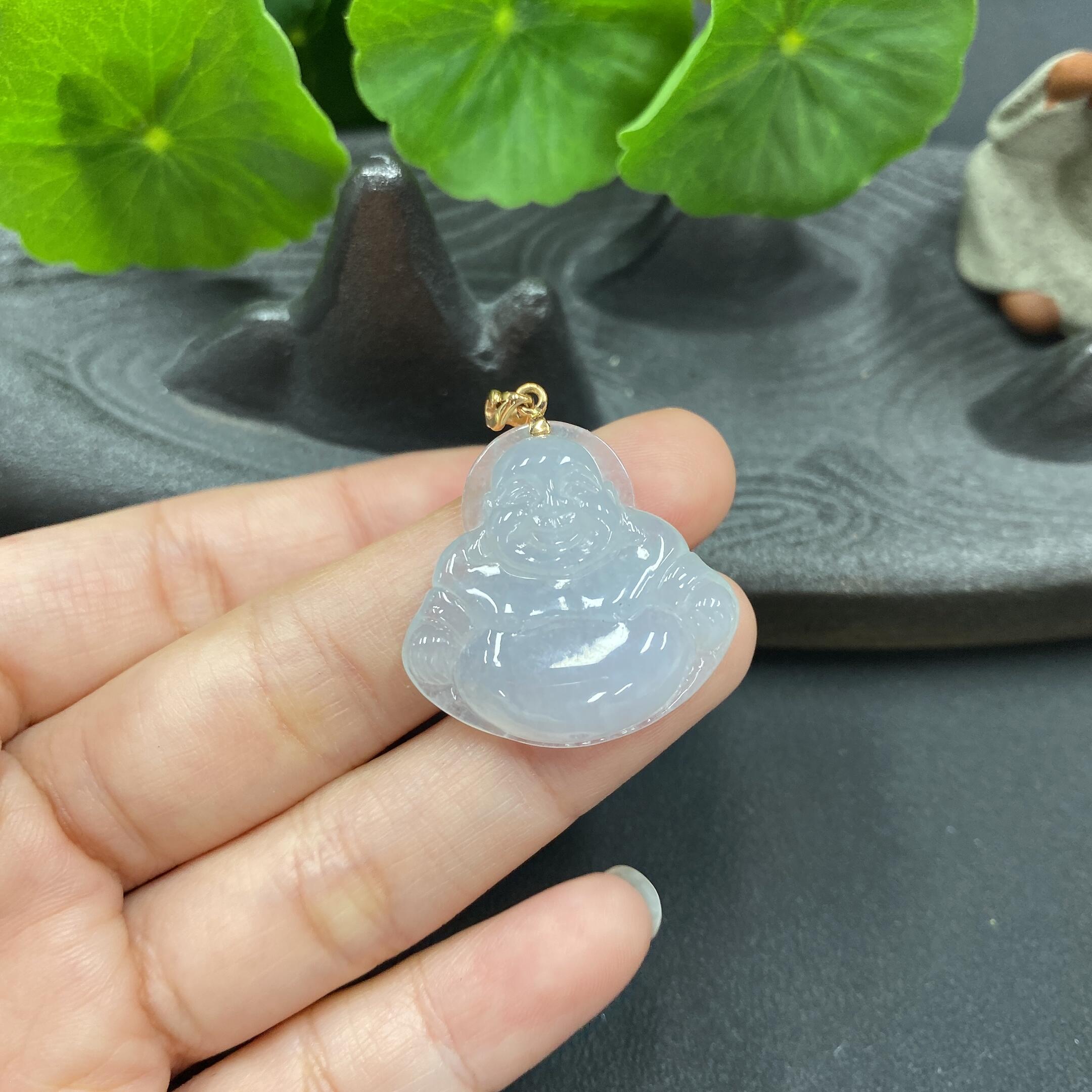 Jadeite Inlaid Buddha Pendant with Crack and 18K Gold Bail