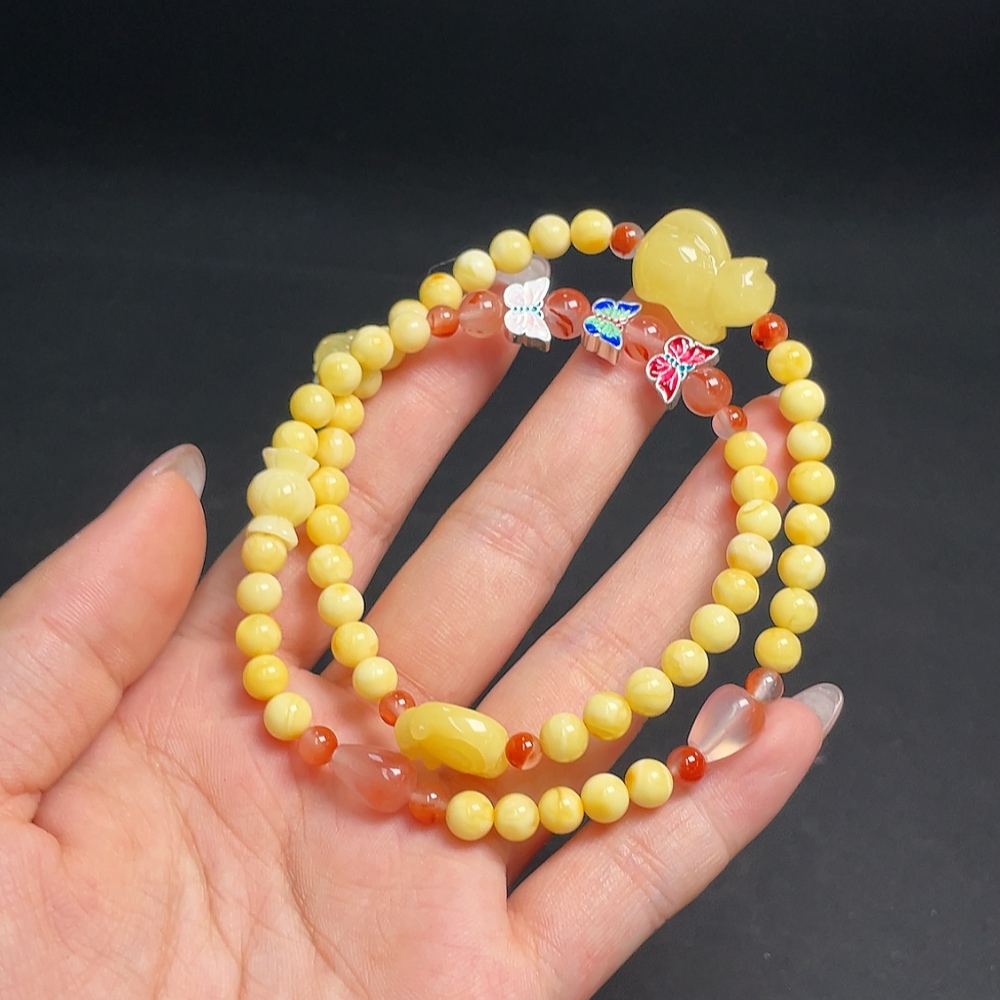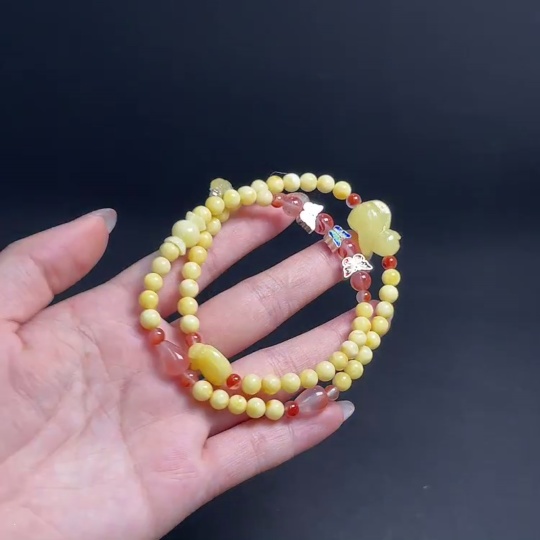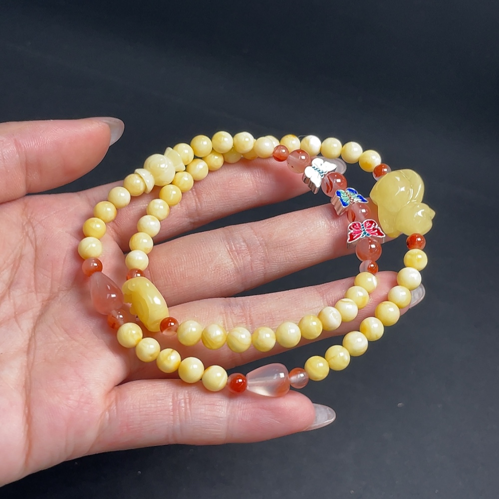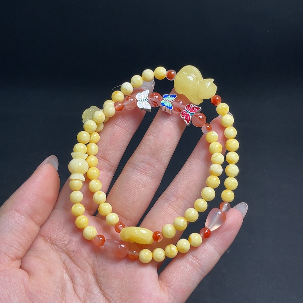 Amber Honey Bead Necklace with Carved Pieces Coated in Colorless Film, Paired with Southern Red Agate, Non-Gold Setting, Total Weight Approx. 14.96g, Bead Size Around 5.5mm