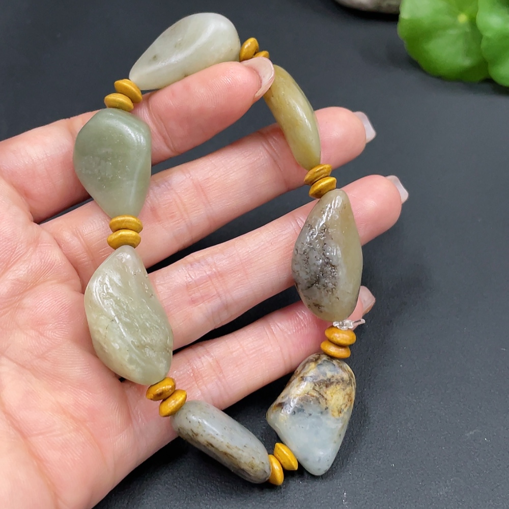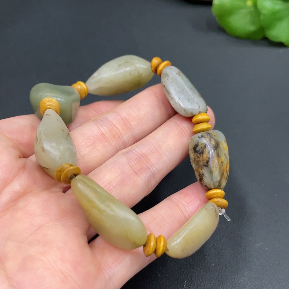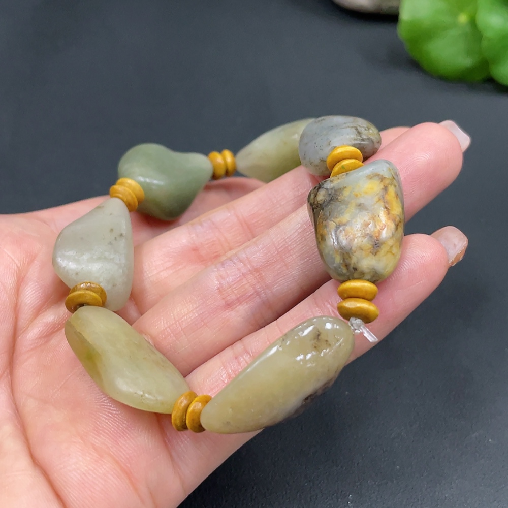 Hetian Jade Bracelet, Undetermined Skin Color Origin, Contains Other Mineral Components, Beads Not Hetian Jade, Total Weight Approximately 45.8g