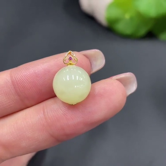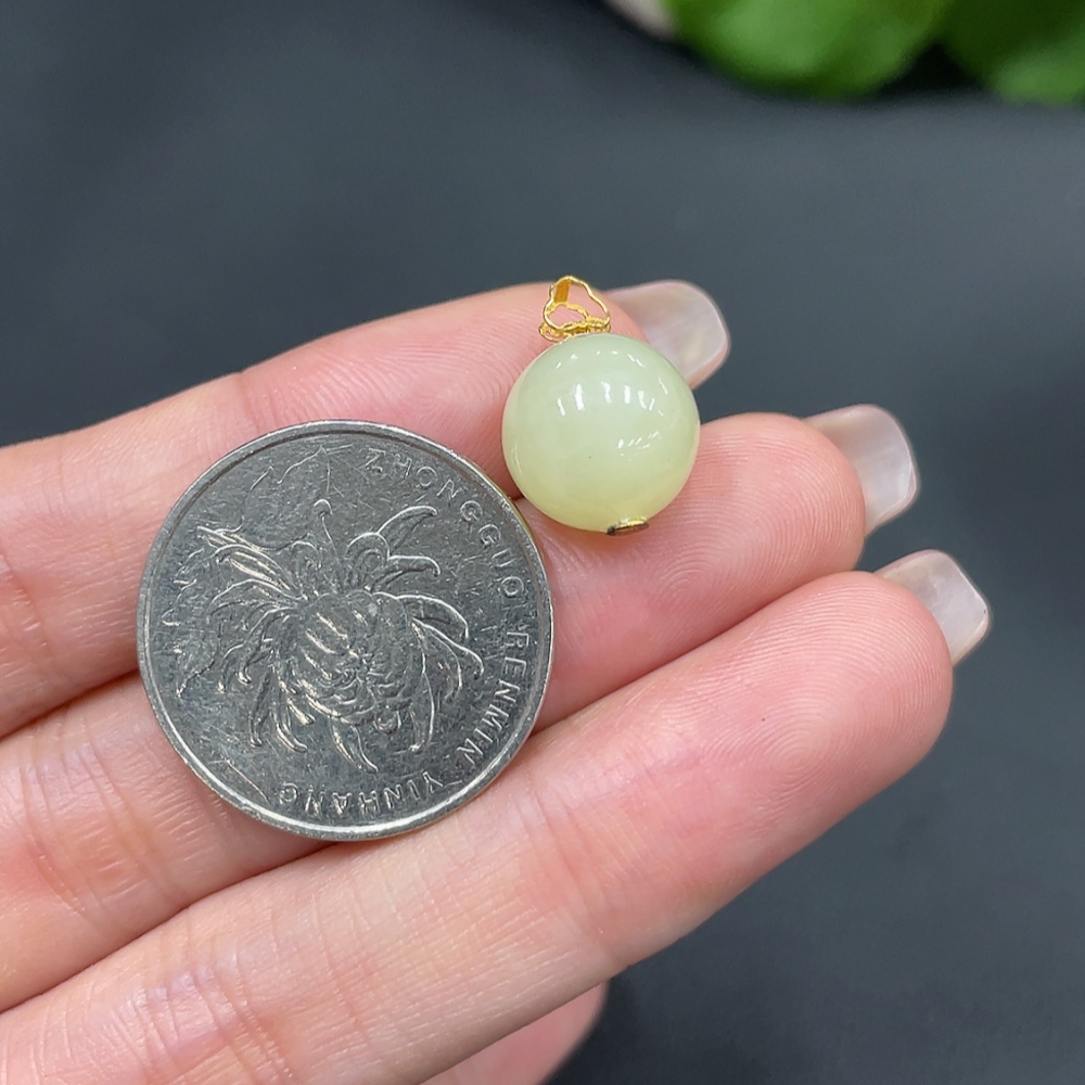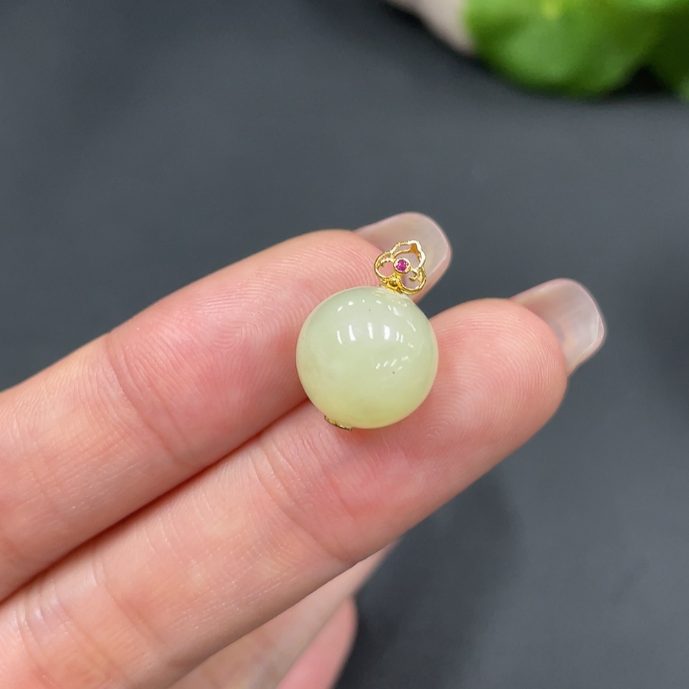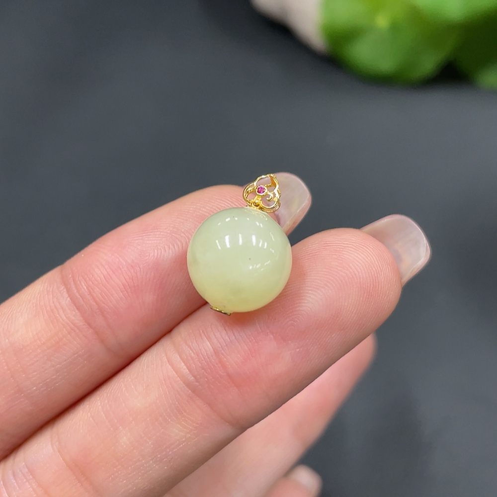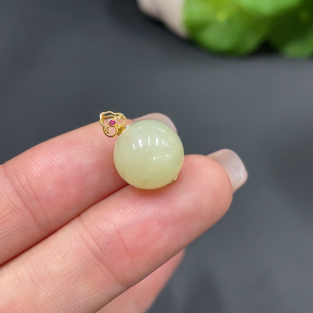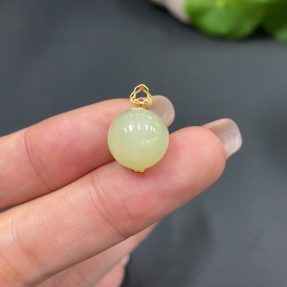 Hetian Jade Inlaid Pendant, Single Bead, Approx. 11.3 mm, Total Weight Approx. 2.4g, Non-Gold Base, 18k Rest