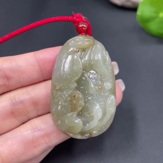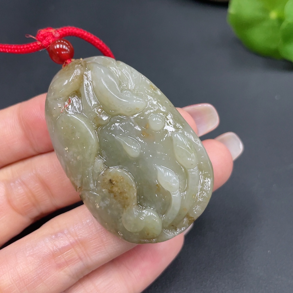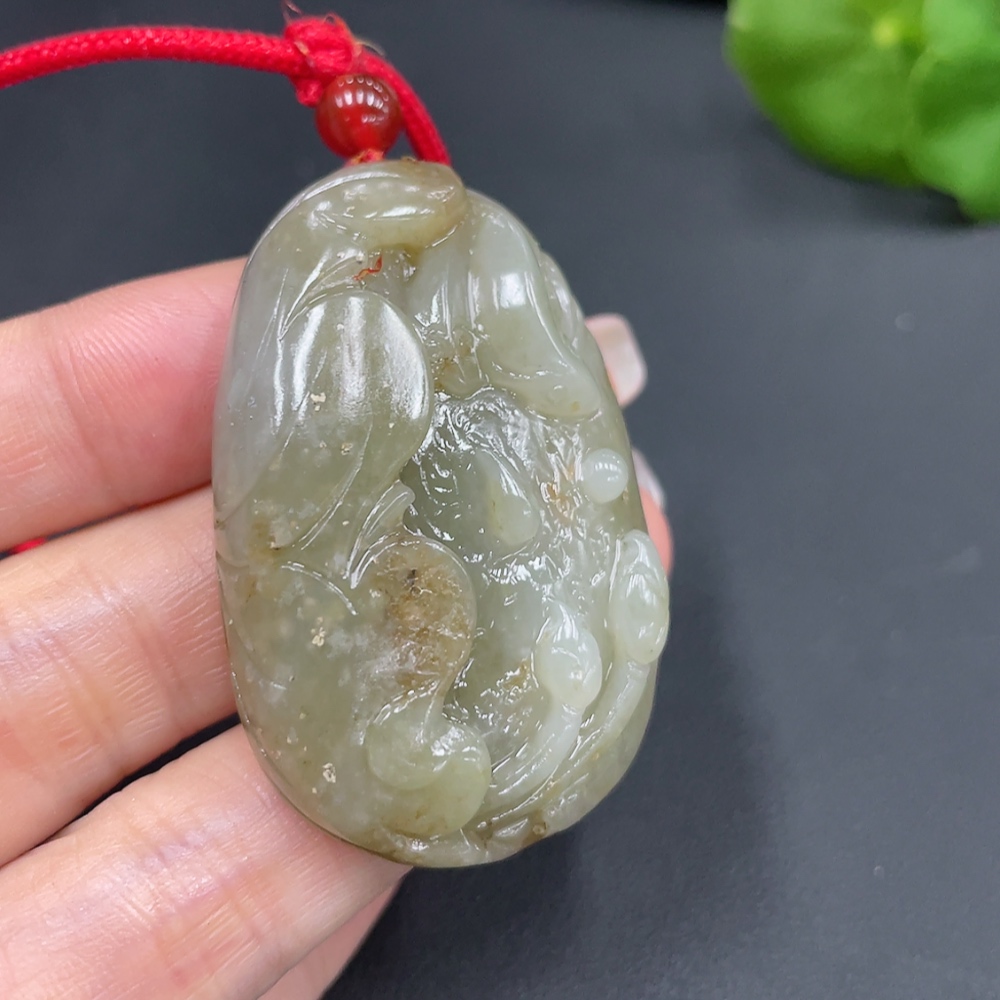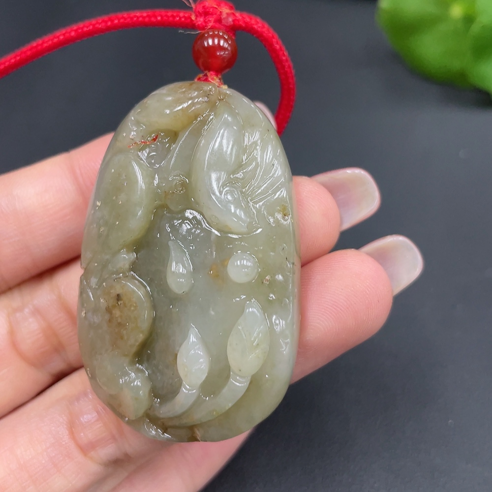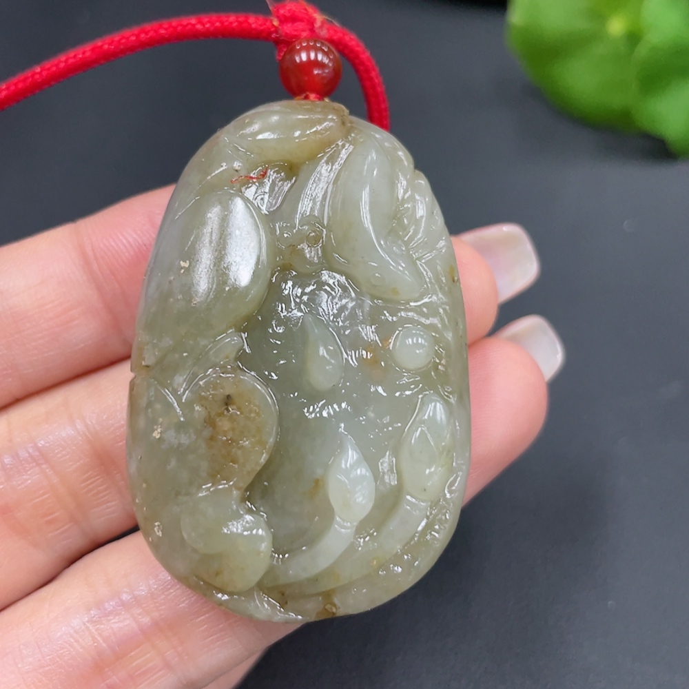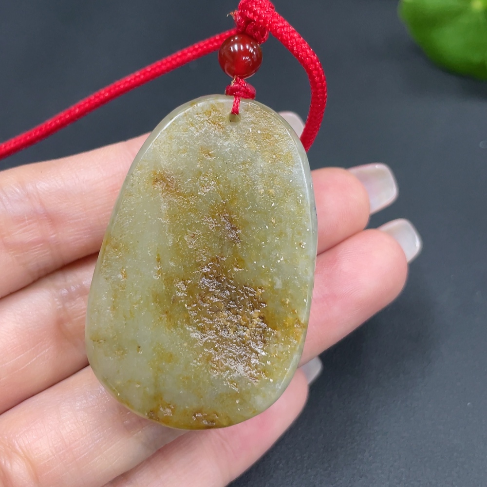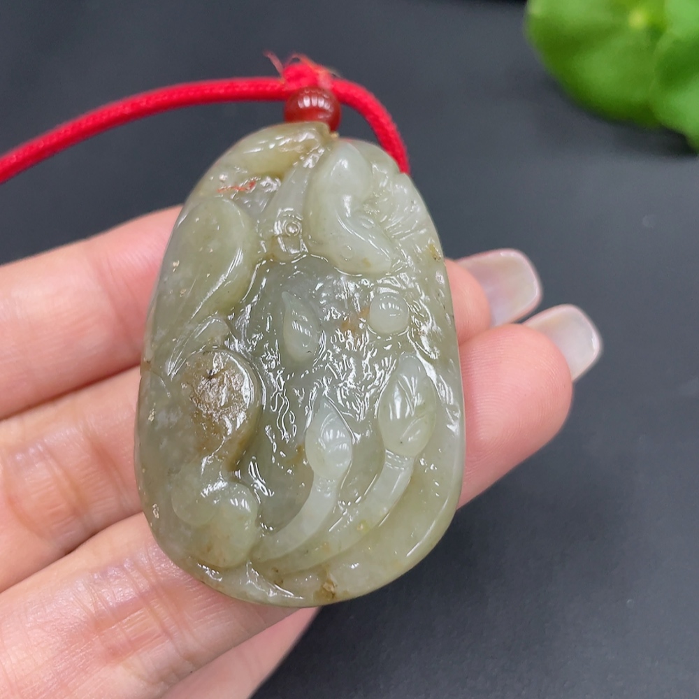 Hetian Jade Seed Material Pendant "Abundance Every Year" with Undetermined Skin Color Cause, Total Weight Approx. (Including String) 35.6g
