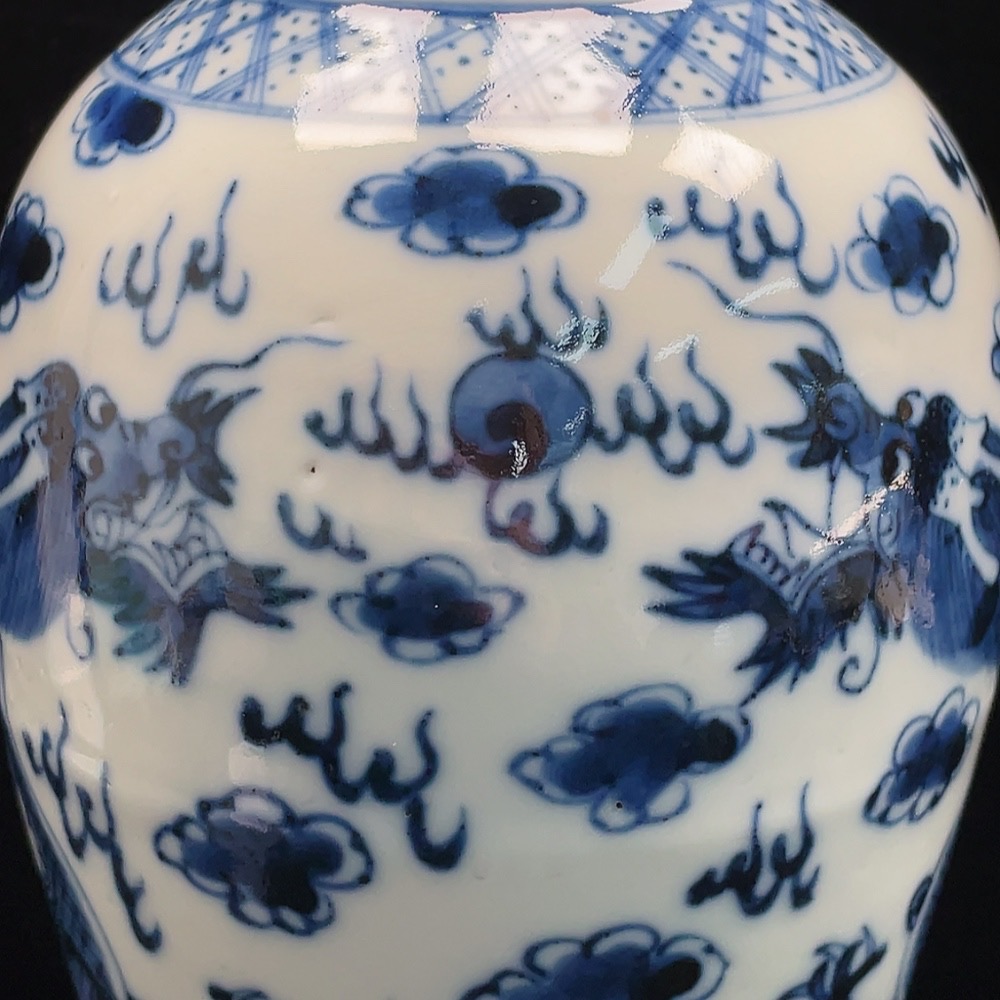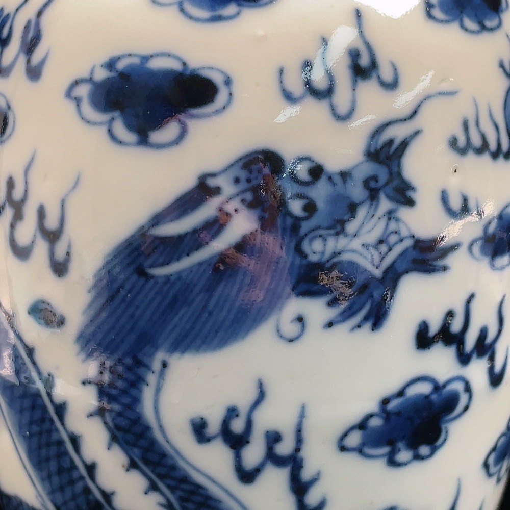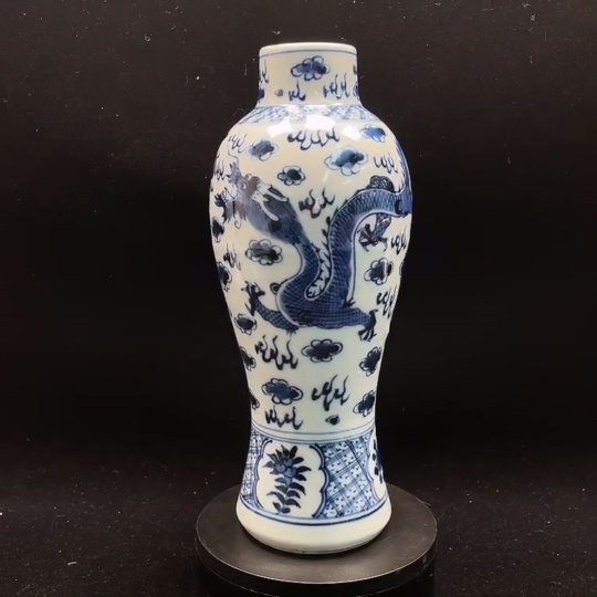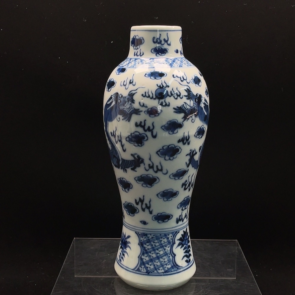Porcelain, flawless, late Qing Dynasty blue and white Guanyin vase with two dragons playing with a pearl design