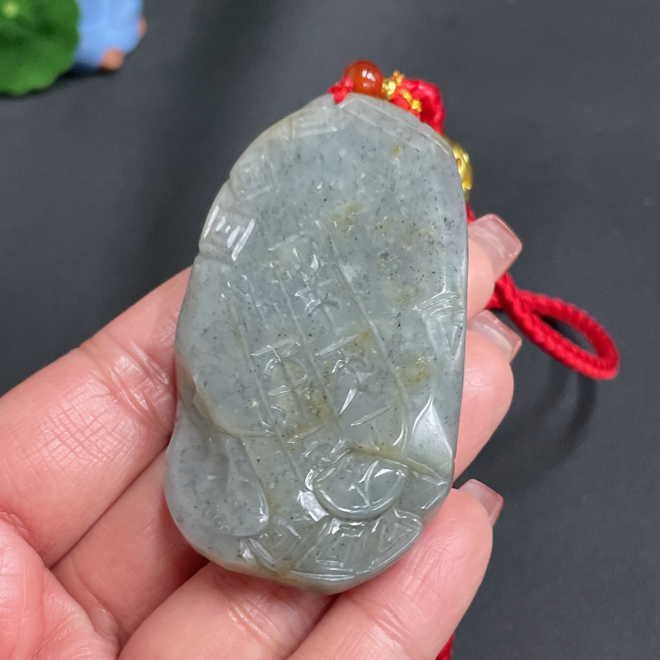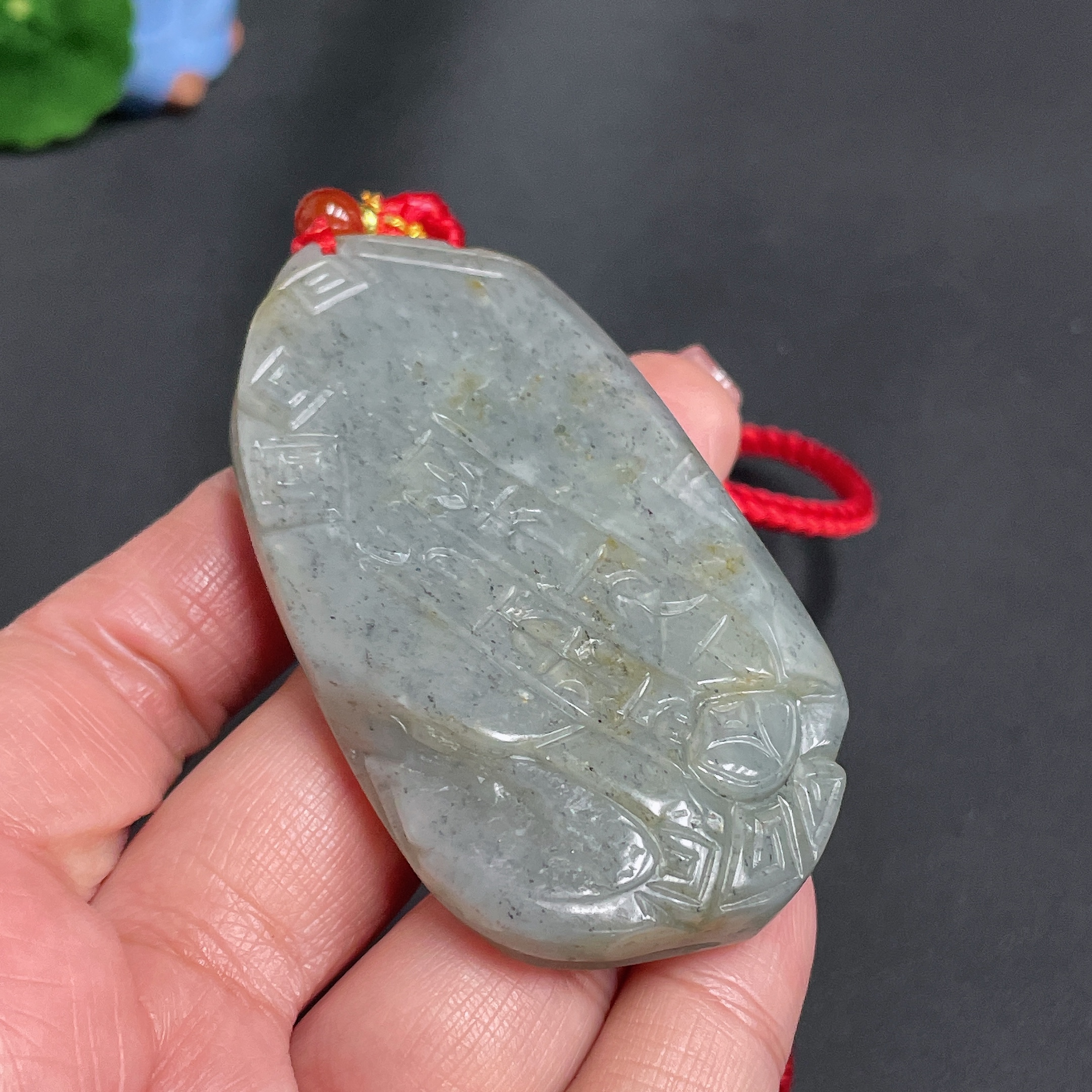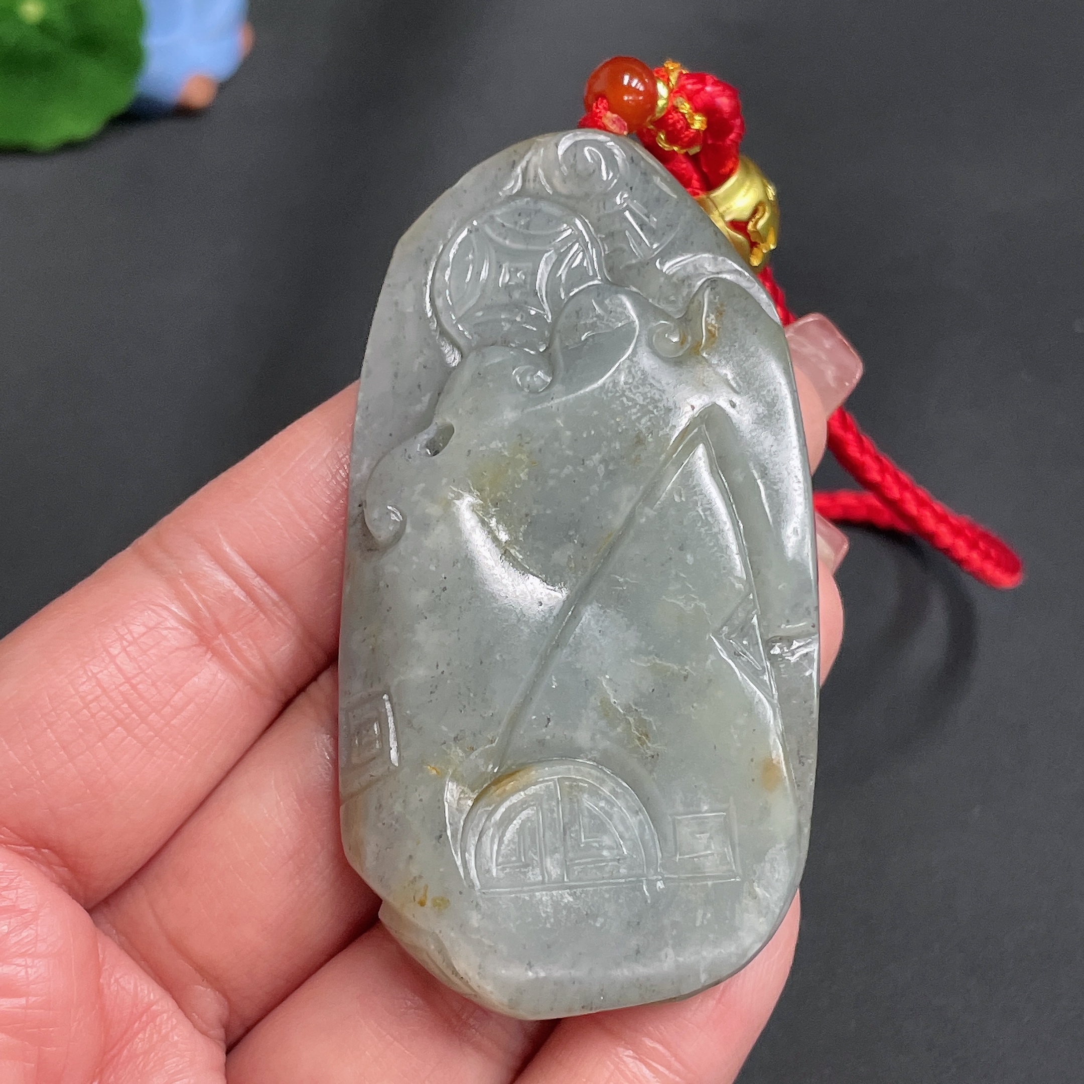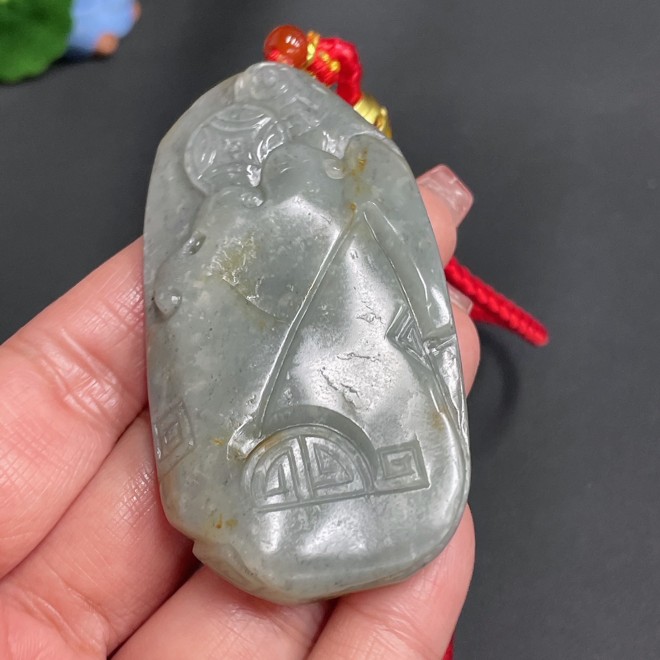 Hetian Jade Handheld Carving, Antique Style, Undetermined Skin Color Origin, Total Weight Approx. [with Cord] 60.3g