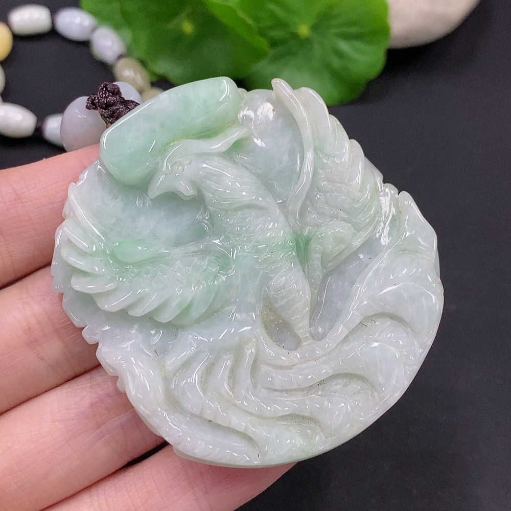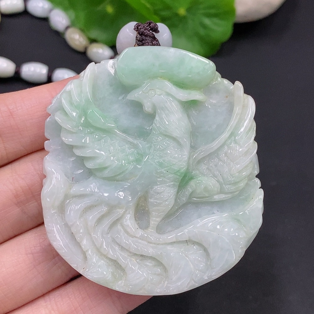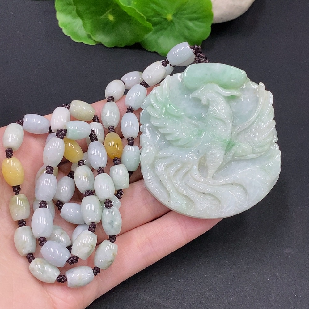 Jadeite Phoenix and Peony Pendant Total weight about 89.4g (including rope weight) Yellow beads not jadeite