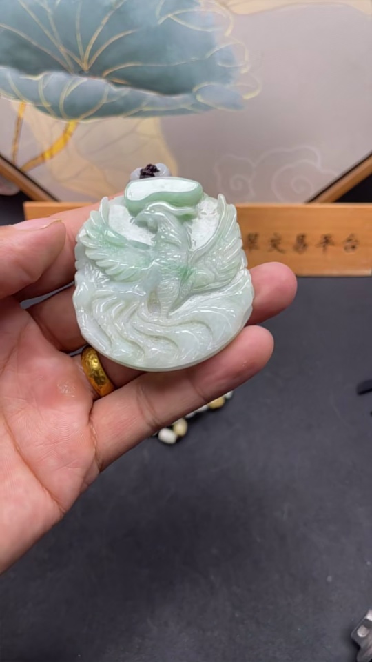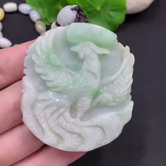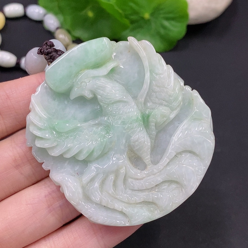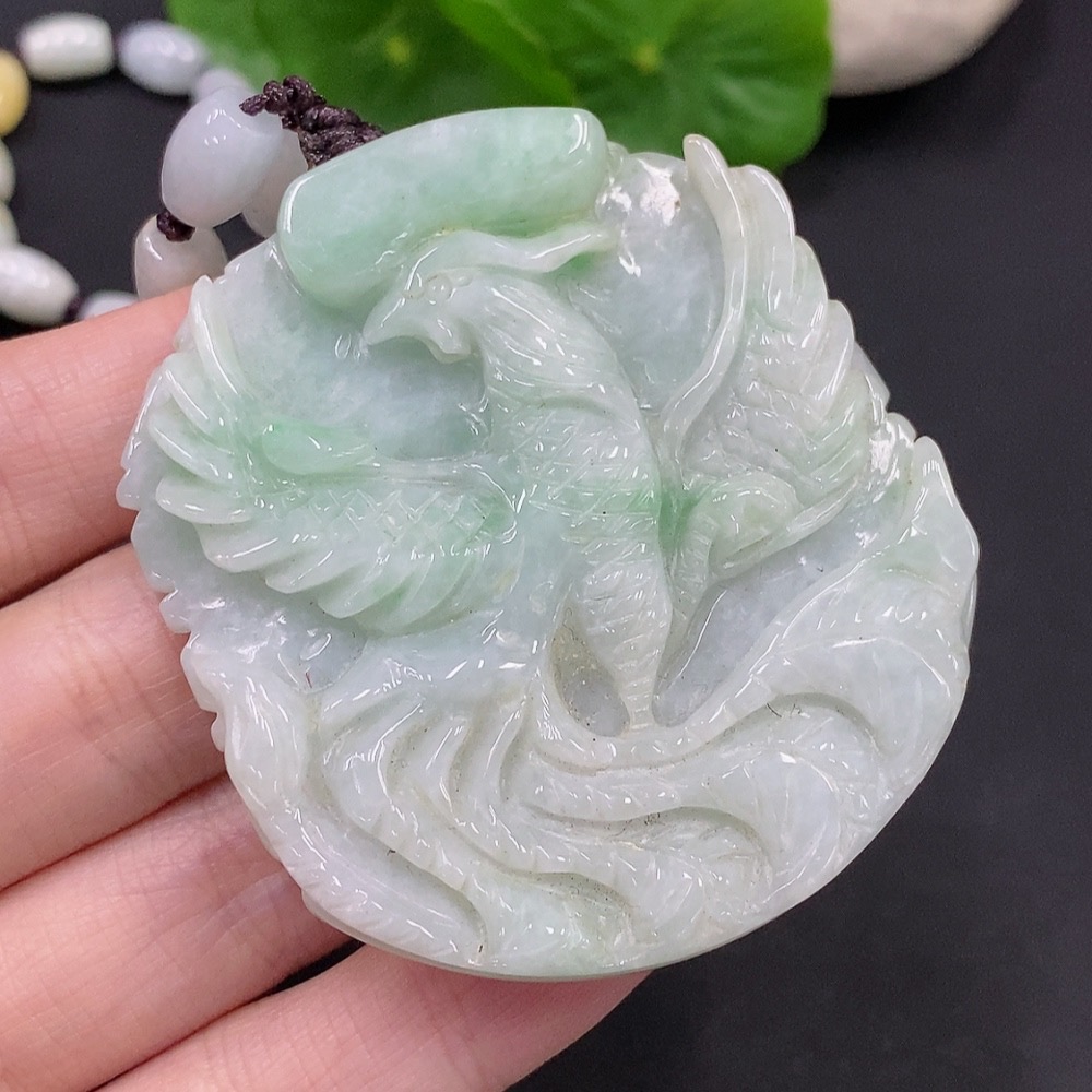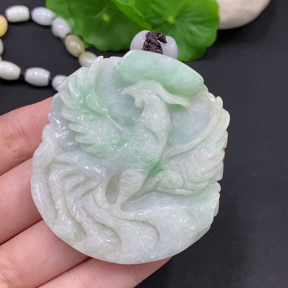 Jadeite Phoenix and Peony Pendant Total weight about 89.4g (including rope weight) Yellow beads not jadeite