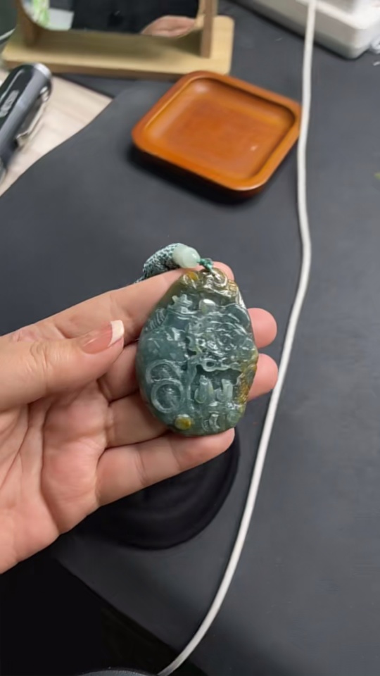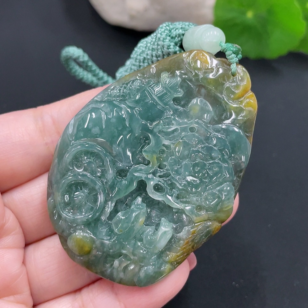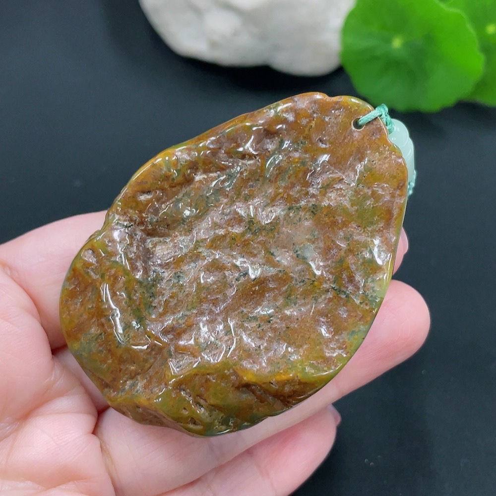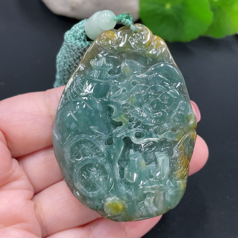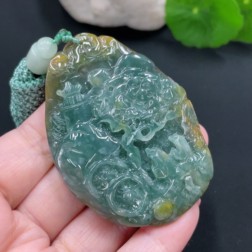 Jadeite landscape pendant with rope, total weight approximately 54.5g (color origin undetermined)