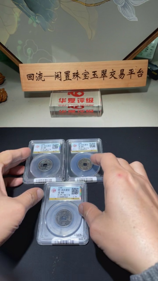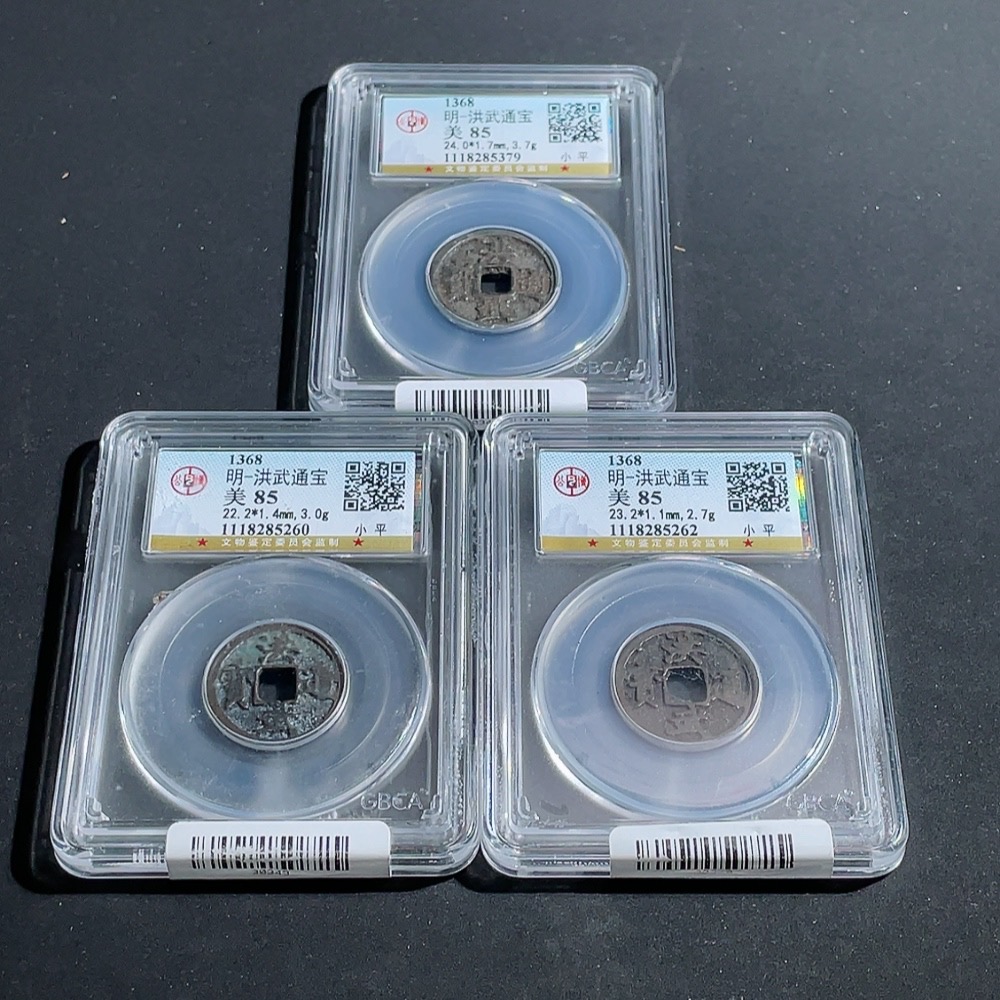 Ancient Coin Ming Dynasty Hongwu Tongbao Small Coin Three Pieces Diameter Approx. 22.2-24mm Clear Inscription GBCA Graded Slab 85 Points