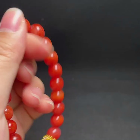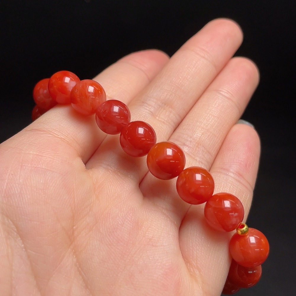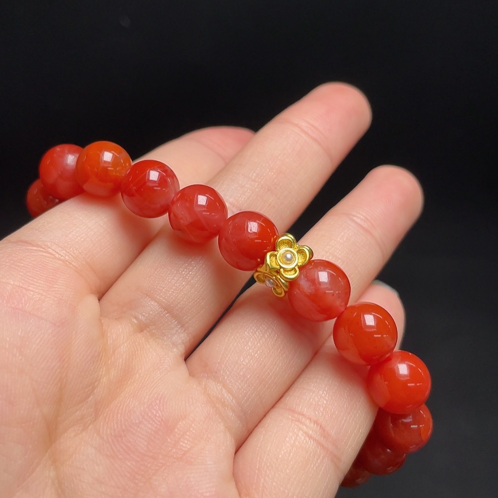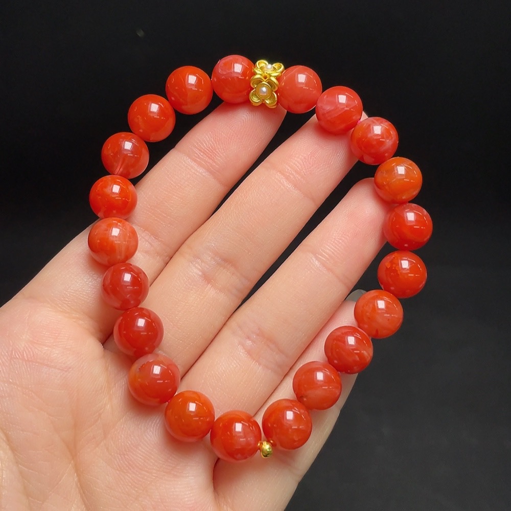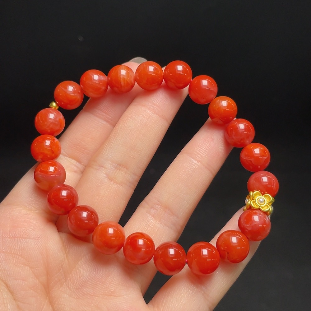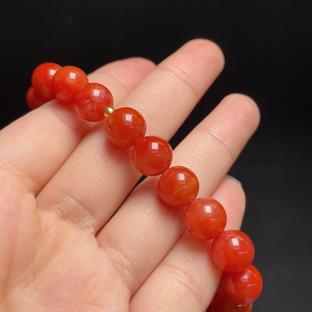 Red Agate Bracelet, 99% gold content in beads, non-gold remainder, visible organic matter, total weight approx. 23.4g, size approx. 9.1mm
