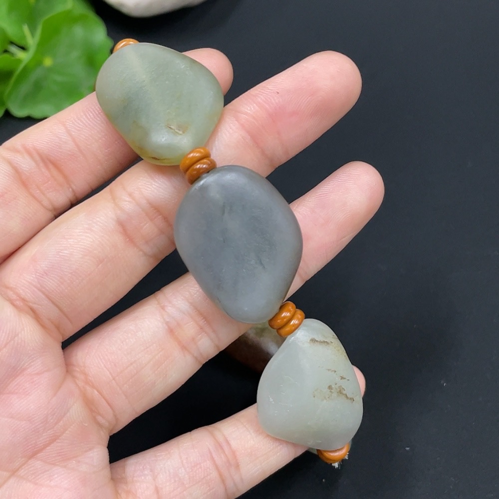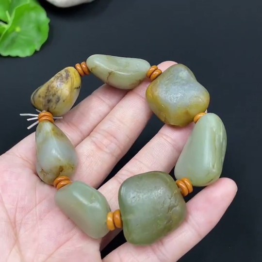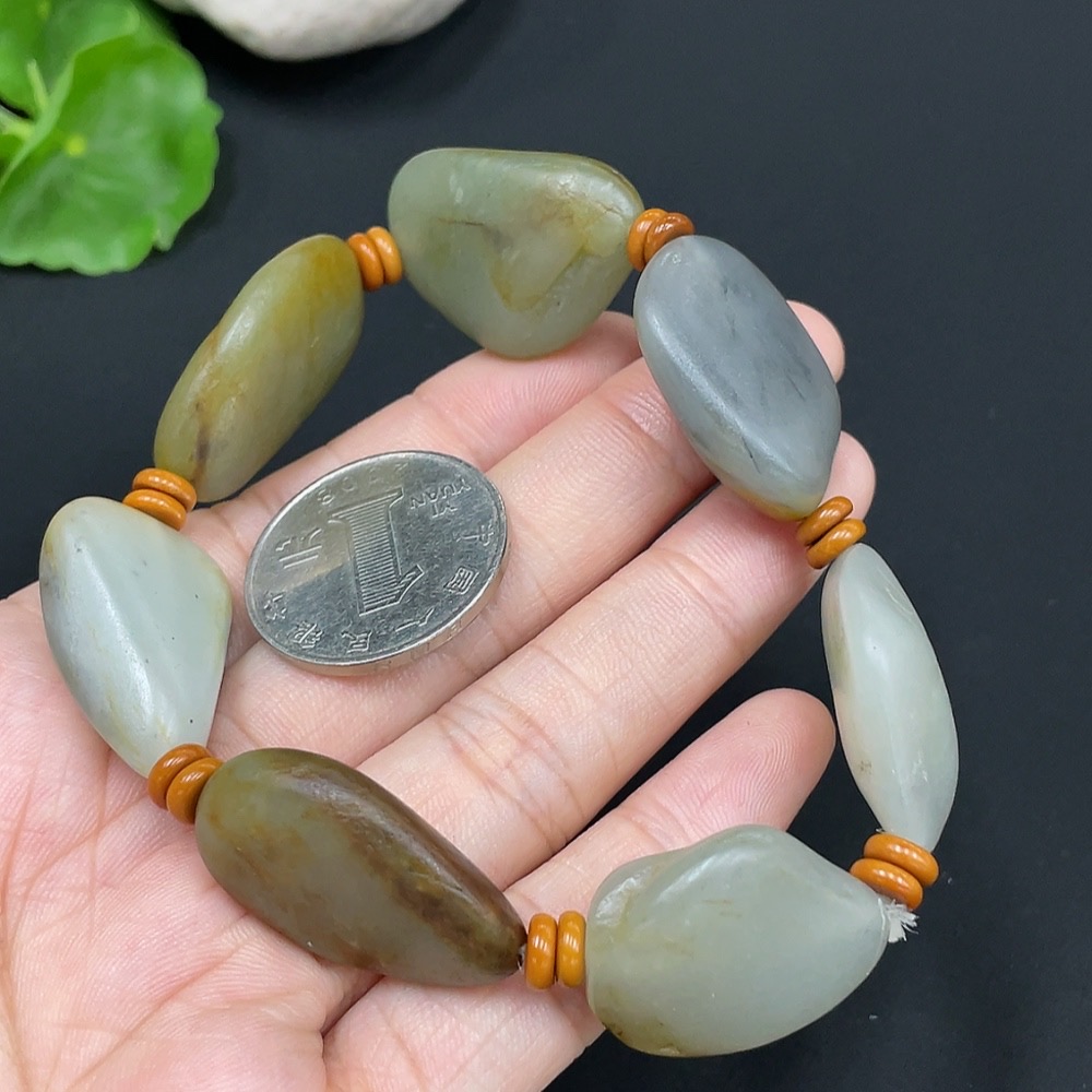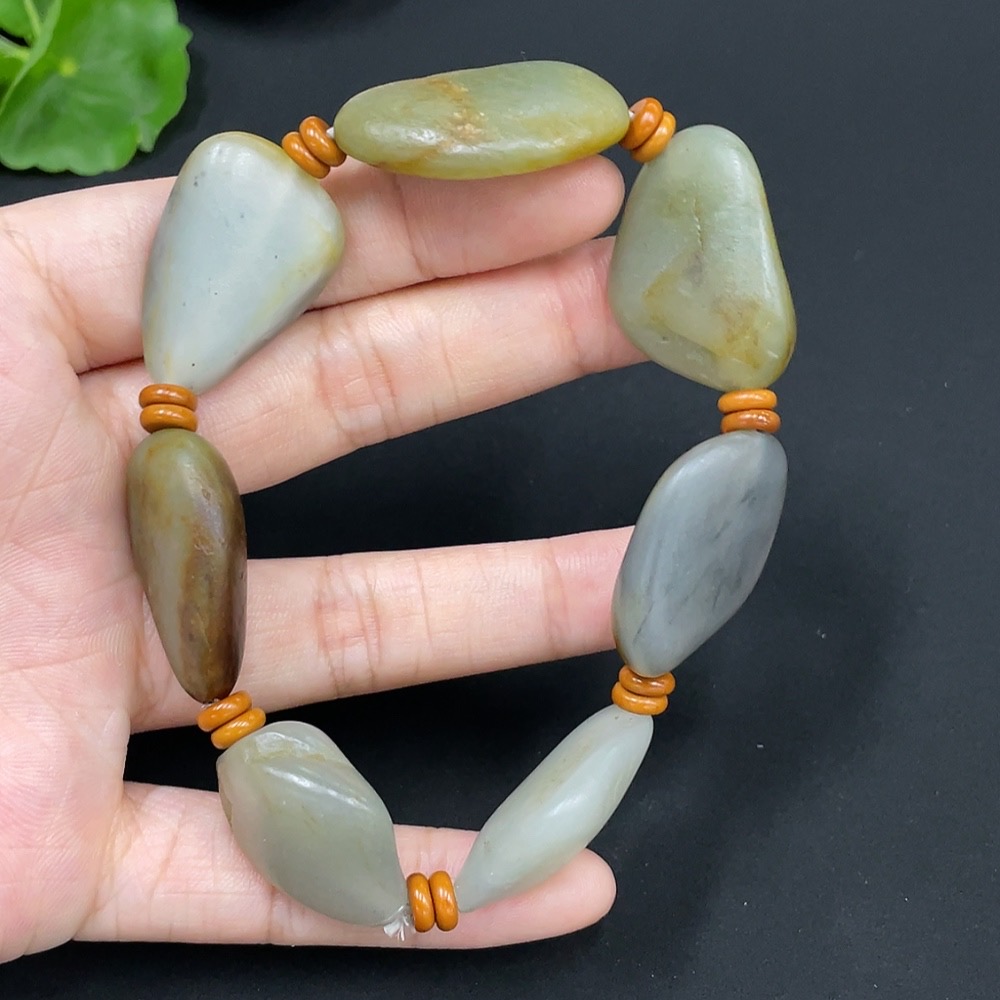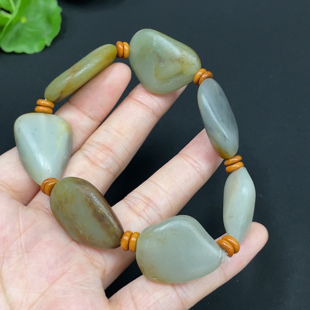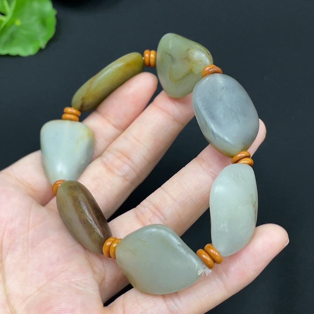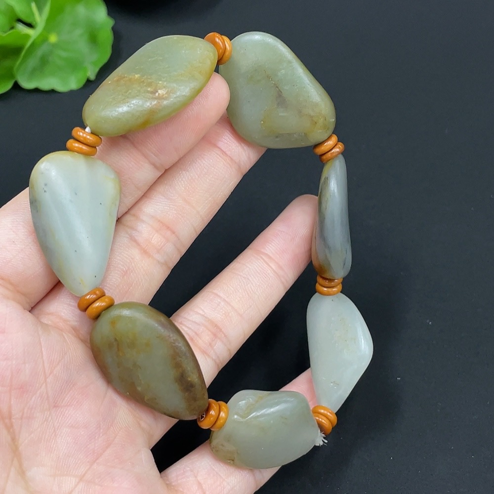 Hetian Jade Bracelet, Undetermined Skin Color Origin, Contains Other Mineral Components, Matching Beads Not Hetian Jade, Total Weight Approximately 52g