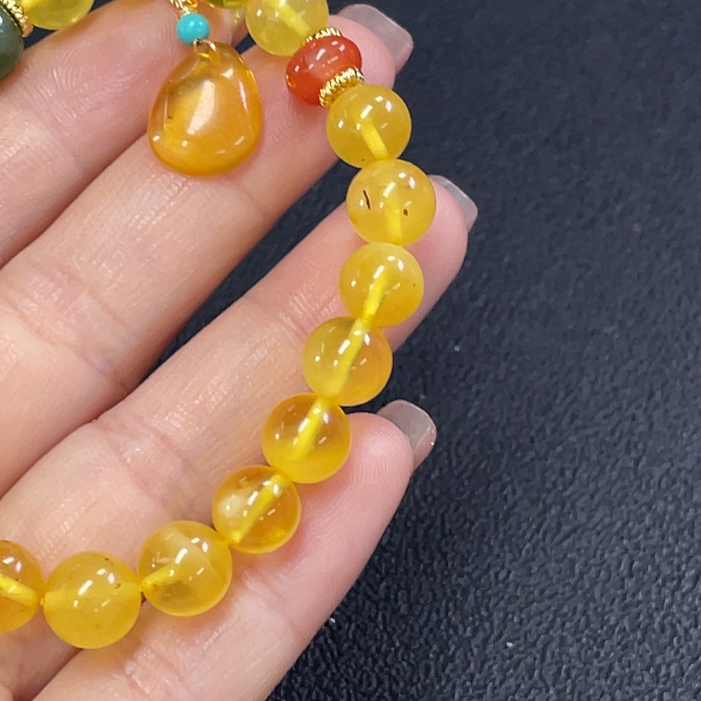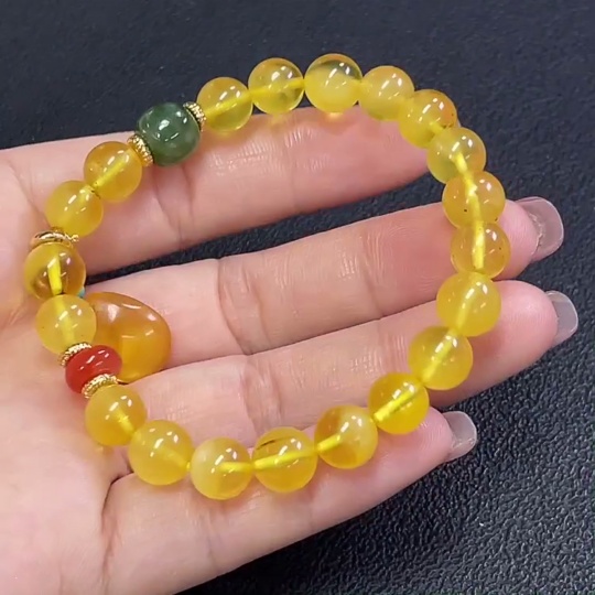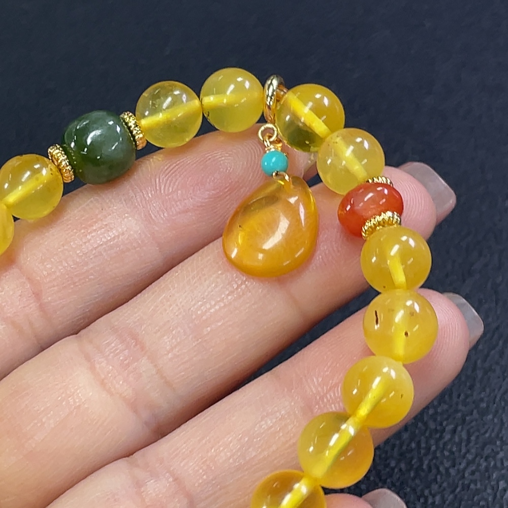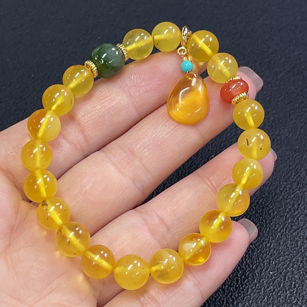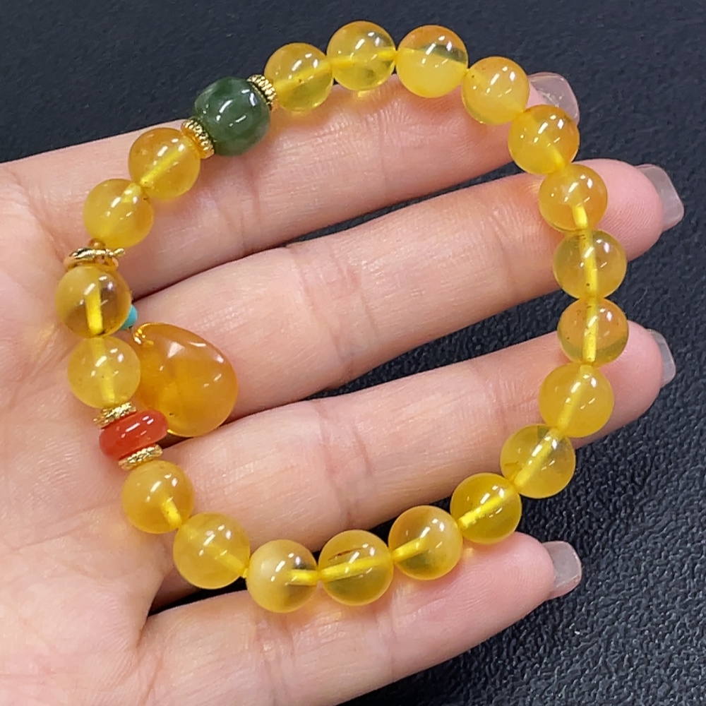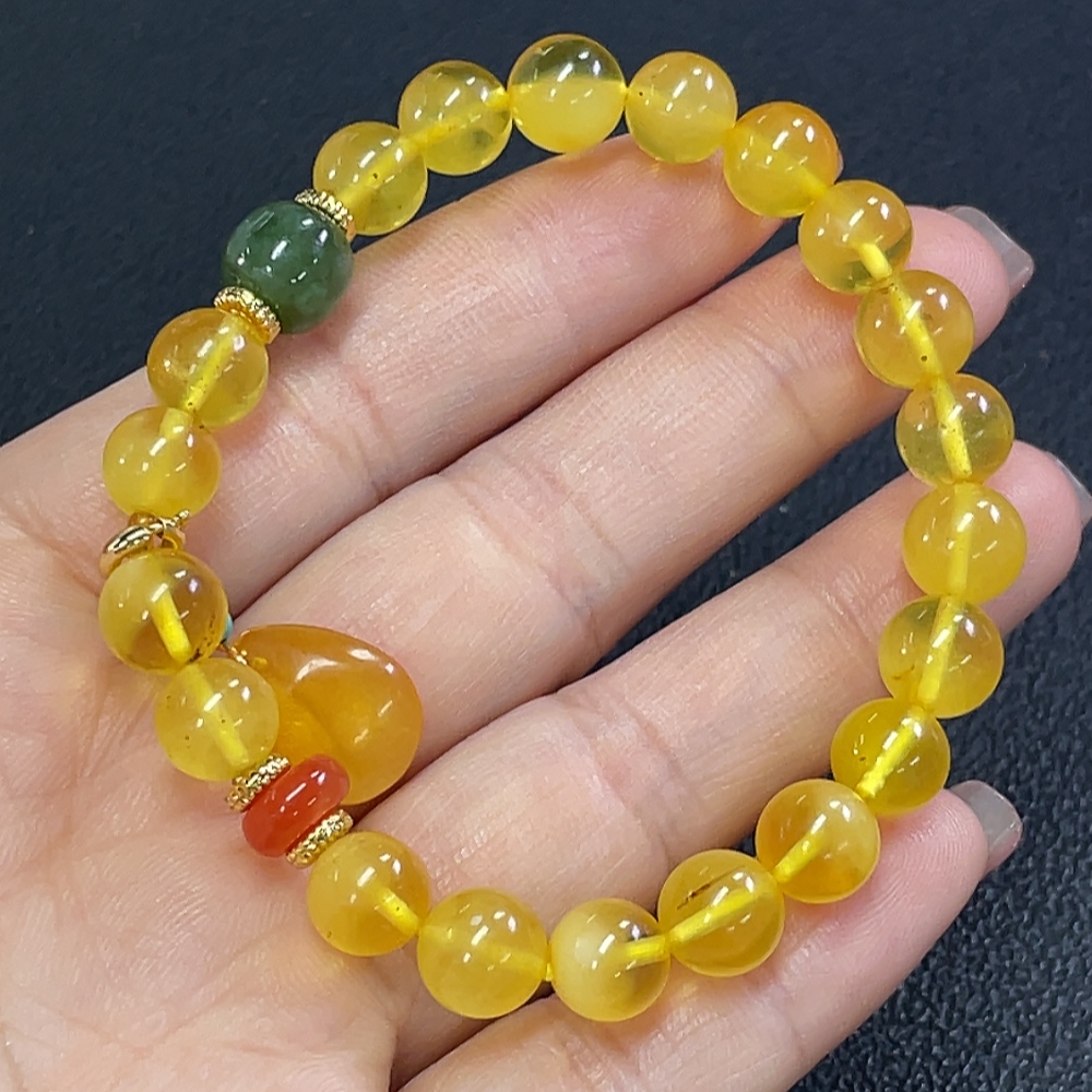 Amber Beeswax Bracelet with Southern Red Agate and Hetian Jade (Non-natural matching stones, Non-gold inlaid, Approx. 8.92g total weight, ~8.3mm bead size)