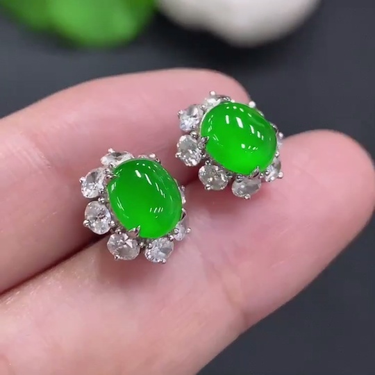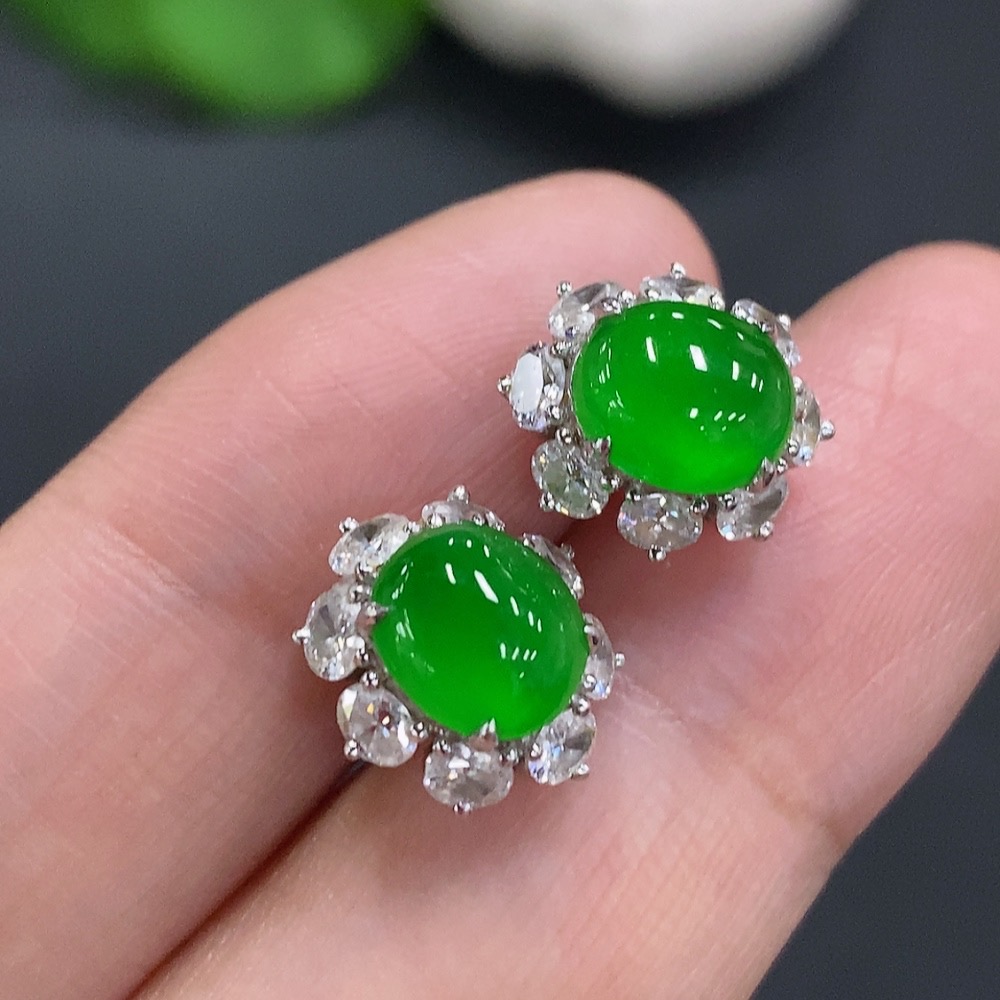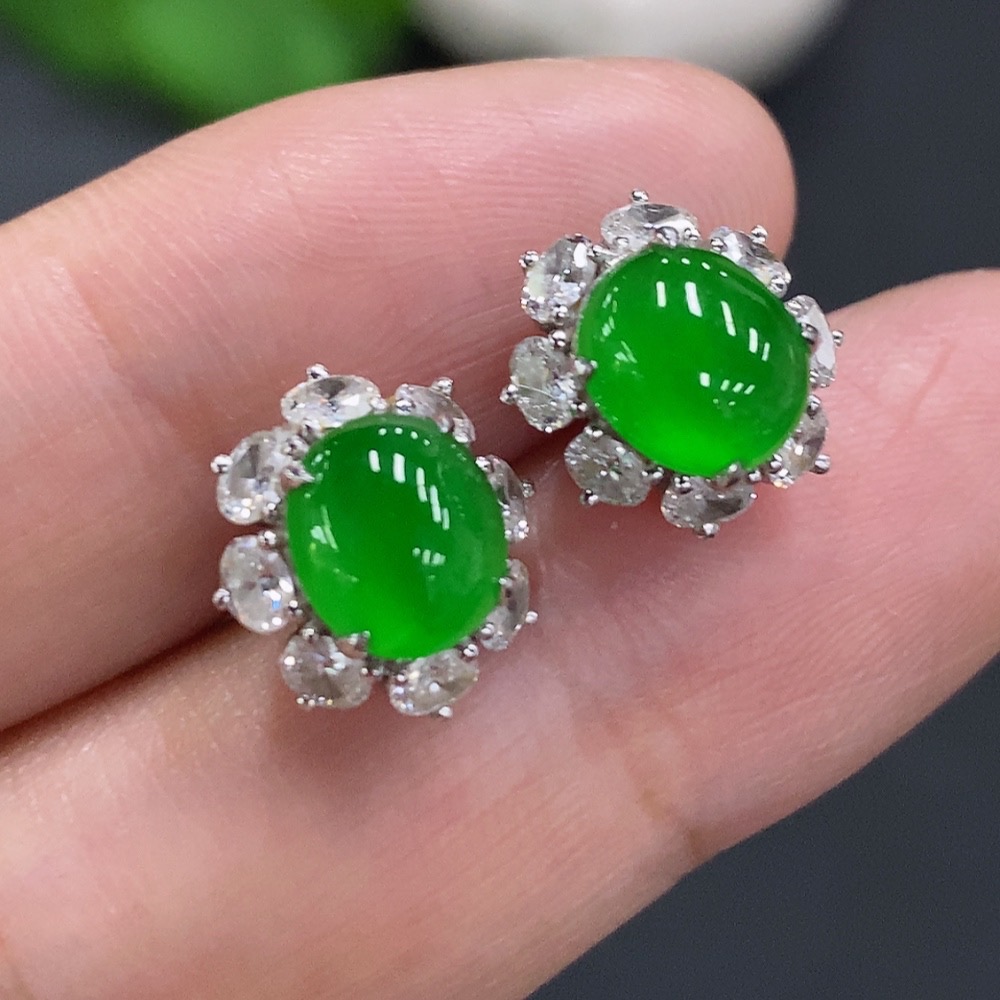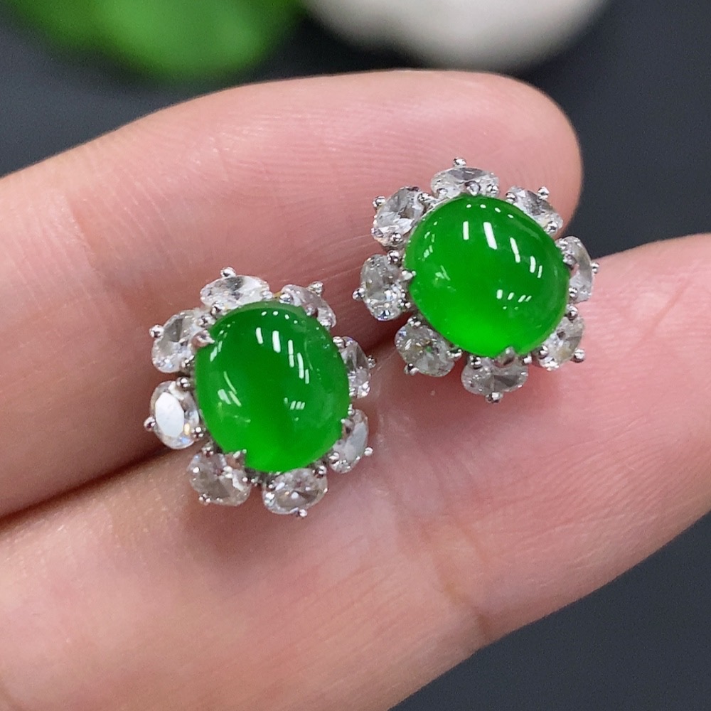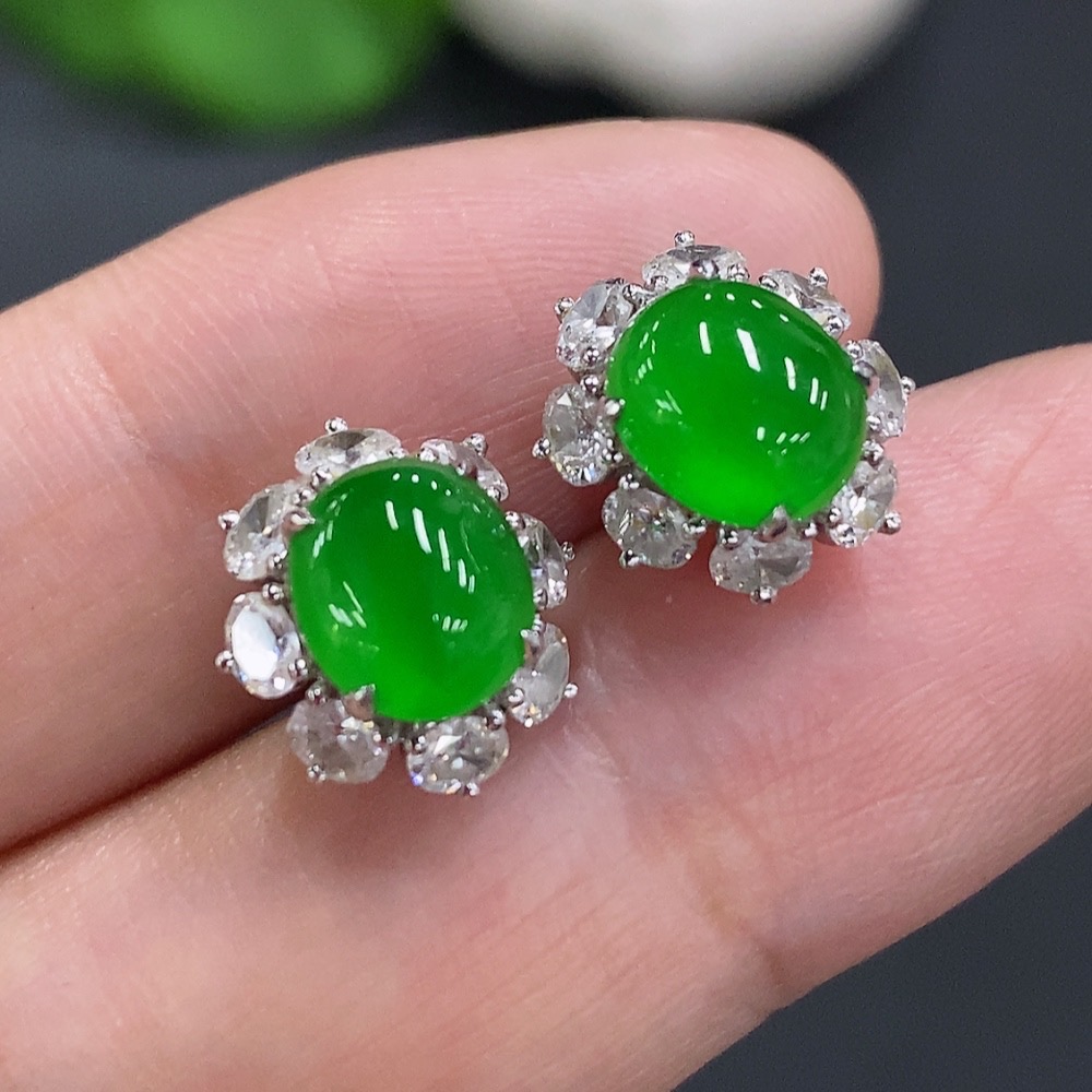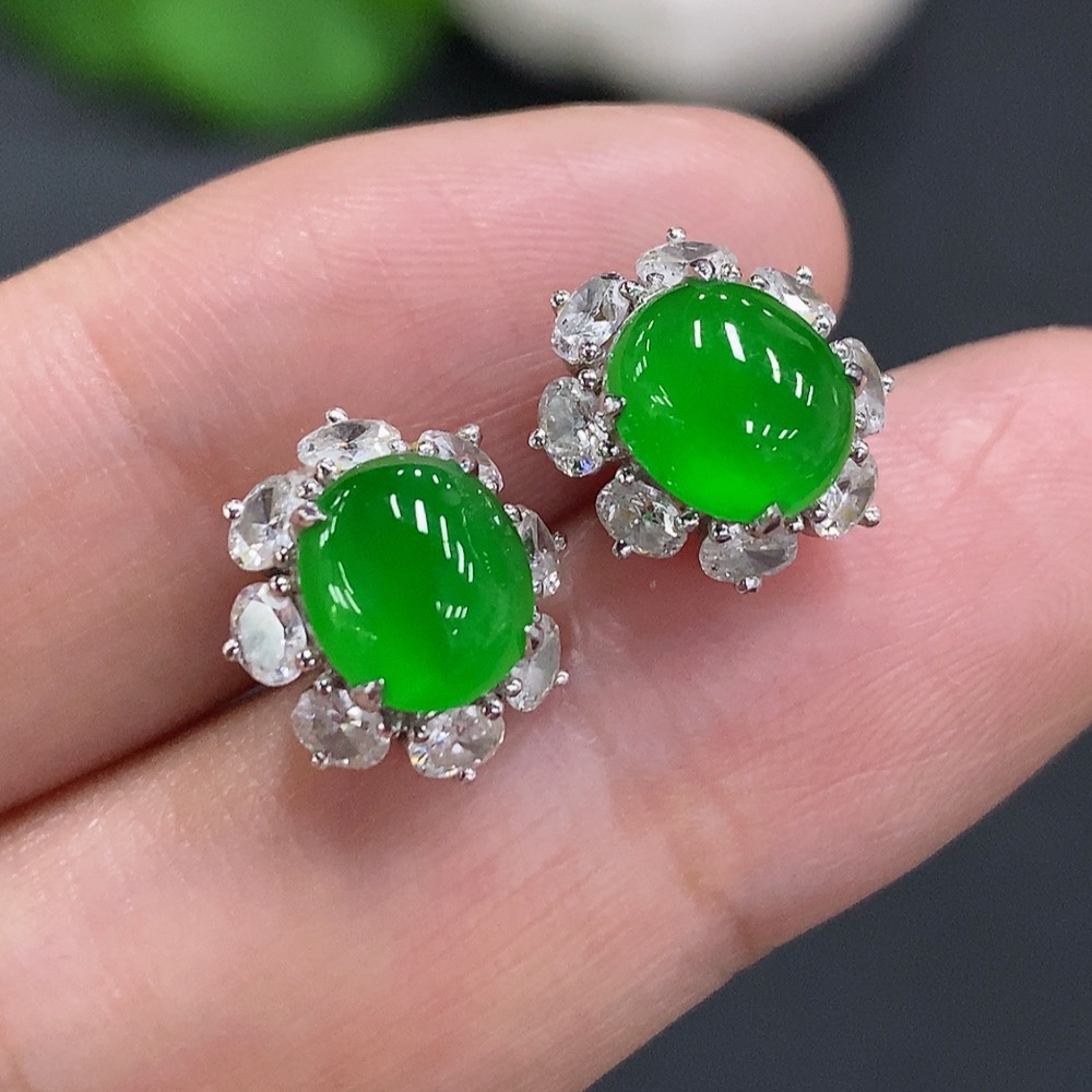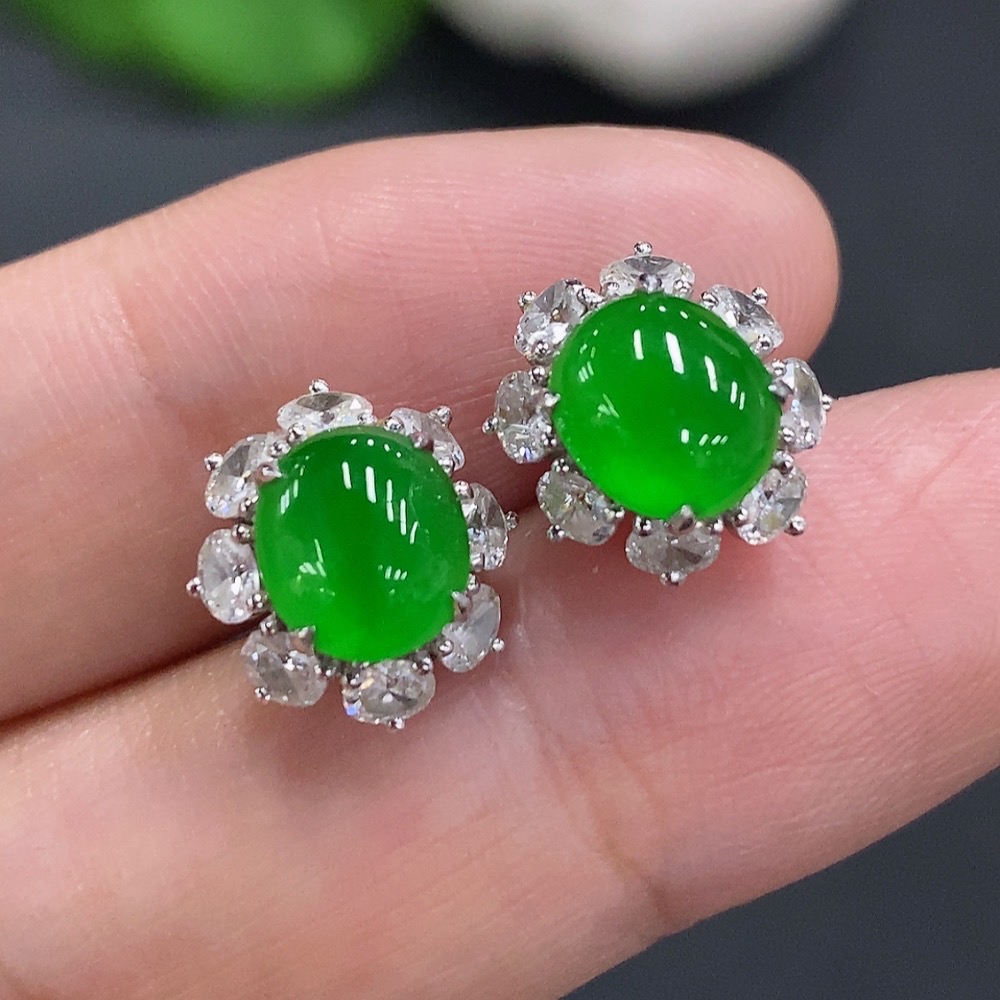 Jadeite Cabochon Stud Earrings (71% gold content in ear posts, balance 18K gold) Approx. 3.5g total weight (with diamonds)