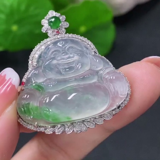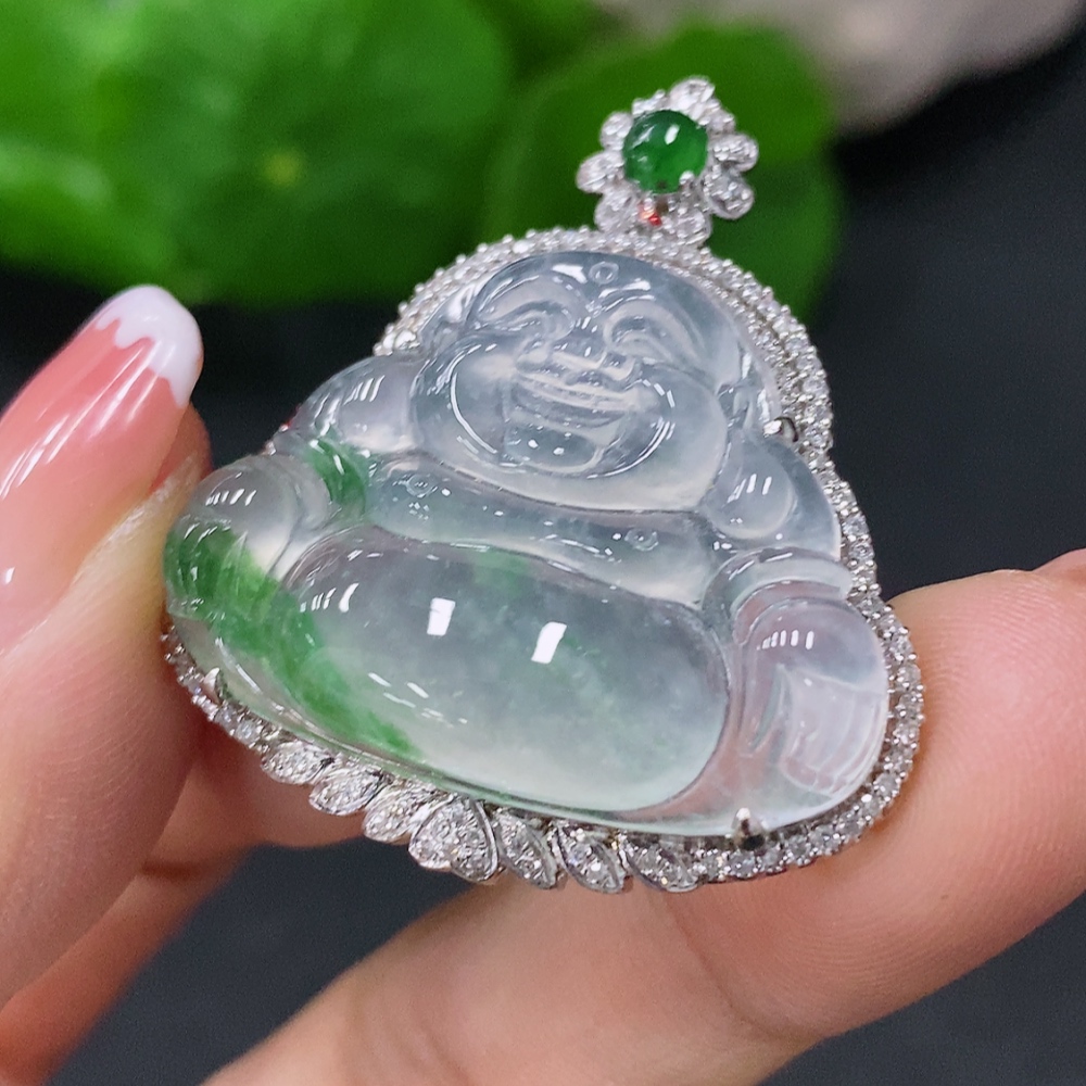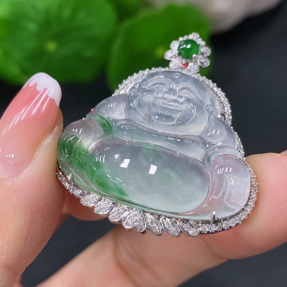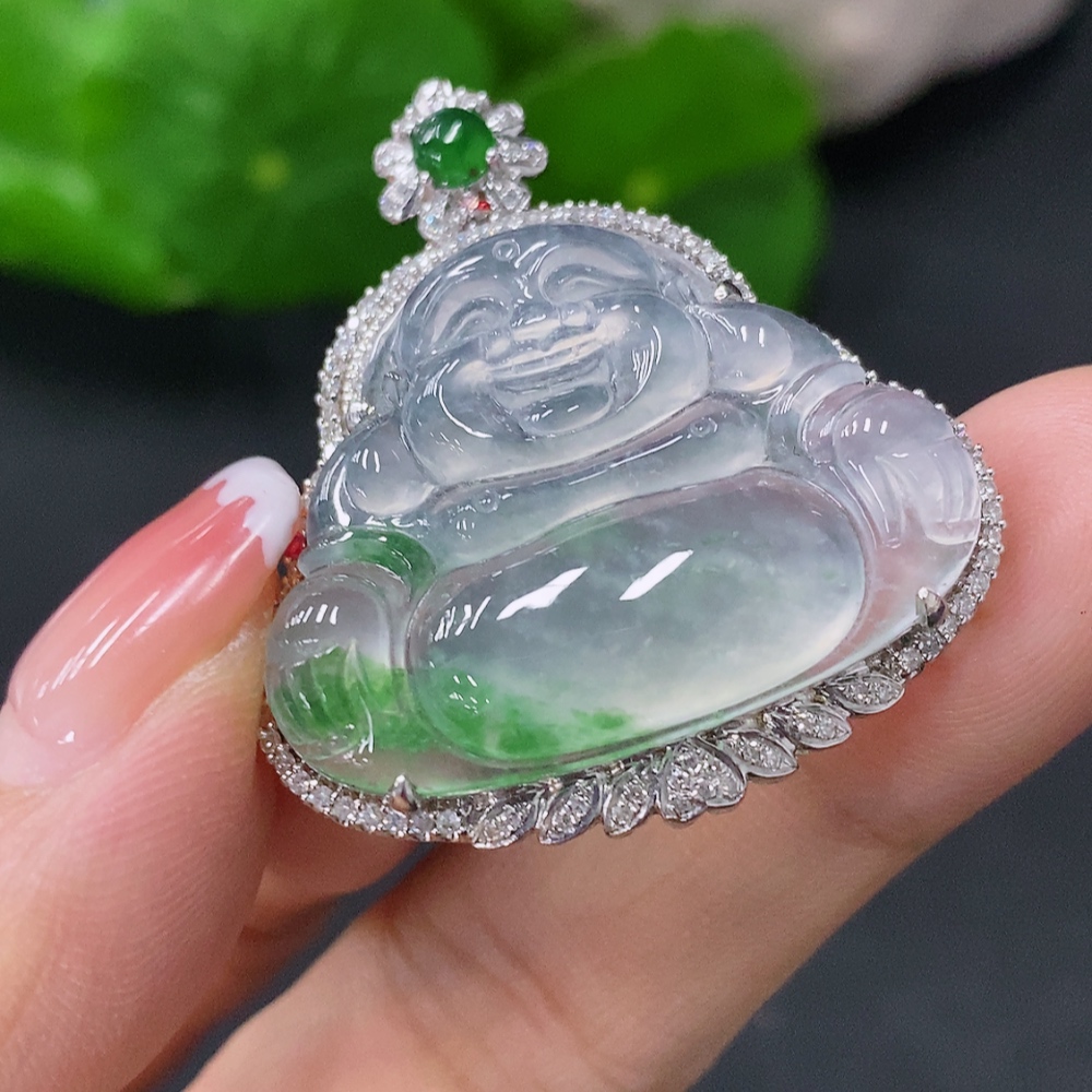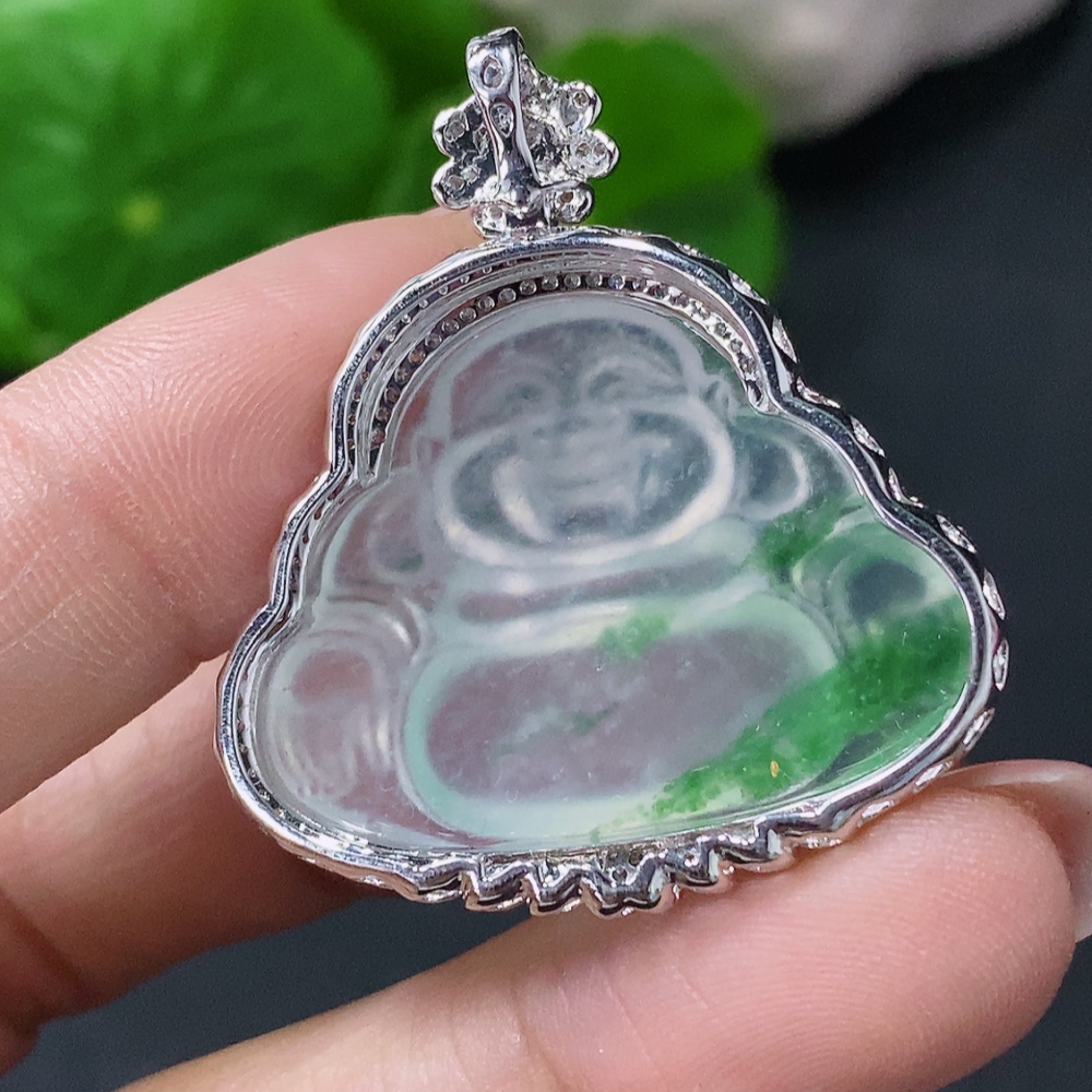 Jadeite Inlaid Buddha Pendant 18k Marked in Red for Uncertain Natural Origin Total Weight Approx. 8.5g