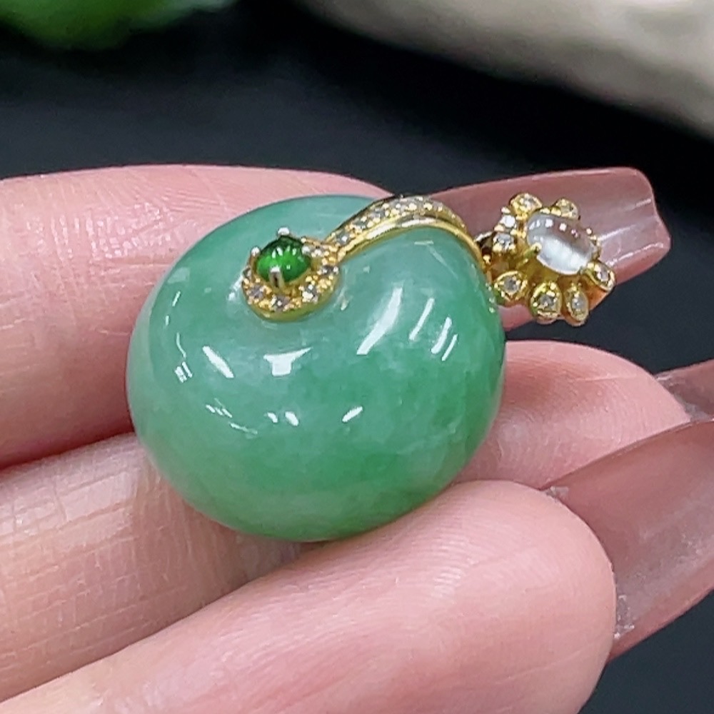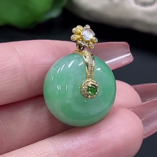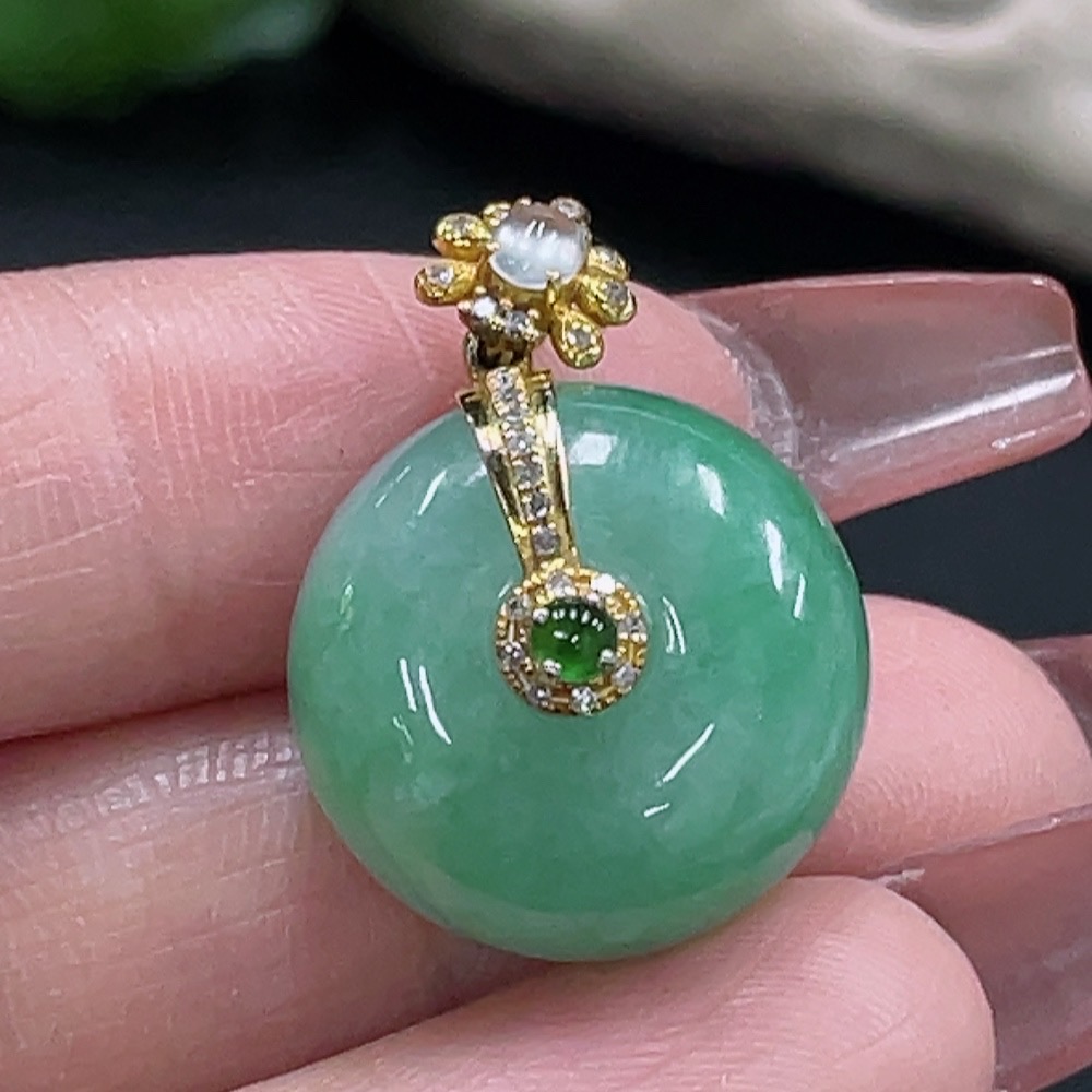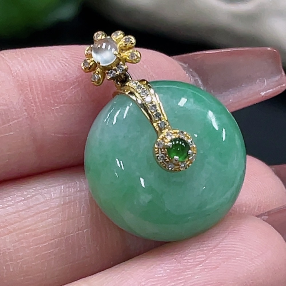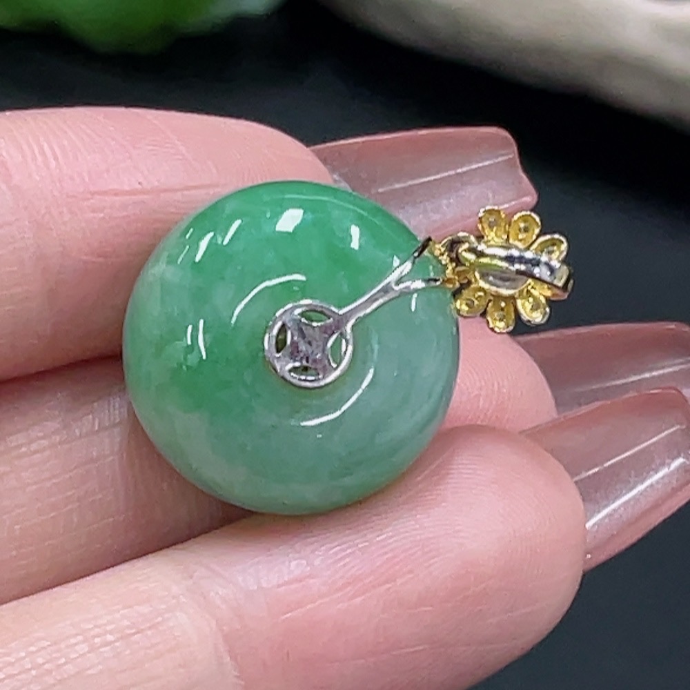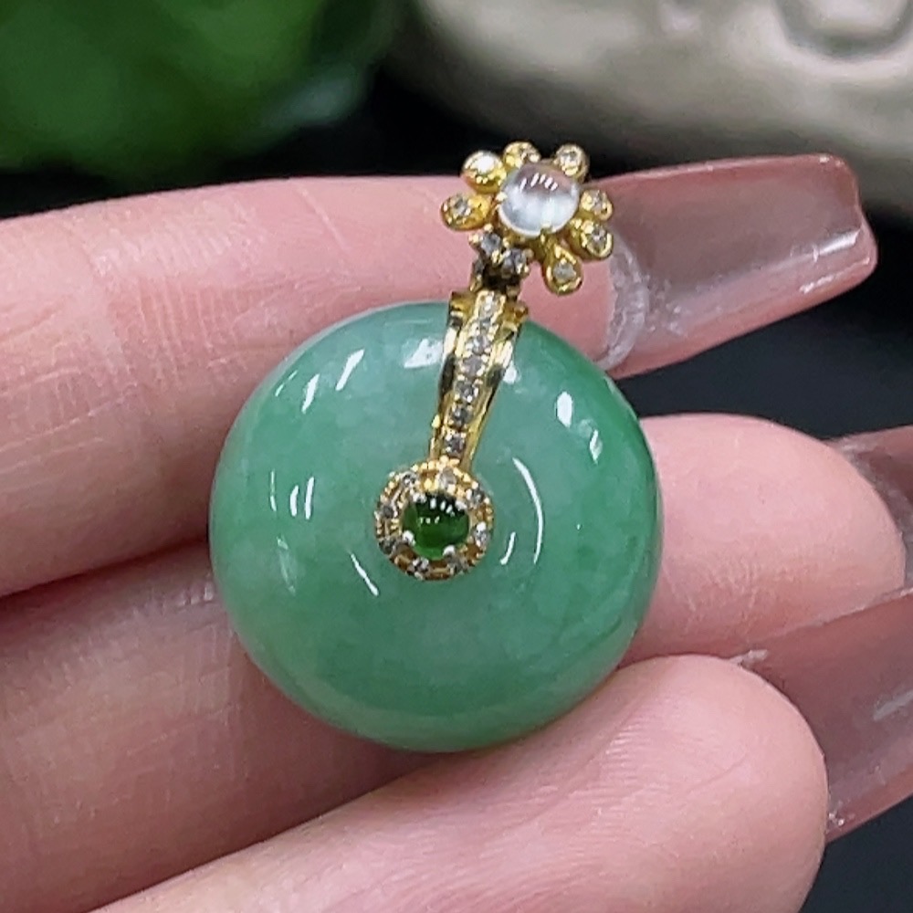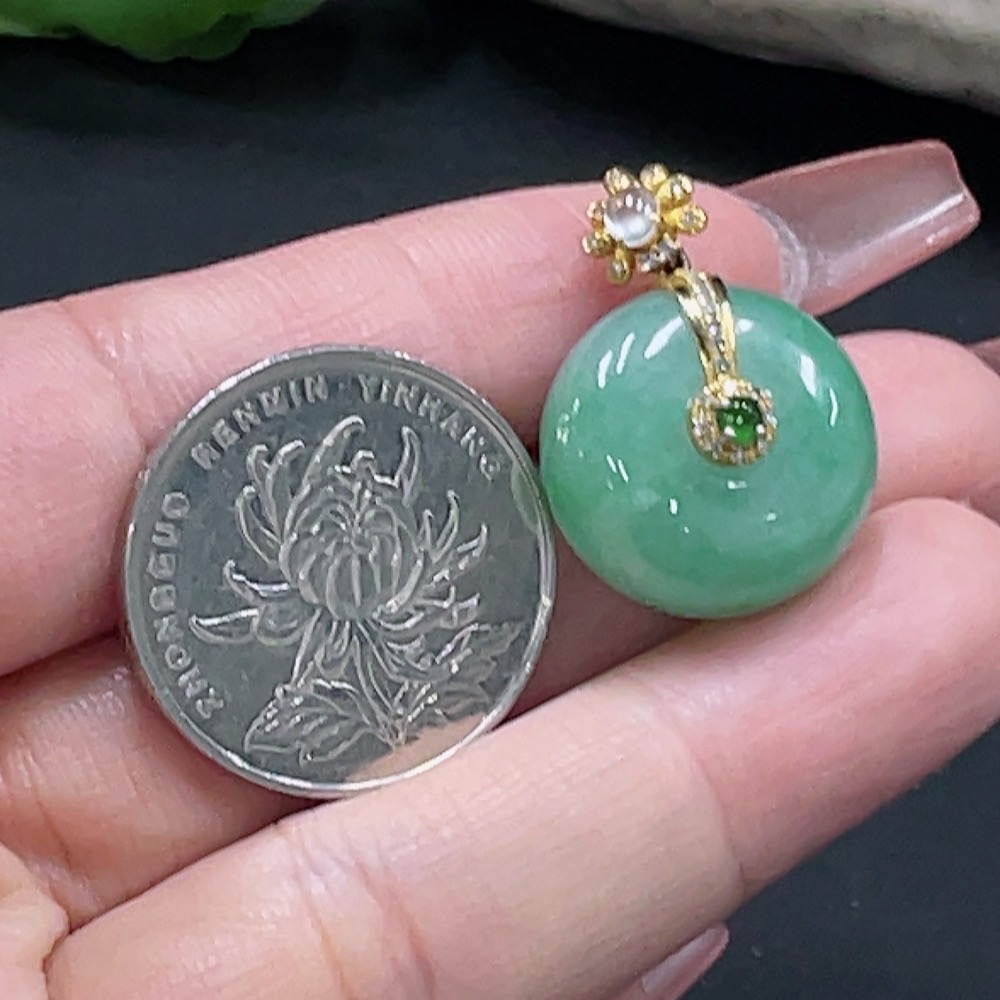 JadeitePeace Button Pendant with 18K Gold and Diamond Accents, Total Weight Approx. 8.99g