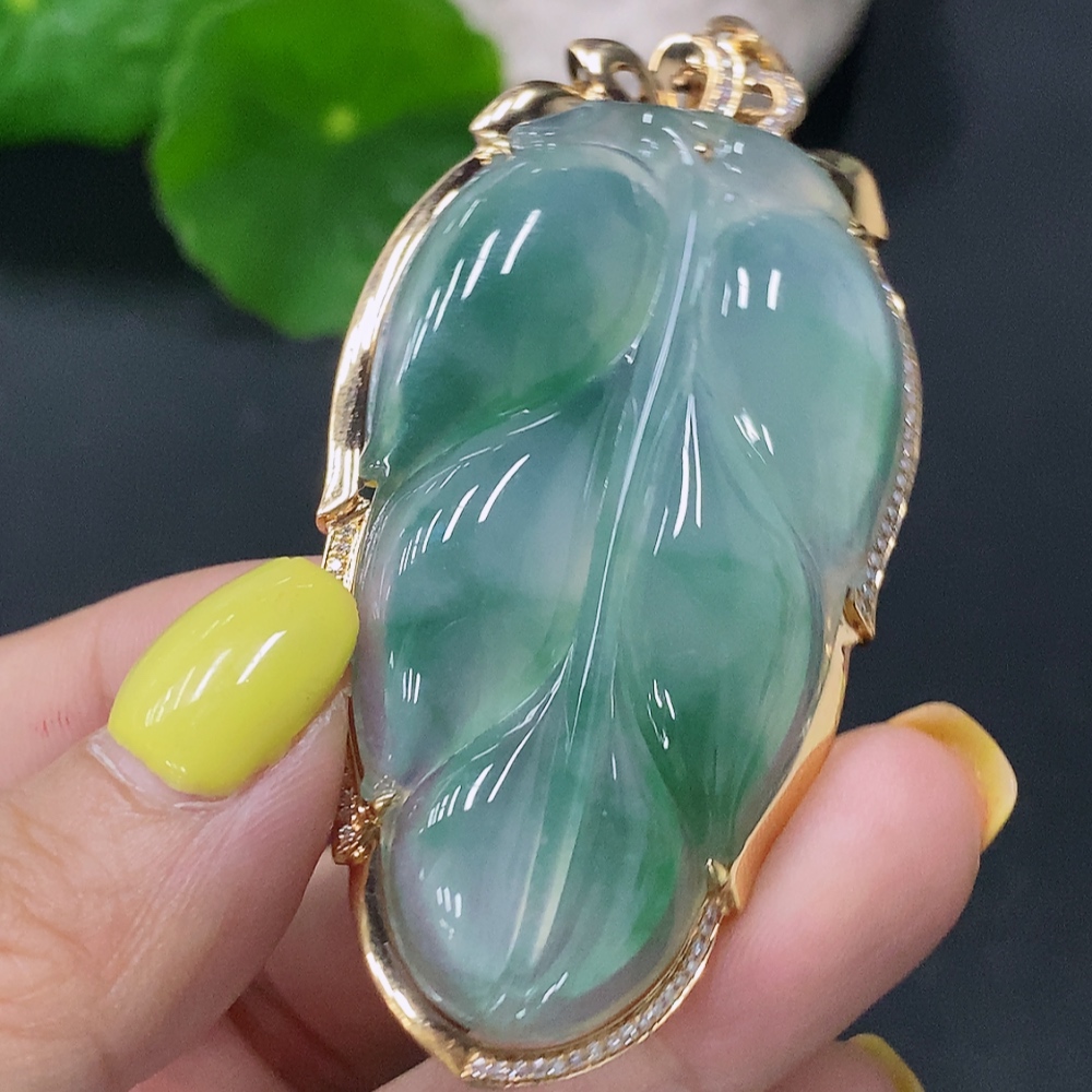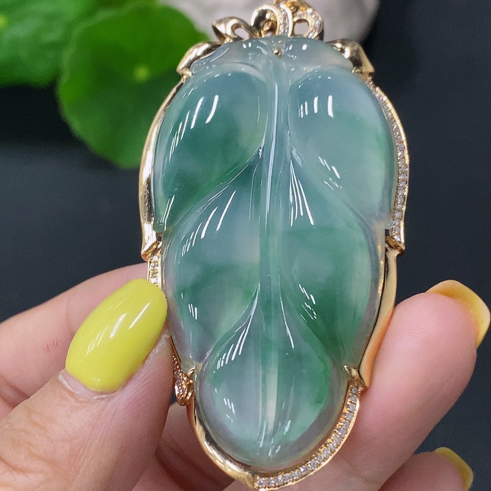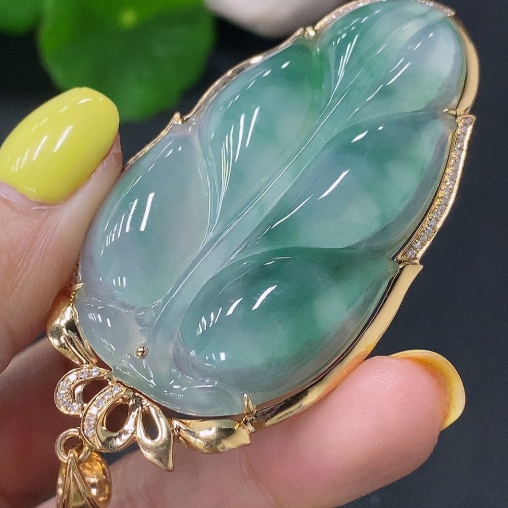 Jadeite Leaf Pendant with 18K Gold and Diamond Accents, Total Weight Approximately 21.53g