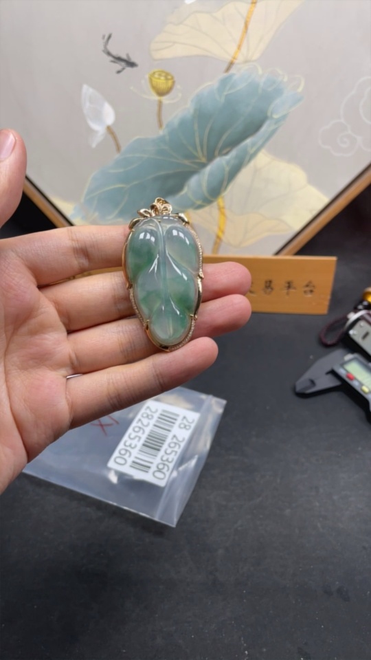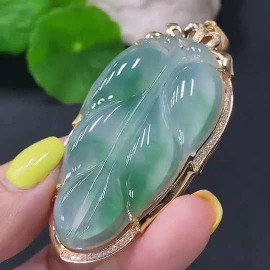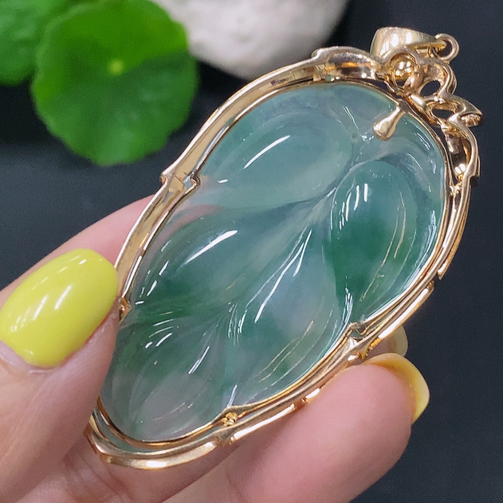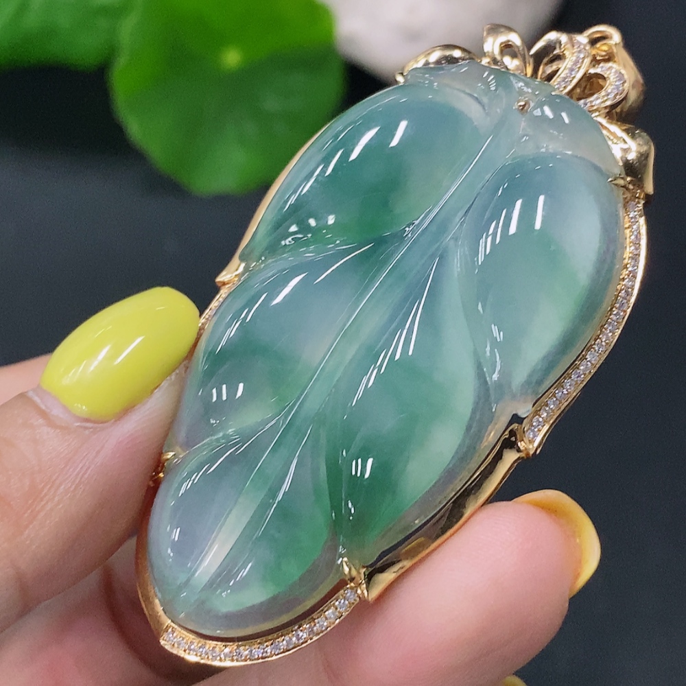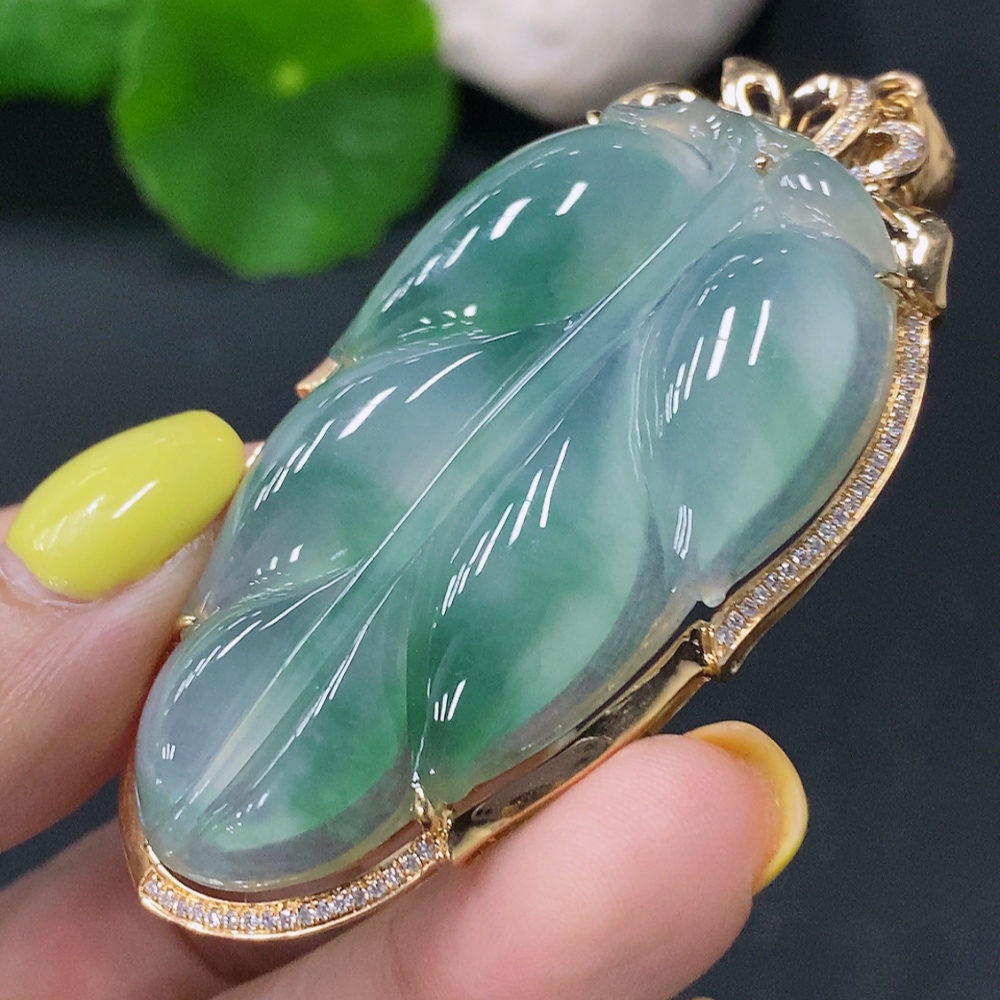Jadeite Leaf Pendant with 18K Gold and Diamond Accents, Total Weight Approximately 21.53g