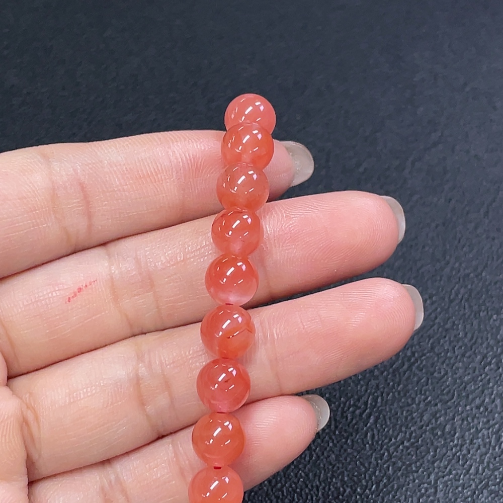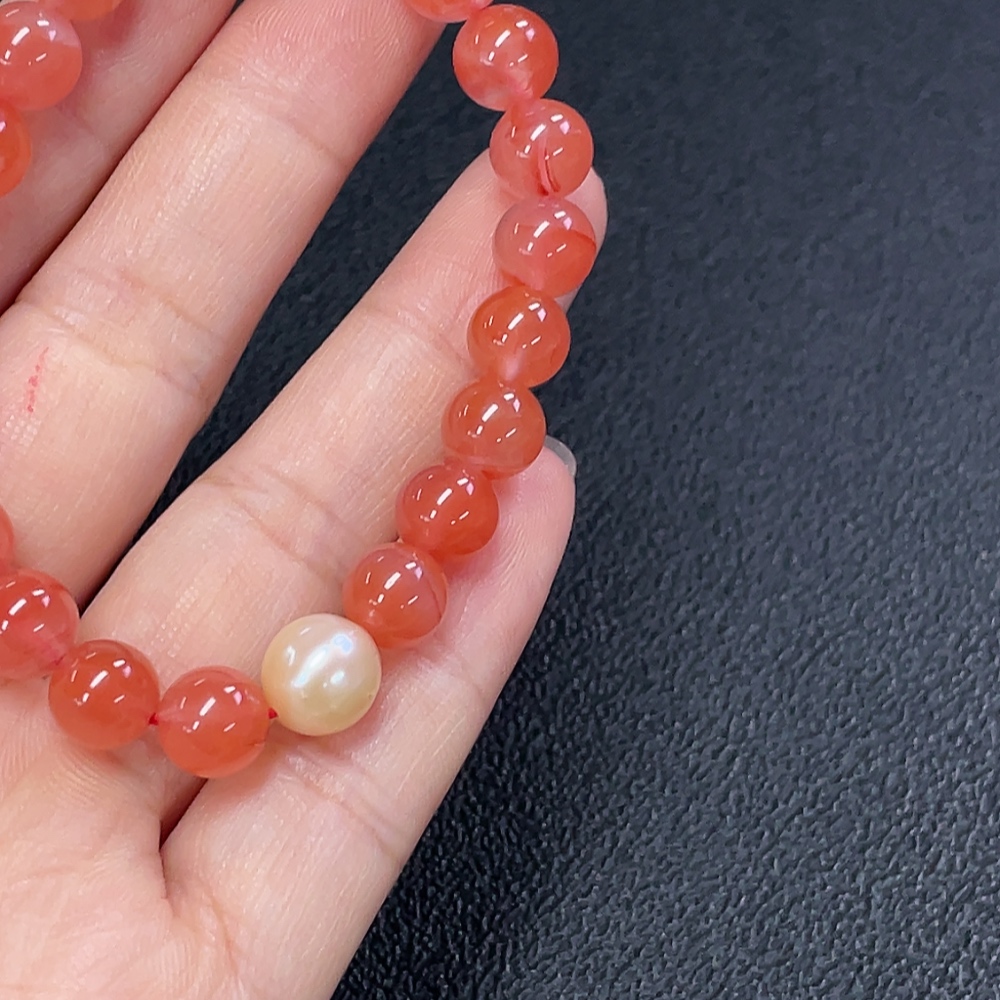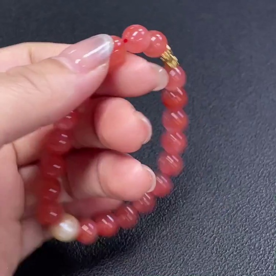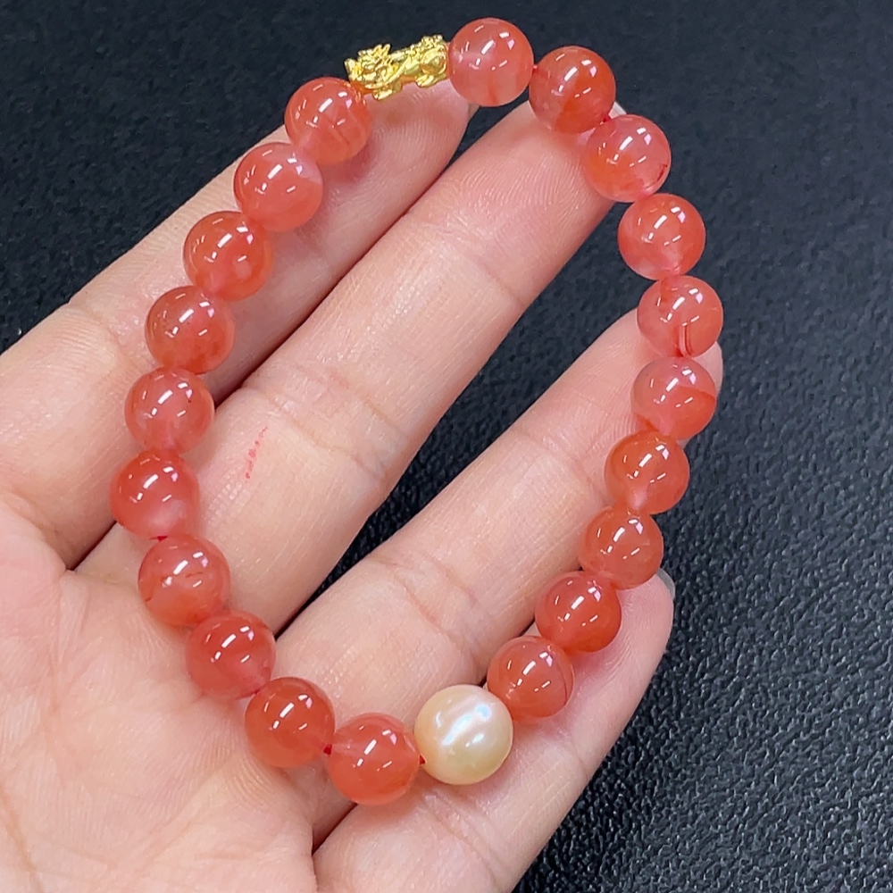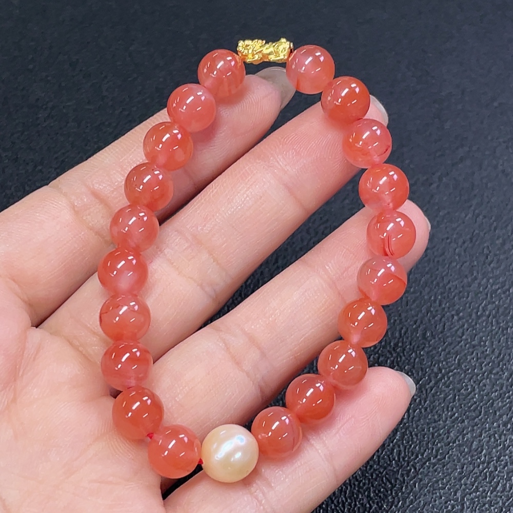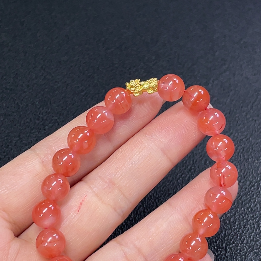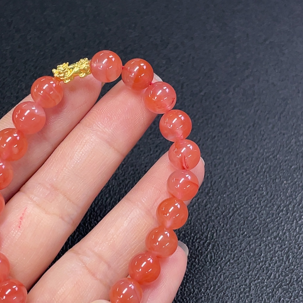 Red Agate Bracelet with Visible Organic Matter, Set with Non-Natural Stones Containing 99% Gold, Total Weight Approx. 15.92g, Bead Size 7.9mm