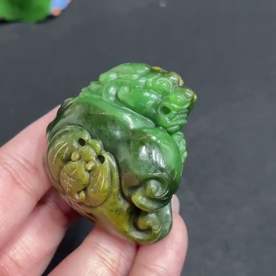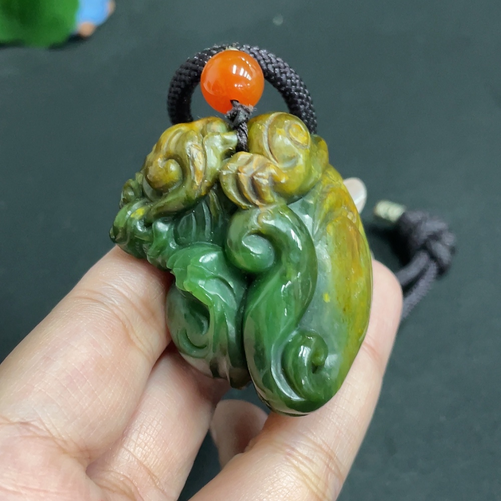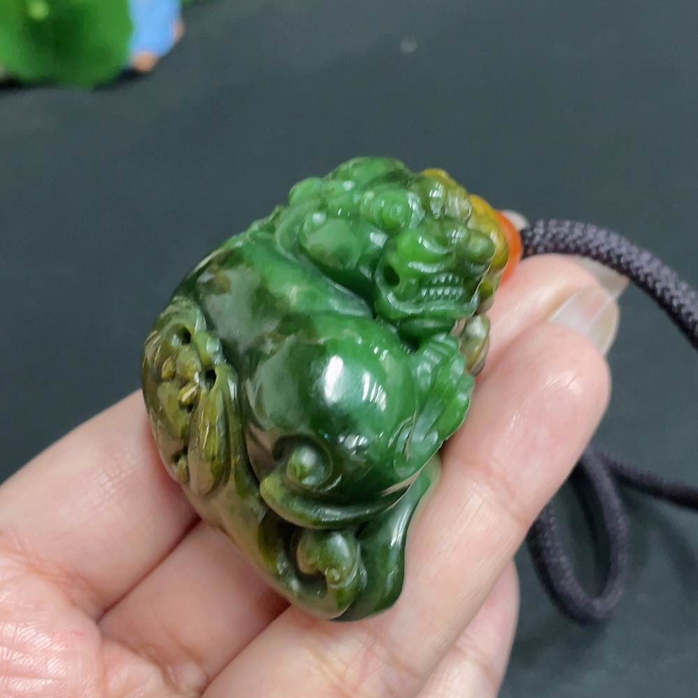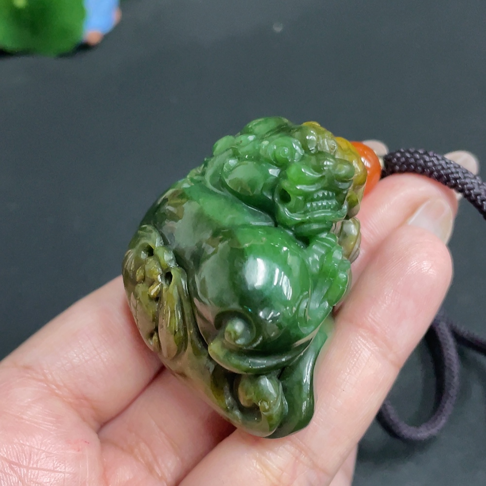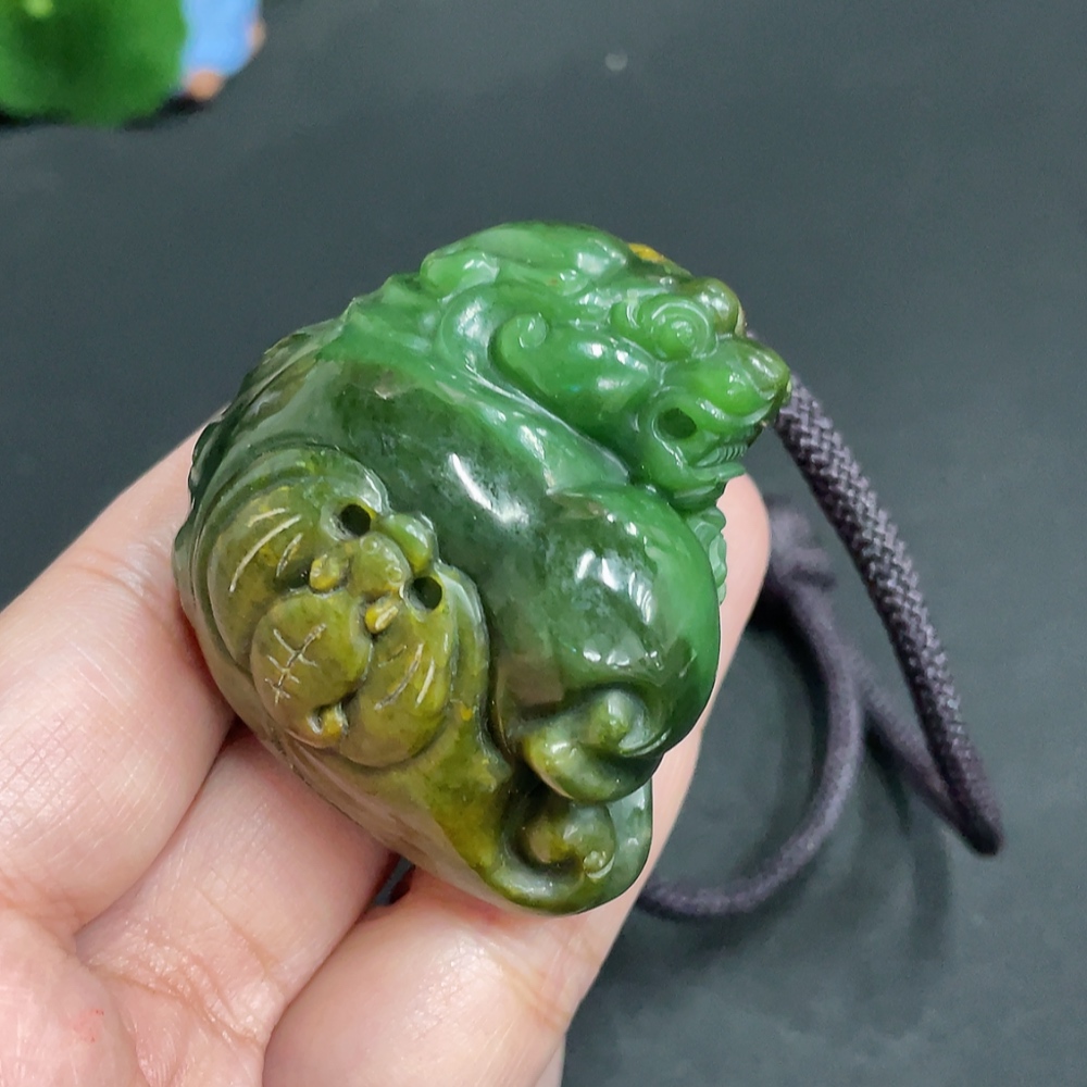 Hetian Jade Handheld Carving - Auspicious Beast, Undetermined Skin Color Origin, Beads Not Hetian Jade, Total Weight Approx. 93.7g (incl. Cord)