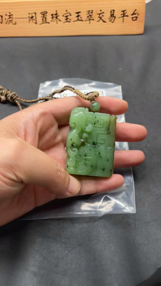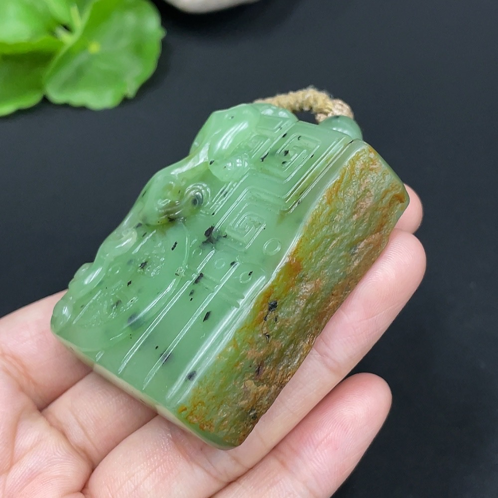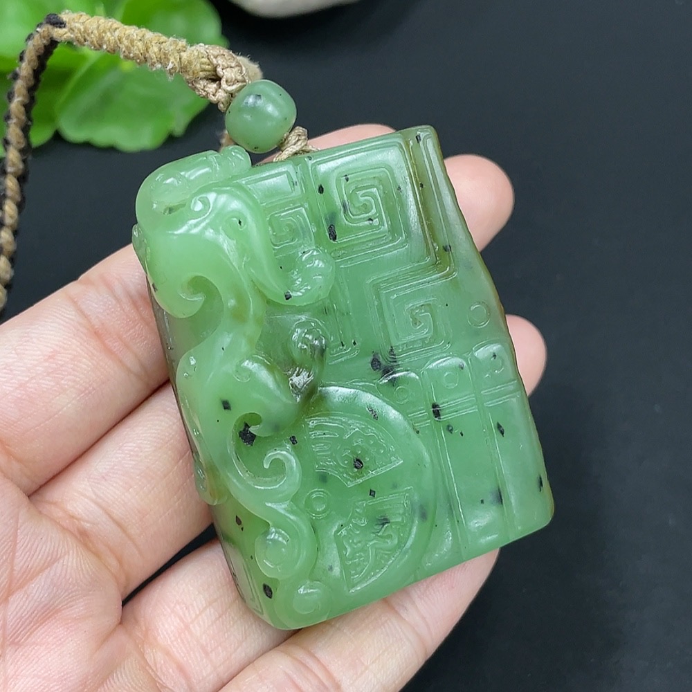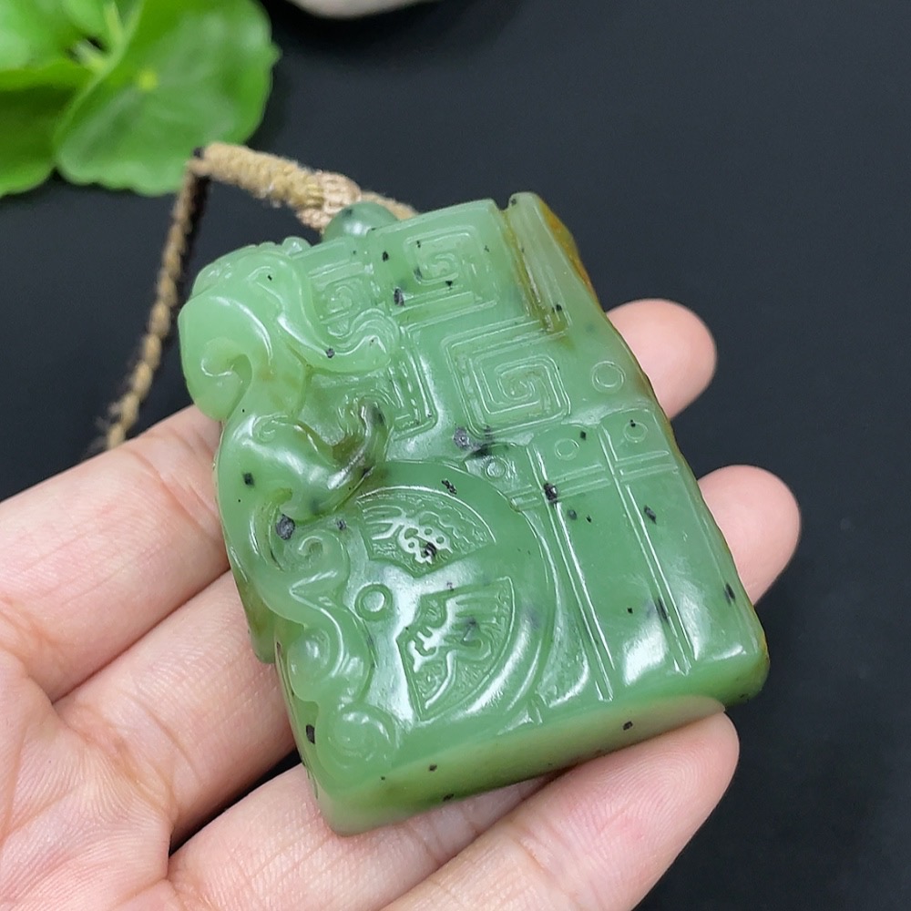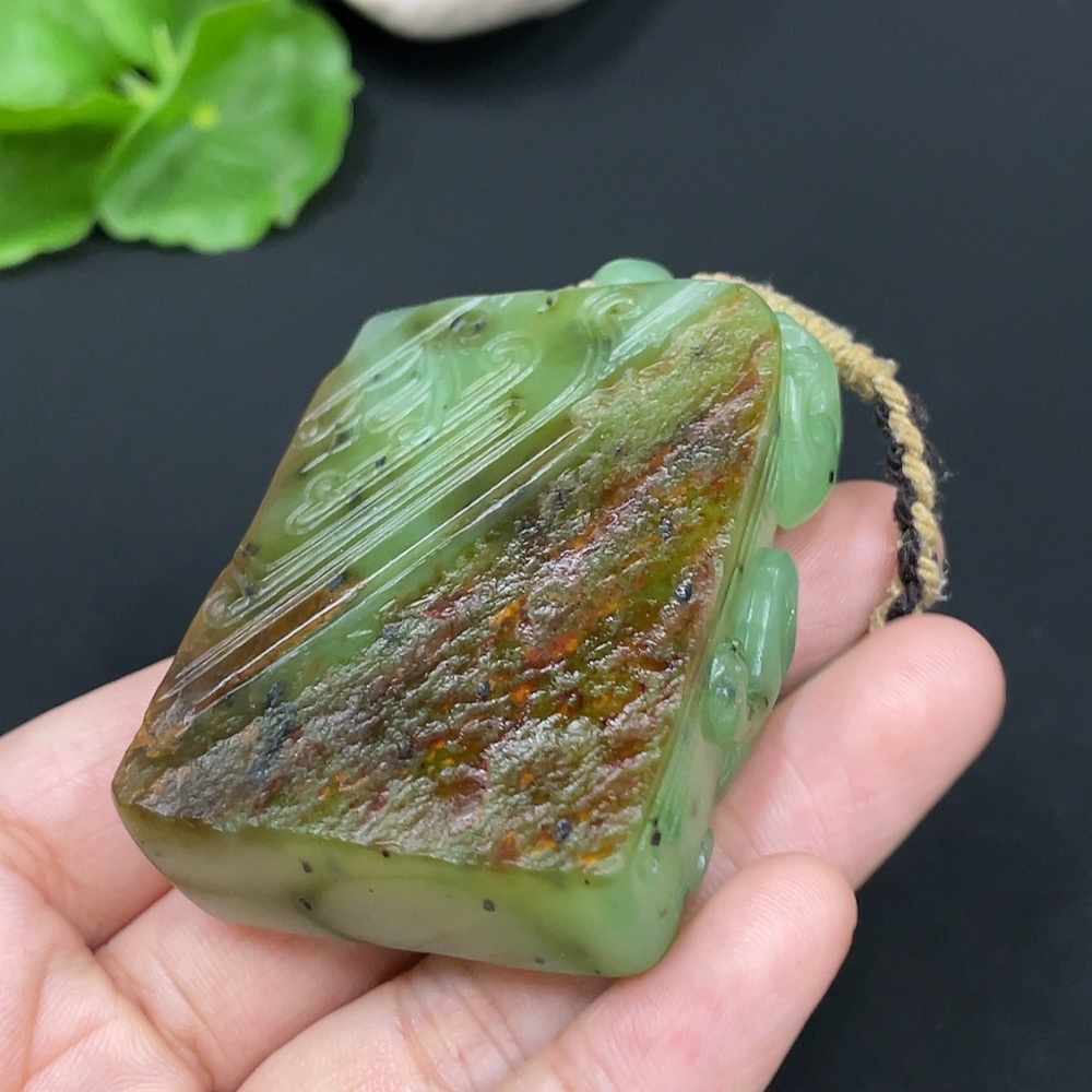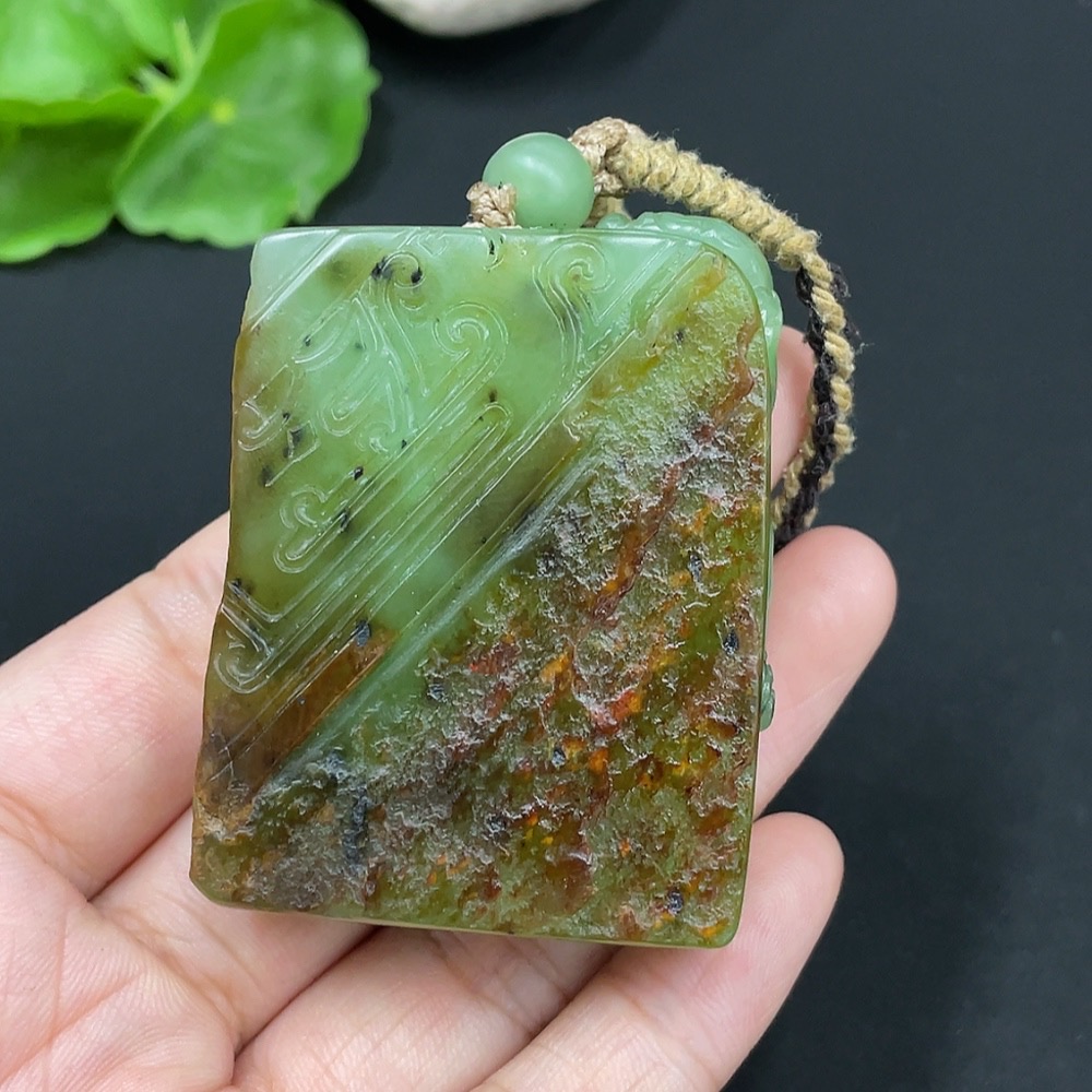 Hetian Jade Pendant - Antique-style Plaque with Undetermined Skin Color Cause, Total Weight (Including Cord): Approximately 91.9g